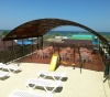 На территории Аквапарка находятся 3 бассейна на любой вкус, детский с водными тематическими горками и фонтанами, взрослые бассейны включая экстремальный спуск для любителей острых ощущений.