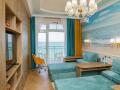 Плюсы: просторные апартаменты, прямой выход на большую террасу с видом на море прямо из номера, есть все необходимое, включая посуду, полотенца, телевизор и кондиционер. Рядом два пляжа, городской и березка (пара остановок на маршрутке). Большая двуспальная кровать, есть стиральная машина, утюг, гладильная доска, фен.
