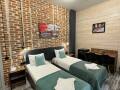 Номер замечательный: просторная удобная кровать, большой телевизор, вместительный холодильник, много открытых полок для вещей, а также стол и стулья. Интерьер в стиле лофт, и поддерживается идеальная чистота. Особенно хочется отметить приветливый и внимательный персонал, который охотно отвечал на все наши вопросы, помог настроить телевизор и порекомендовал отличные заведения с вкусной кухней!
