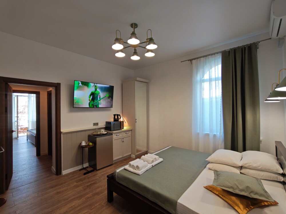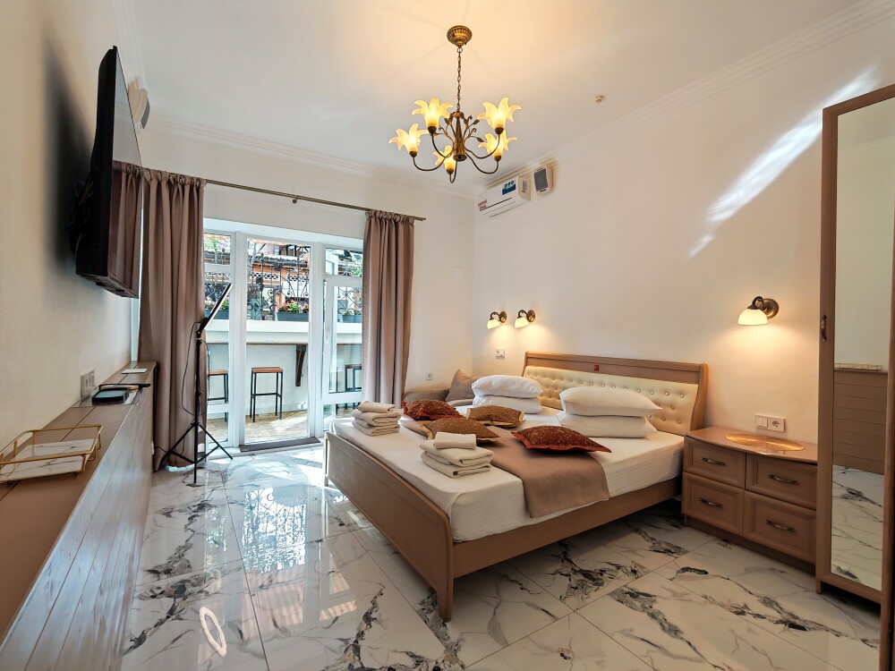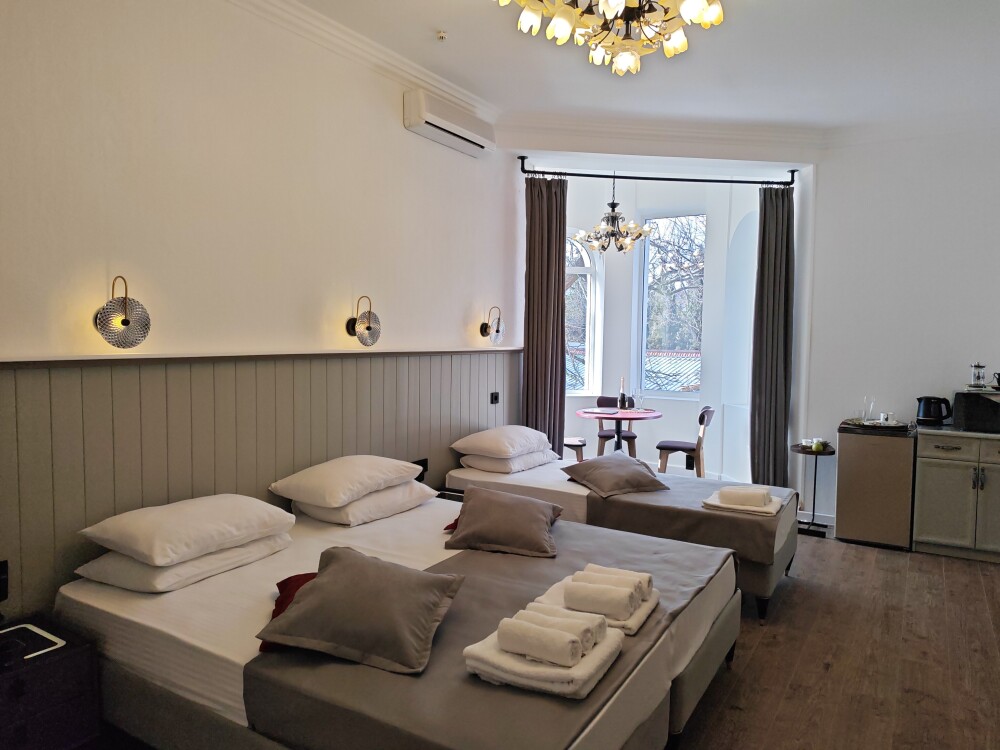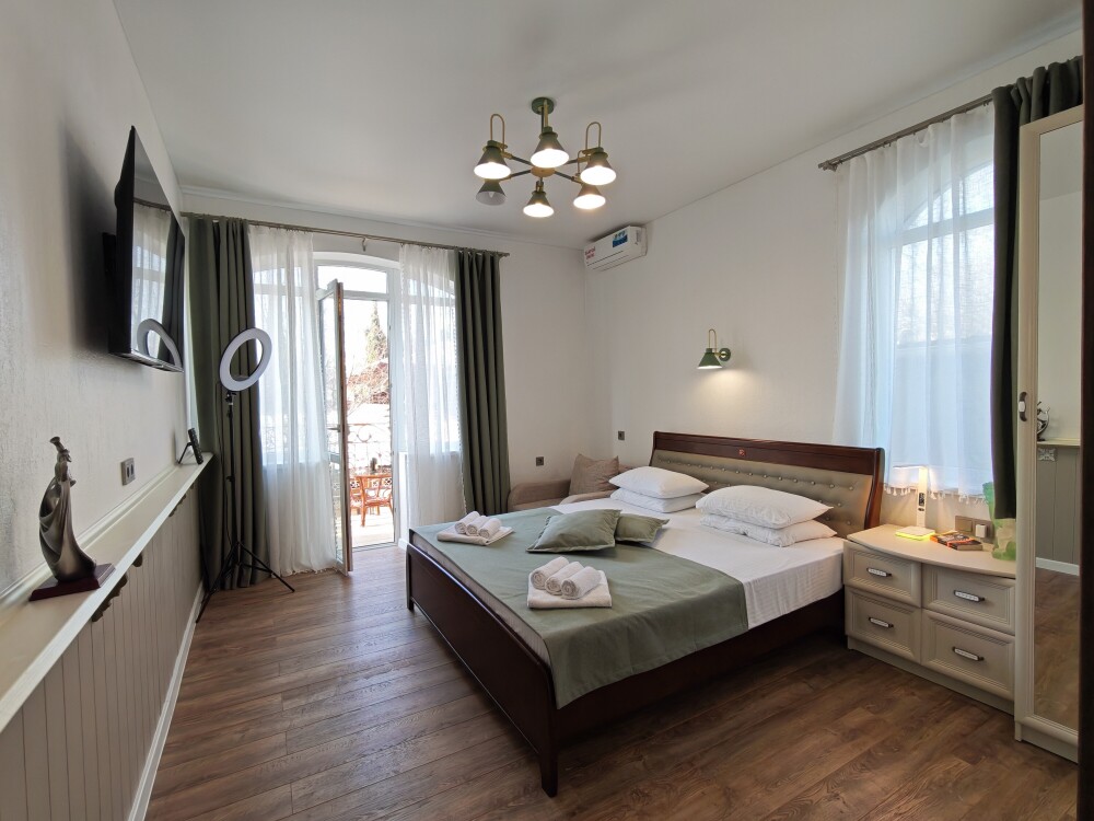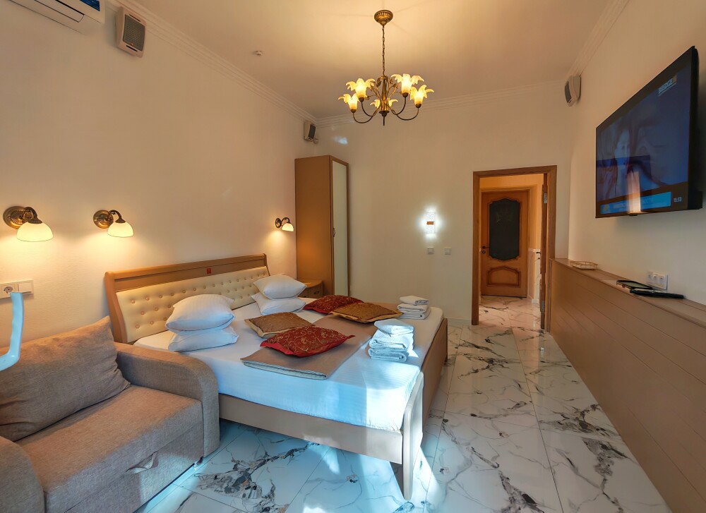 Трехместный номер. Огромная кровать 2400/2500 и спальное место-достархан с прекрасным видом на Кипарисовую аллею.