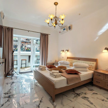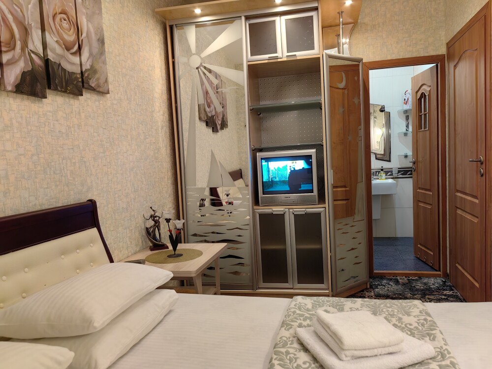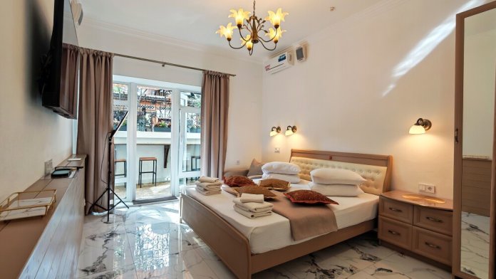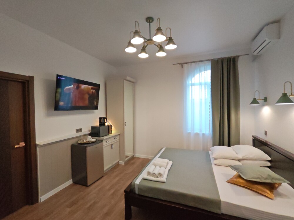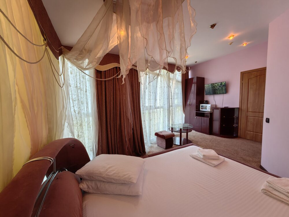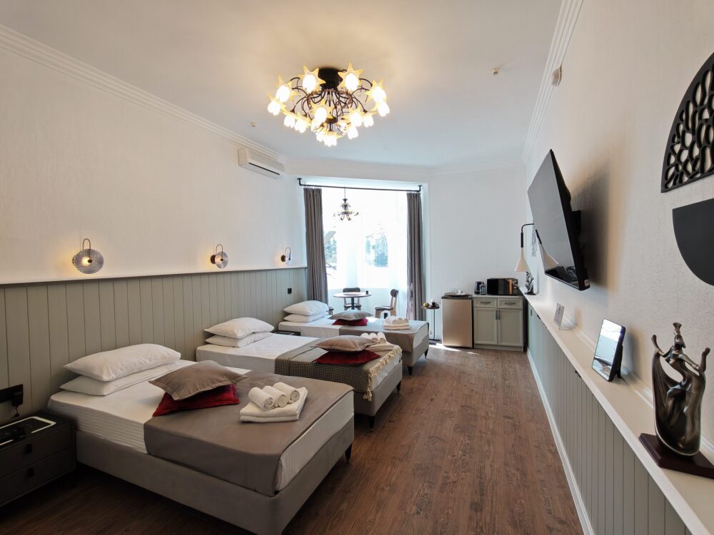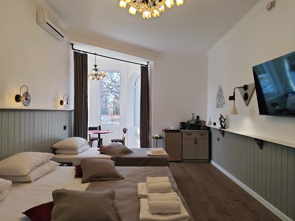 Трехместный номер. Огромная кровать 2400/2500 и спальное место-достархан с прекрасным видом на Кипарисовую аллею.