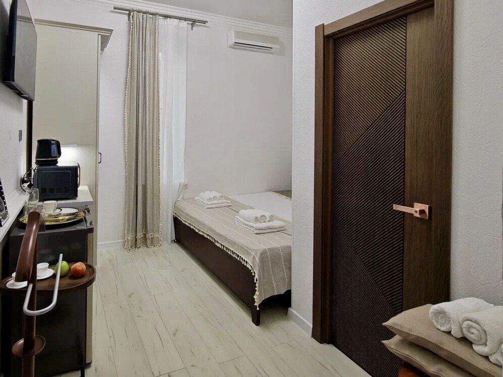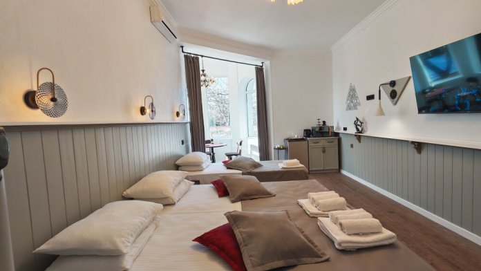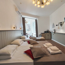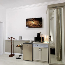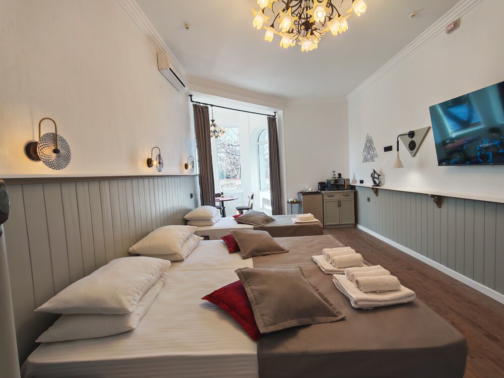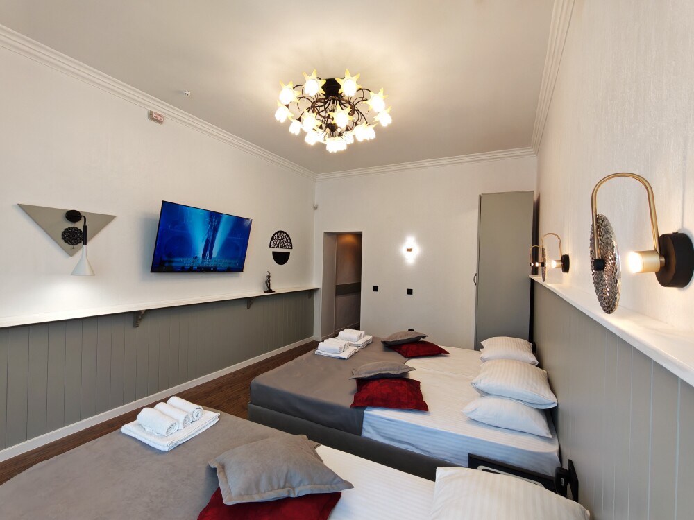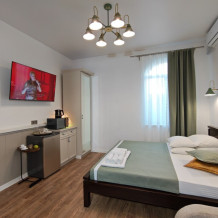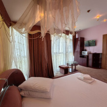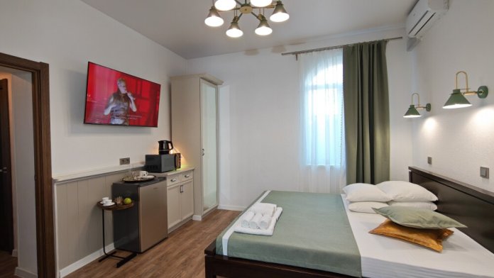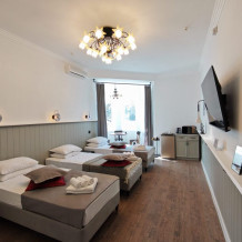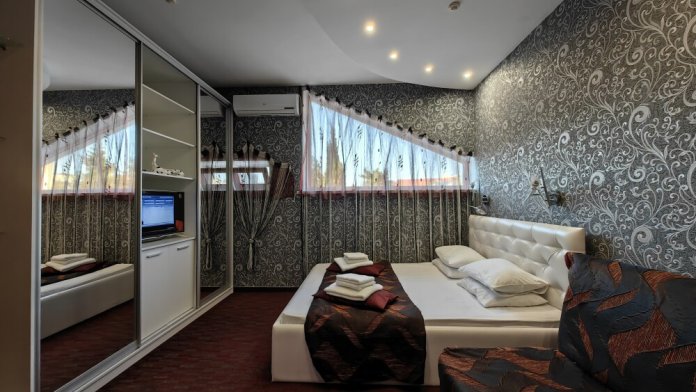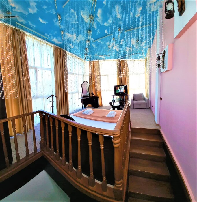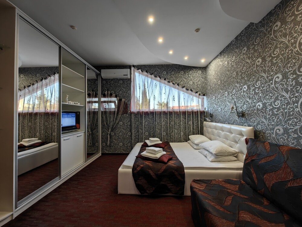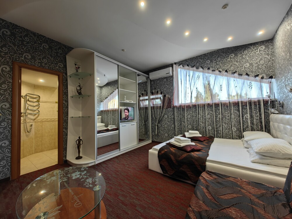 Двухкомнатный четырехместный номер. Своя личная зона отдыха, два входа в номер. Стереосистема звука в каждой комнате.