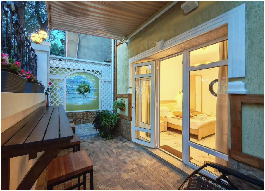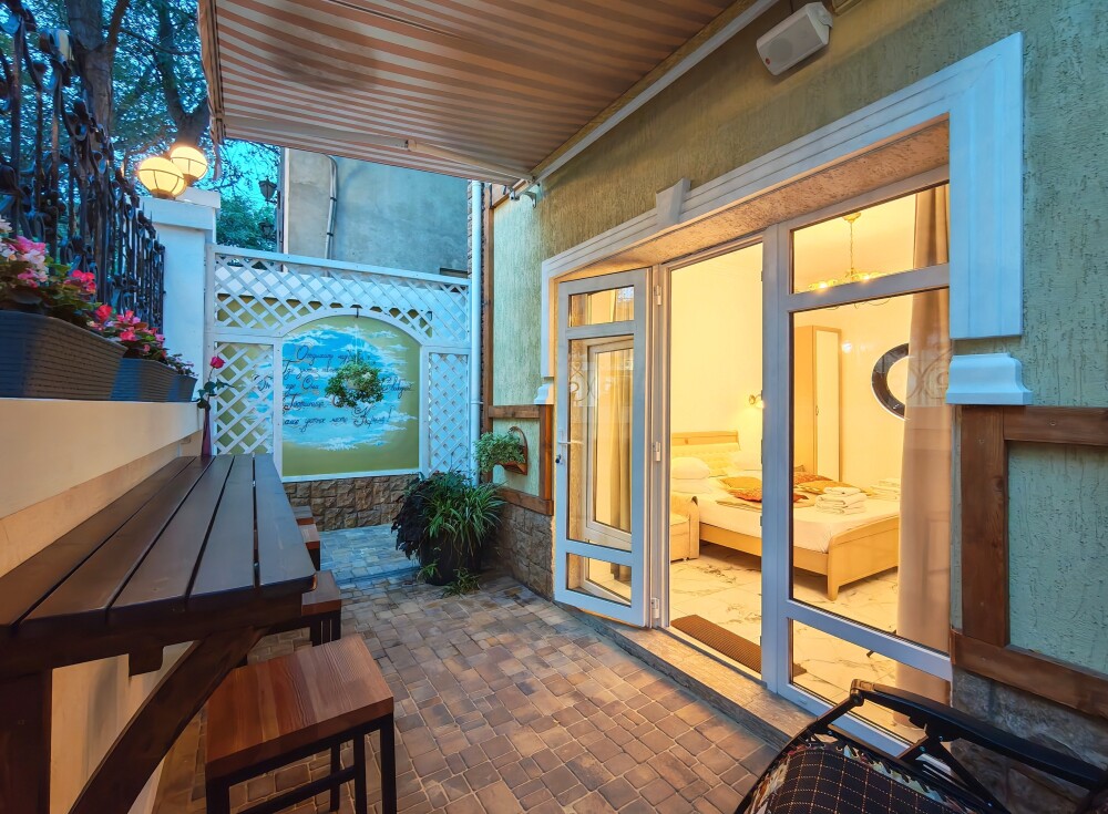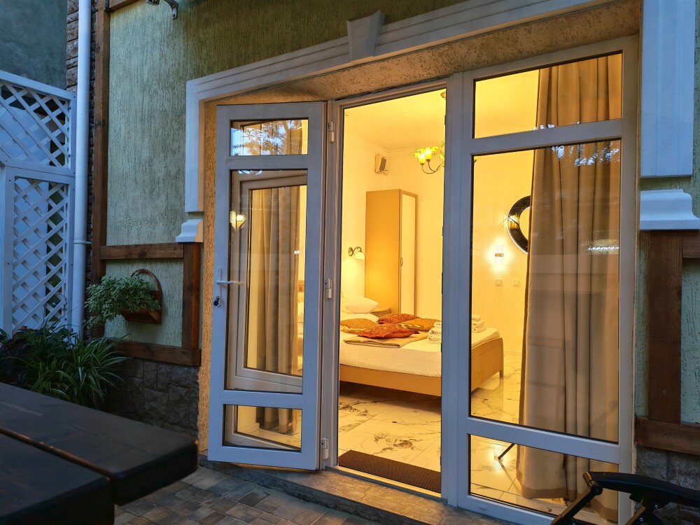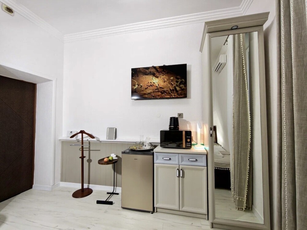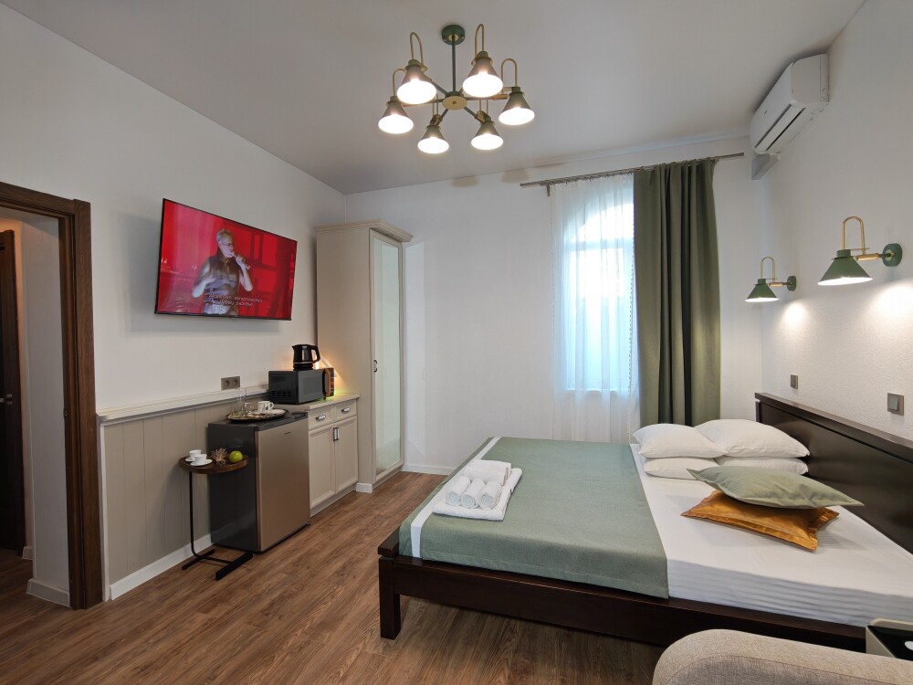 Внутренняя обстановка всей гостиницы - приятно удивит даже самых взыскательных клиентов. Особого внимания заслуживает оригинальный дизайн номеров, номеров класса «люкс». Интерьер в каждом номере подобран индивидуально – в гостинице нет номеров с одинаковым повторяющемся интерьером. И каждый из них – это произведение дизайнерского искусства. Помимо, эстетических качеств, номера гостиницы отличаются замечательной технической оснащённостью. В номерах есть: телевизор, холодильник, кабельное телевидение, микроволновая печь, электрочайник, сплит-системы, а так же санузел (душевая кабинка), и панорамные окна (звуконепроницаемые стеклопакеты). Из окон гостиницы открывается незабываемый вид , клиенты могут любоваться Кипарисовой аллеей, и Генуэзской крепостью Судака.