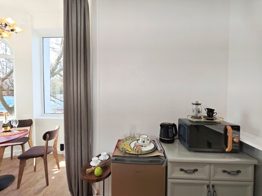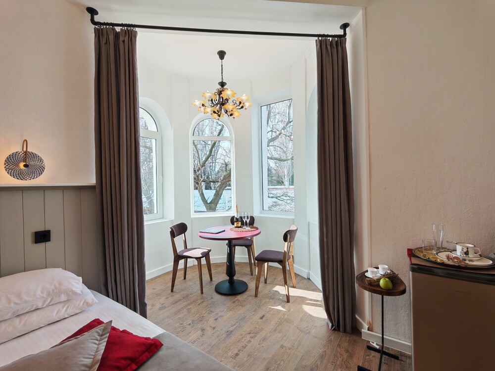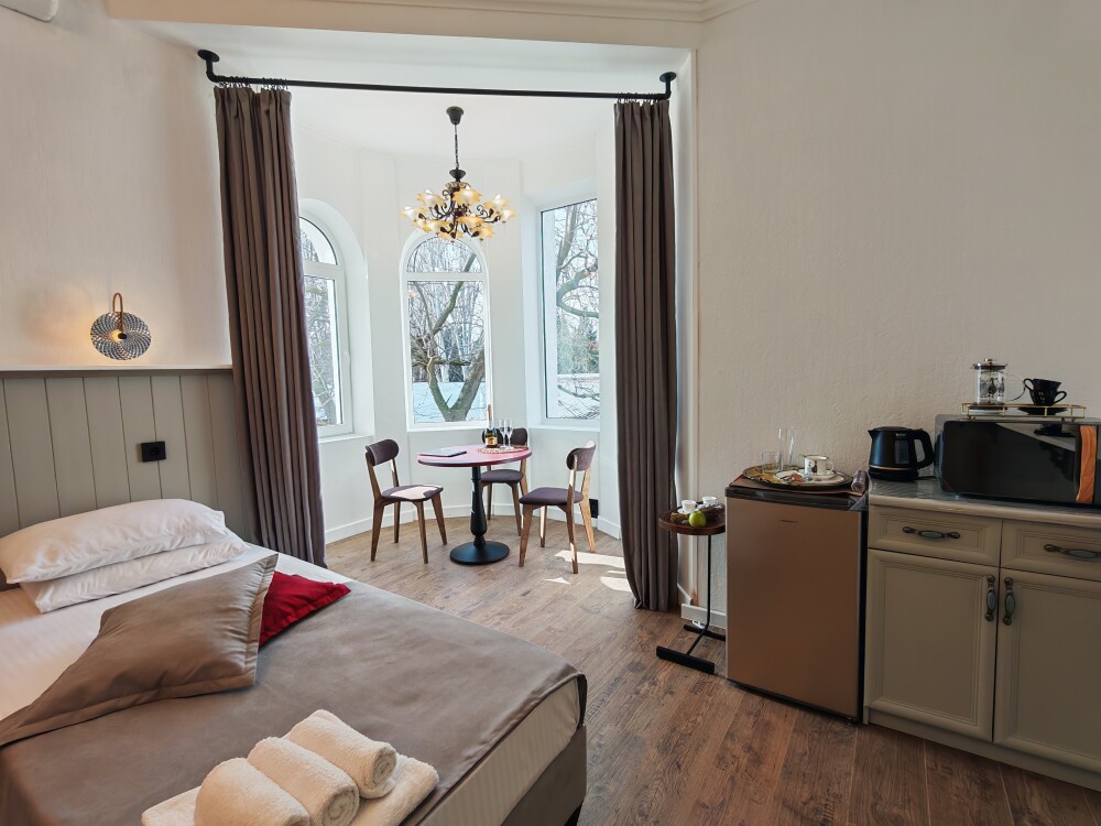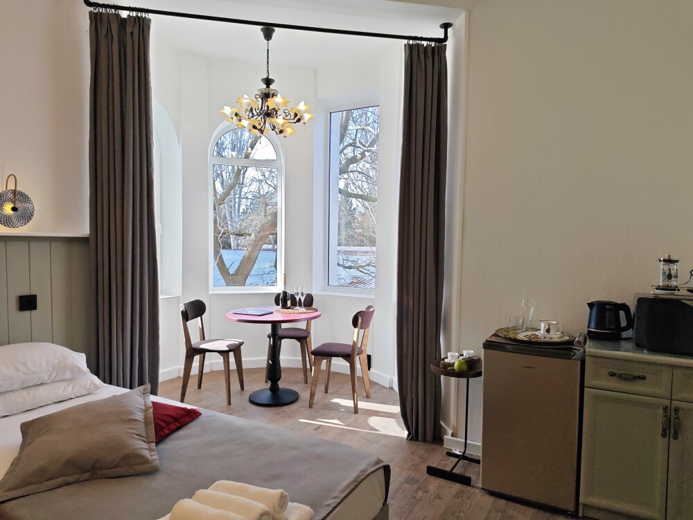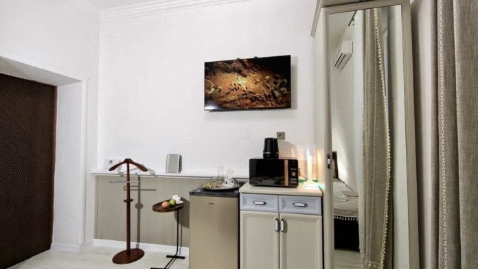 Внутренняя обстановка всей гостиницы - приятно удивит даже самых взыскательных клиентов. Особого внимания заслуживает оригинальный дизайн номеров, номеров класса «люкс». Интерьер в каждом номере подобран индивидуально – в гостинице нет номеров с одинаковым повторяющемся интерьером. И каждый из них – это произведение дизайнерского искусства. Помимо, эстетических качеств, номера гостиницы отличаются замечательной технической оснащённостью. В номерах есть: телевизор, холодильник, кабельное телевидение, микроволновая печь, электрочайник, сплит-системы, а так же санузел (душевая кабинка), и панорамные окна (звуконепроницаемые стеклопакеты). Из окон гостиницы открывается незабываемый вид , клиенты могут любоваться Кипарисовой аллеей, и Генуэзской крепостью Судака.