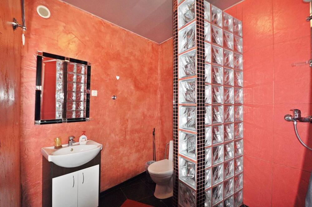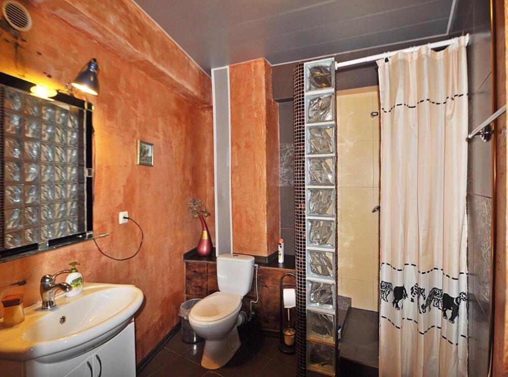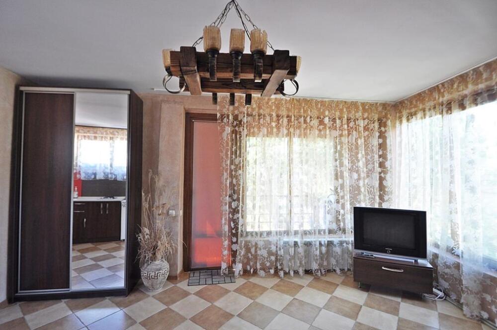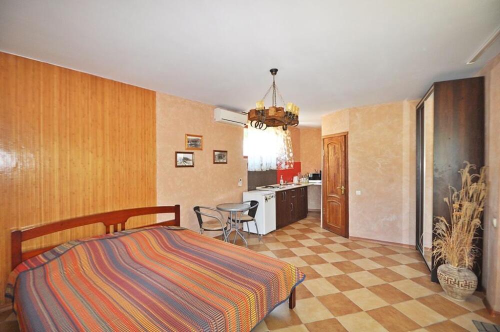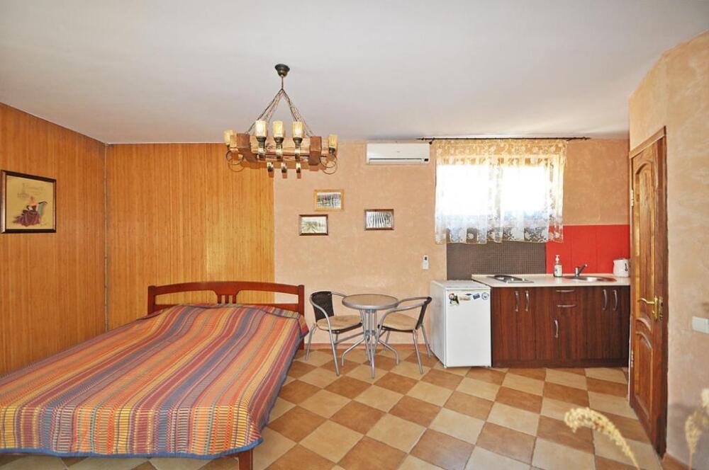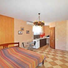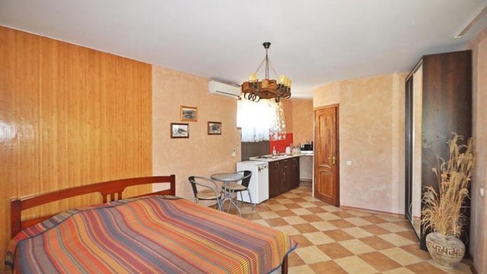 - Номер-студия с панорамной террасой на третьем этаже: комната с маленькой кухней площадью 25 кв. м + санузел (туалет, раковина, душевая кабина).