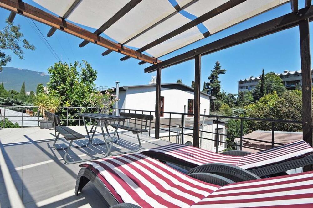 На крыше панорамная терраса с местами для отдыха-стол, скамейки, лежаки с матрасами. Панорамной террасой на крыше пользуются только жильцы номера на третьем этаже.