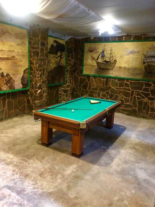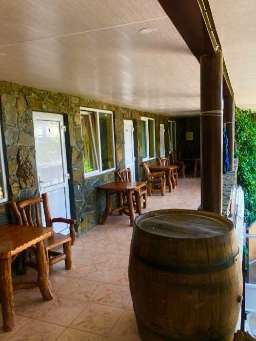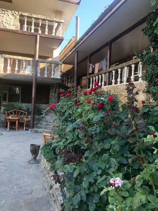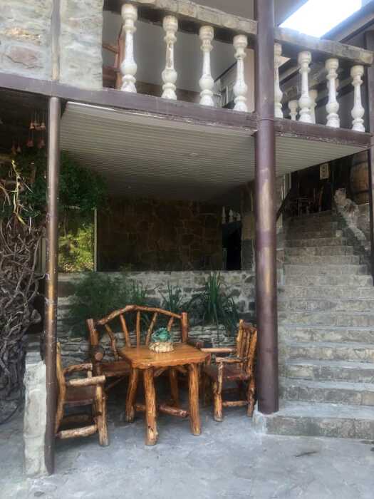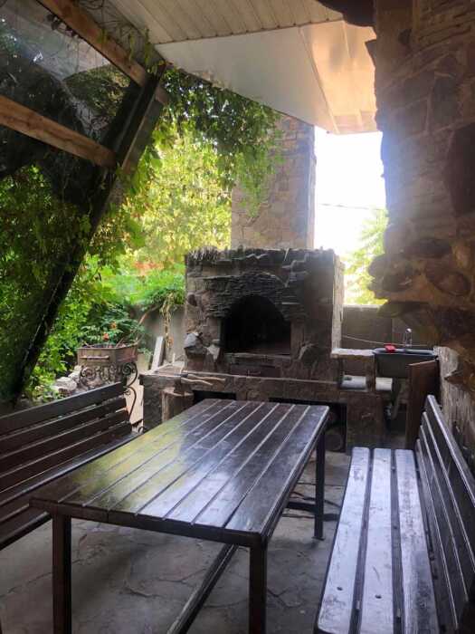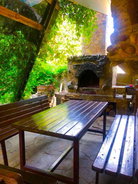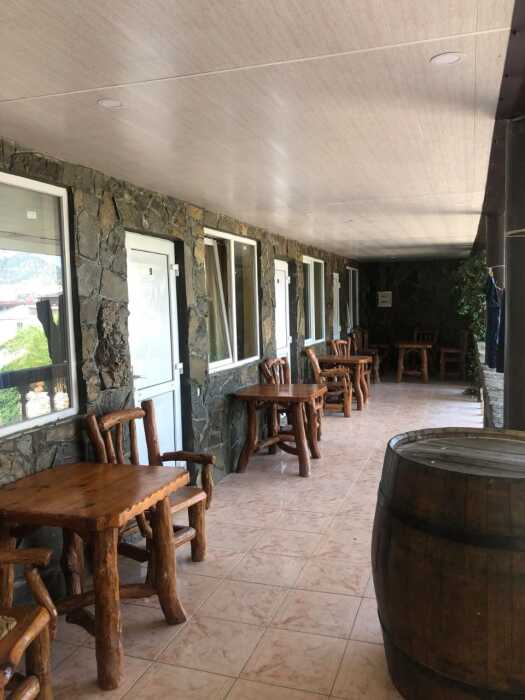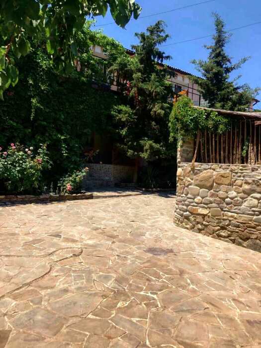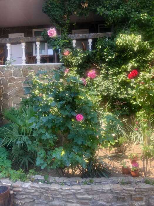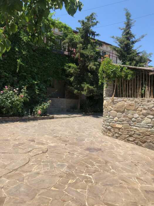 Зелёный, уютный дворик с беседками, открытыми верандами, террасами, мангалами, баром с видом на гору Святого Георгия, залом для бильярда. Бесплатная стоянка, Wi-Fi интернет, прачечная. Общая кухня: газовые плиты, посуда.
