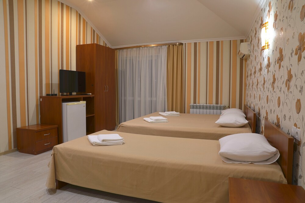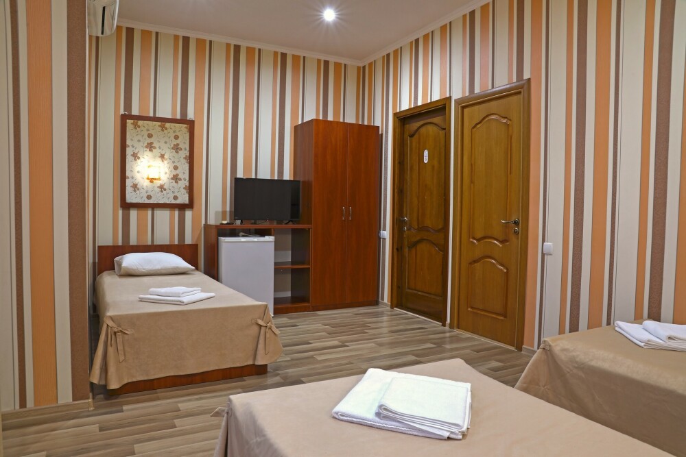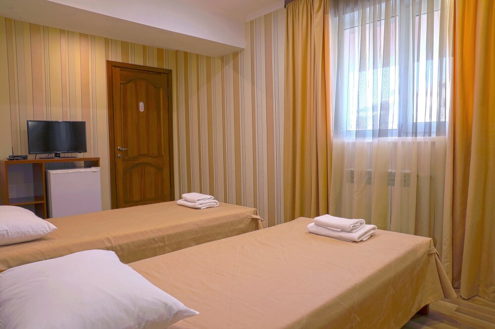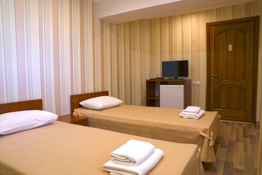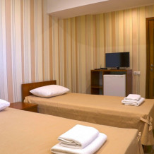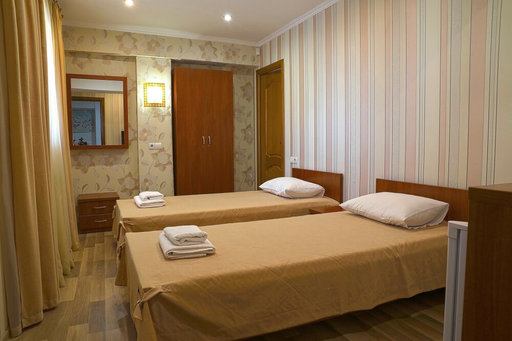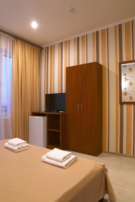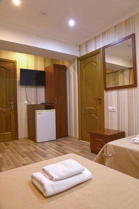 В номере есть холодильник, телевизор, wi-fi, фен, полотенца, стол, тумбочки, шкаф-гардероб. Санузел совмещенный с душевой кабинкой.
