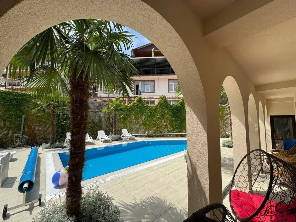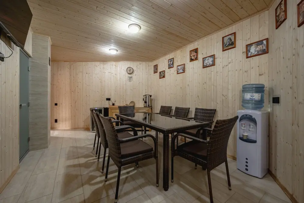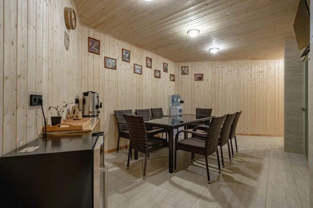 На территории гостевого дома есть общая кухня, которая включает в себя набор необходимой посуды, чайник и микроволновую печь. Во дворе организована площадка барбекю для приготовления мяса и овощей. На территории есть бильярд, а также бассейн, хамам и баня.