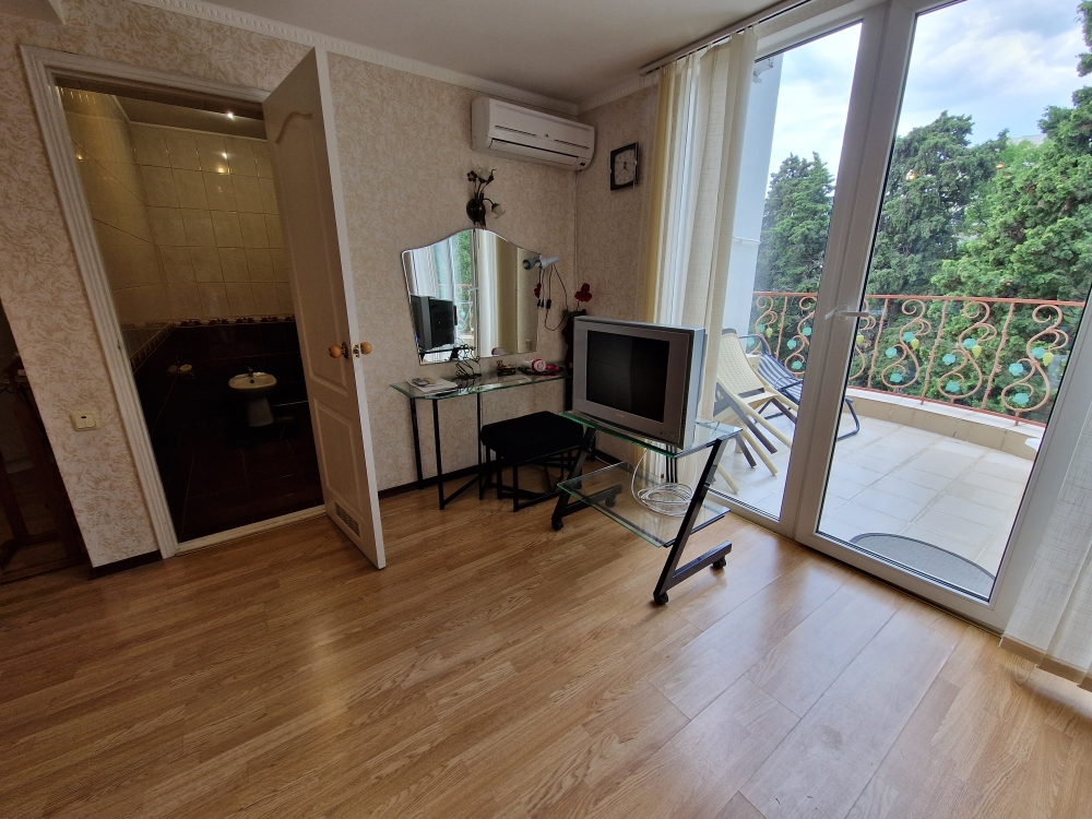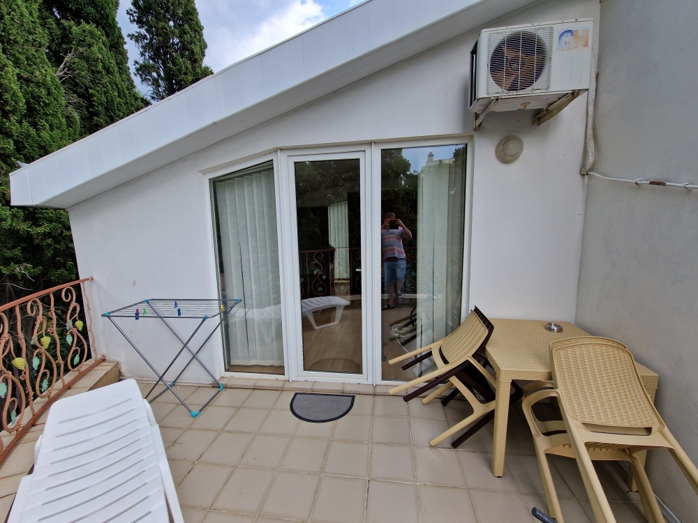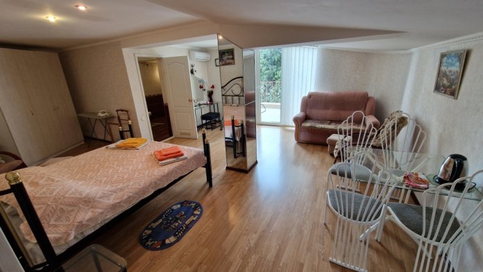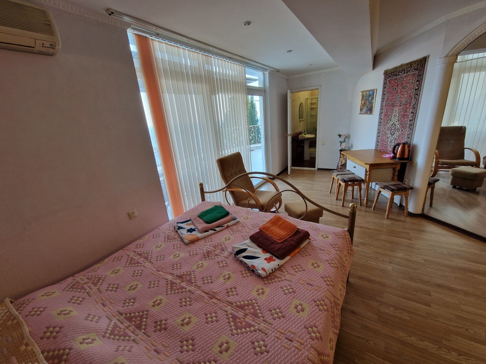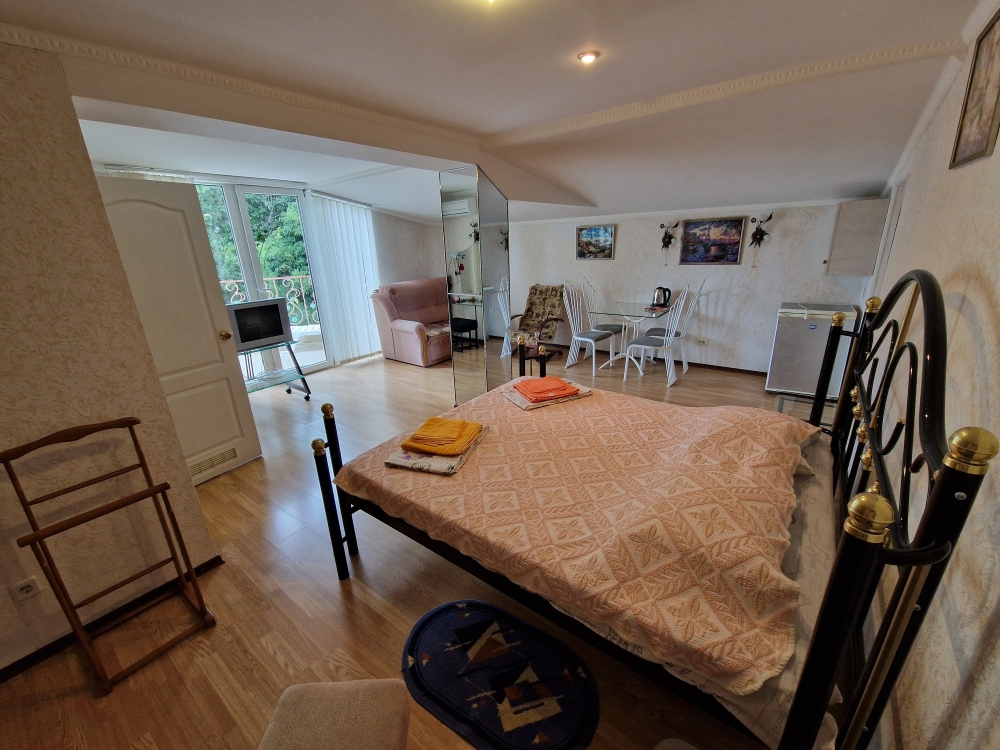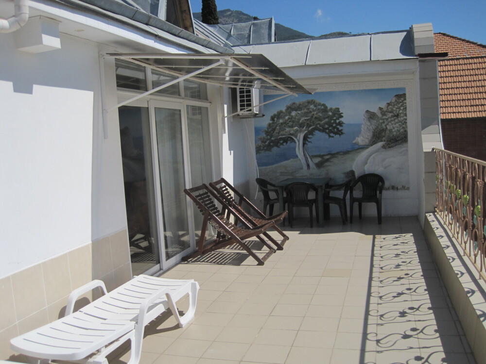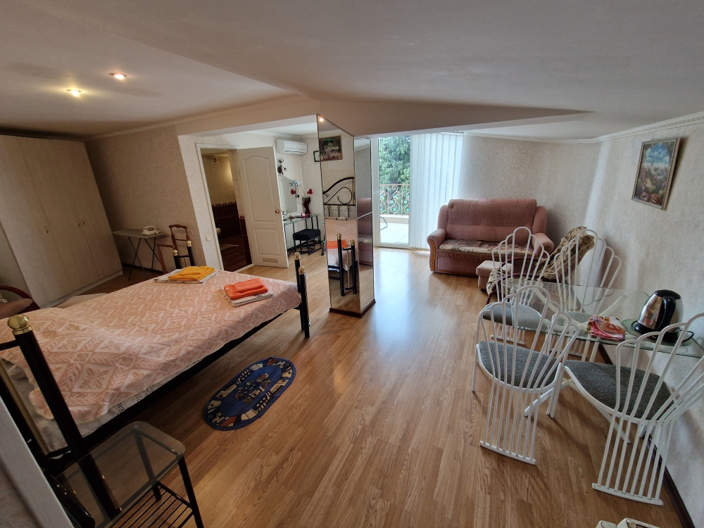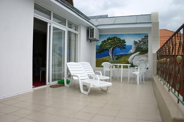 Однокомнатный комфортный номер общей площадью - 25 кв. м с большой открытой террасой 30 кв. м, с которой открывается красивый вид на море.