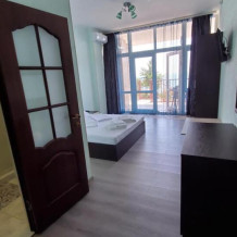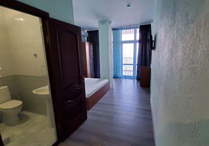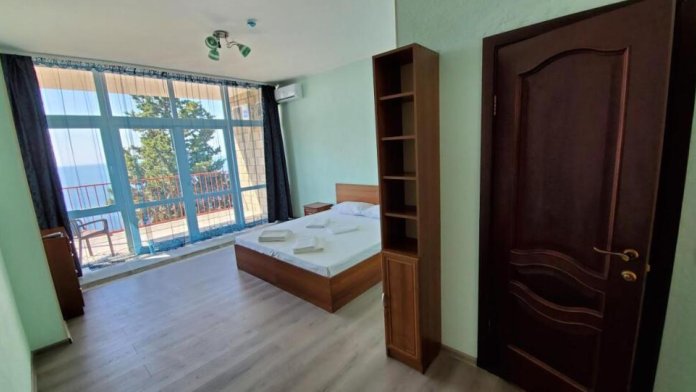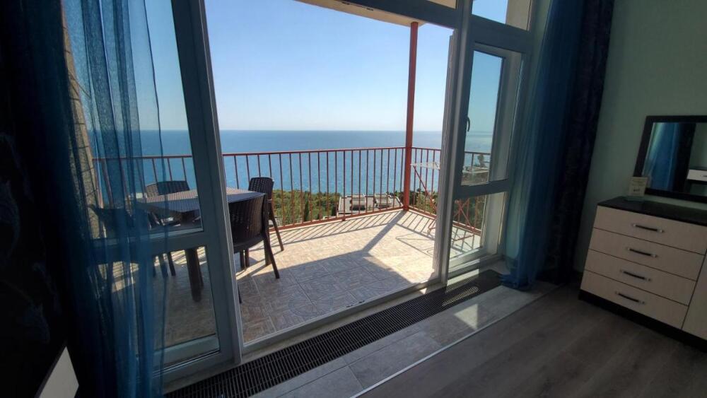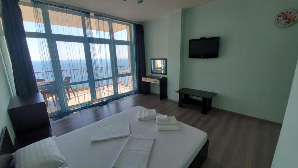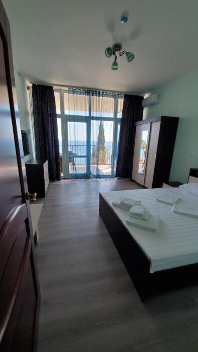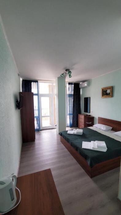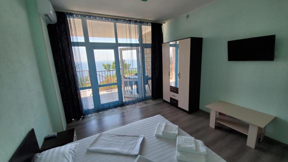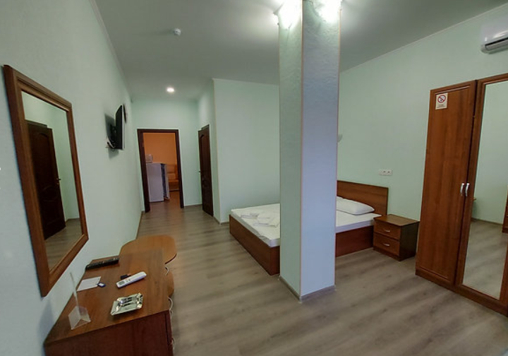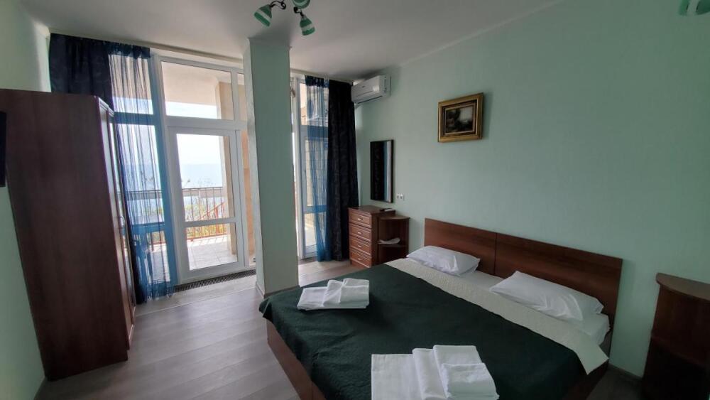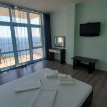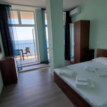 Номер этого типа с большой лоджией и видом на море, в спальне двуспальная кровать или две односпальные, кондиционер, телевизор с плоским экраном и санузел. Гостиная комната оборудована кухней со всем необходимым для приготовления пищи, микроволновая печь, электрочайник и холодильник, также в прихожей имеется двуспальный раскладной диван, на котором могут разместиться двое детей или один взрослый с ребенком. При необходимости бесплатно оборудуем номер детской кроваткой для младенцев или раскладной кроватью для взрослых или подростков за отдельную плату.