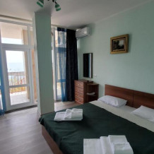 Все номера этого типа с большой лоджией и видом на море, в спальне двуспальная кровать или две односпальные, кондиционер, телевизор с плоским экраном и санузел. Гостиная комната оборудована кухней со всем необходимым для приготовления пищи, микроволновая печь, электрочайник, электроплитка (вне сезон) и холодильник, также в гостиной имеется двуспальный раскладной диван, на котором могут разместиться двое взрослых или детей. При необходимости бесплатно оборудуем номер детской кроваткой для младенцев или раскладной кроватью для взрослых или подростков за отдельную плату.