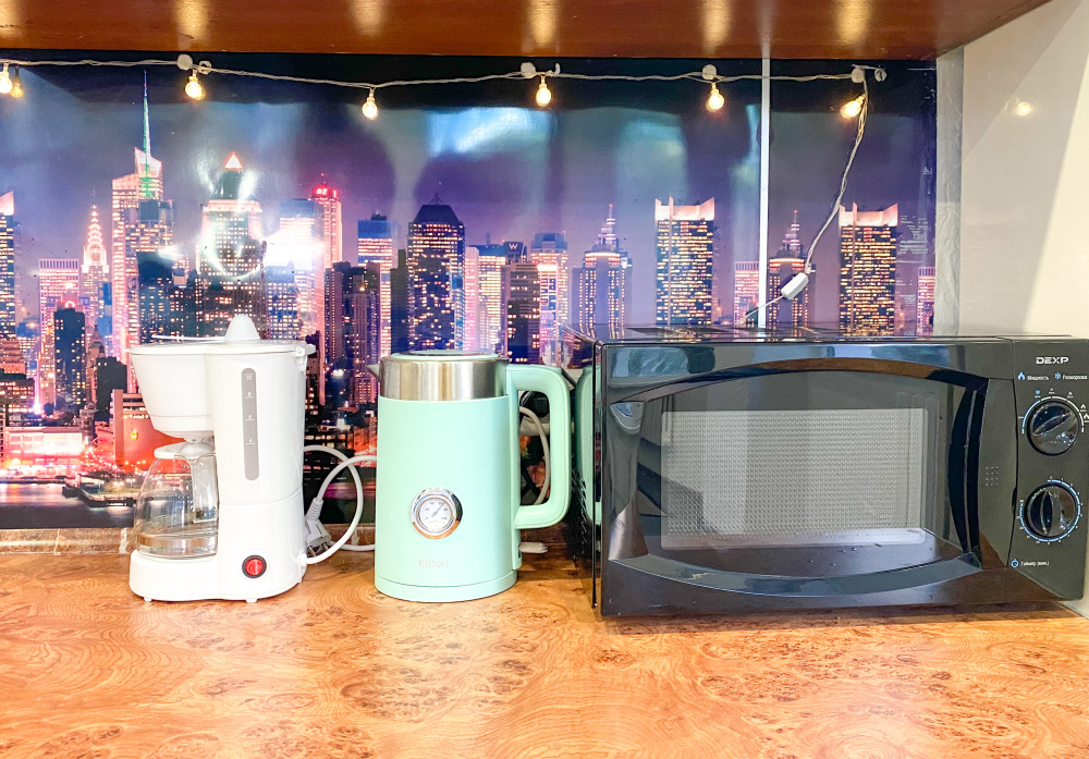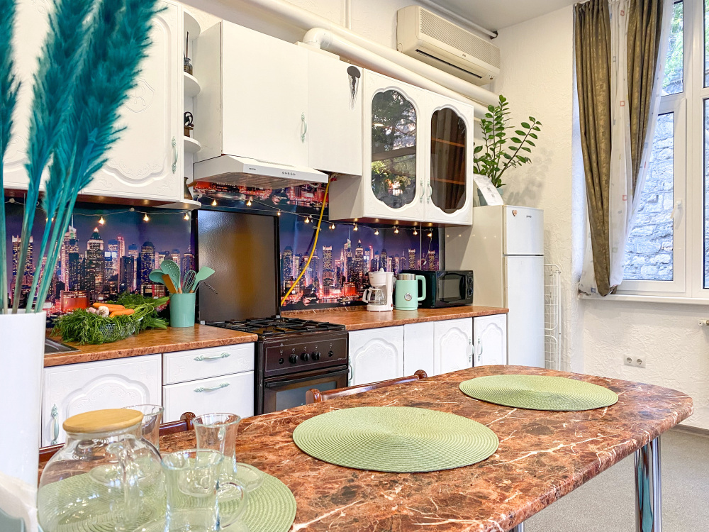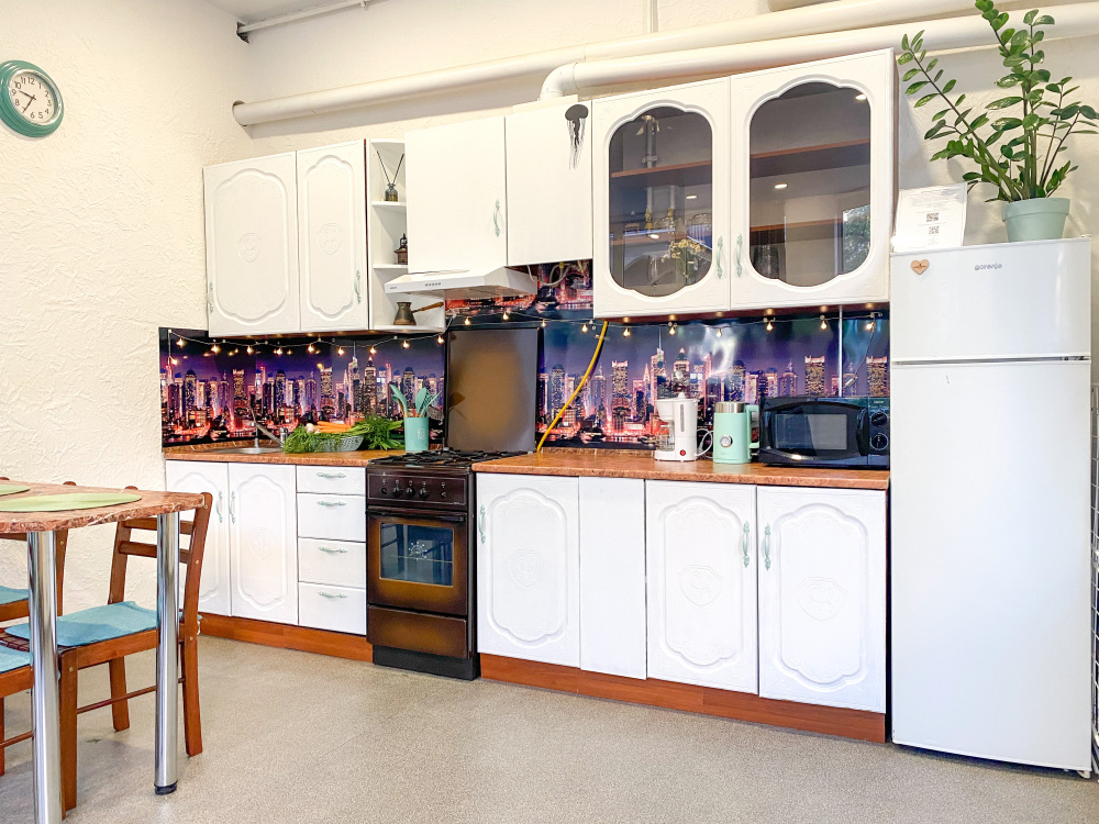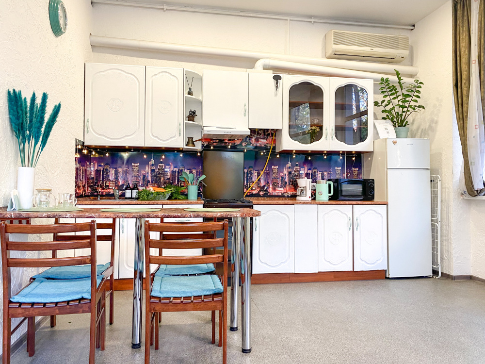 В четвёртых, это удобства в самой квартире, большая кухня, вся посуда для приготовления и приема пищи вплоть до терки, консервного ножа, овощечистки и штопора.