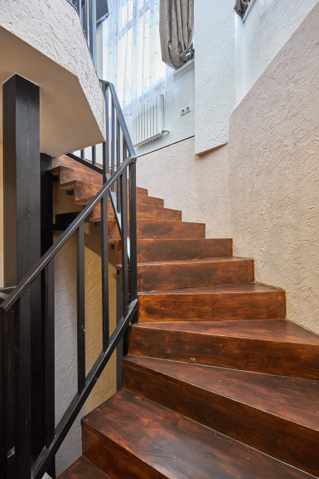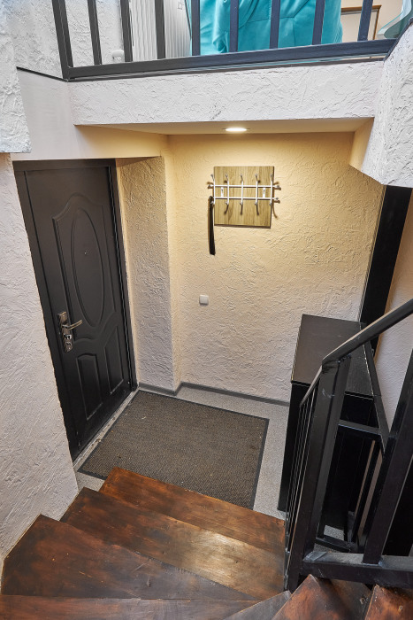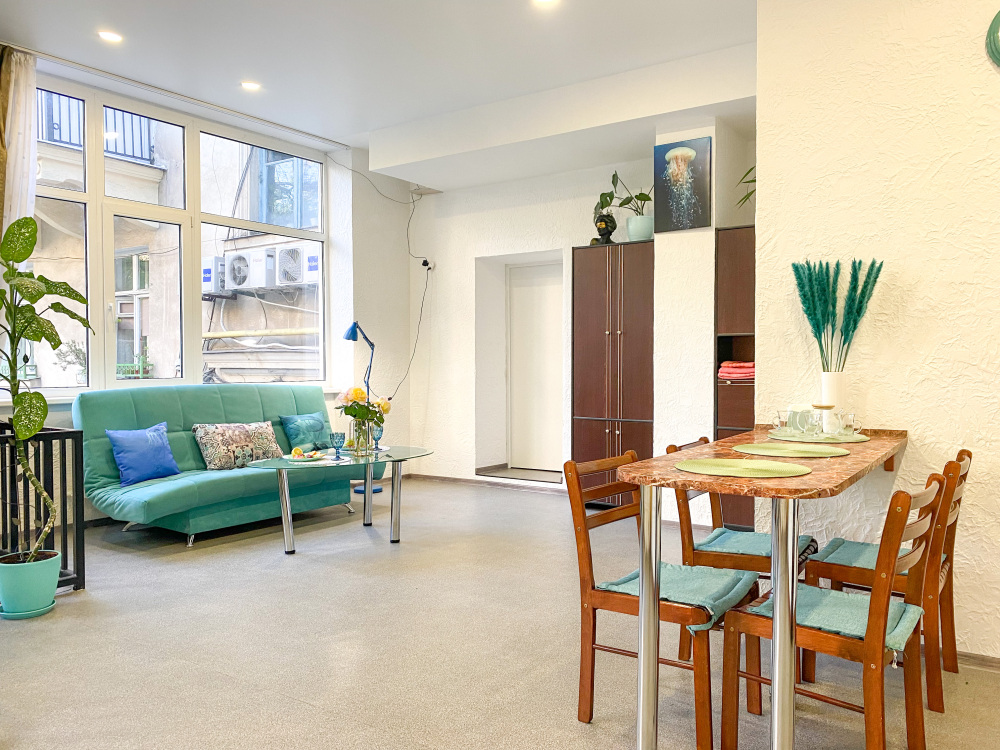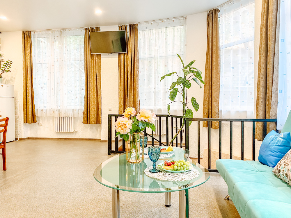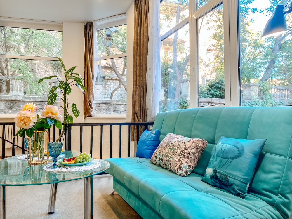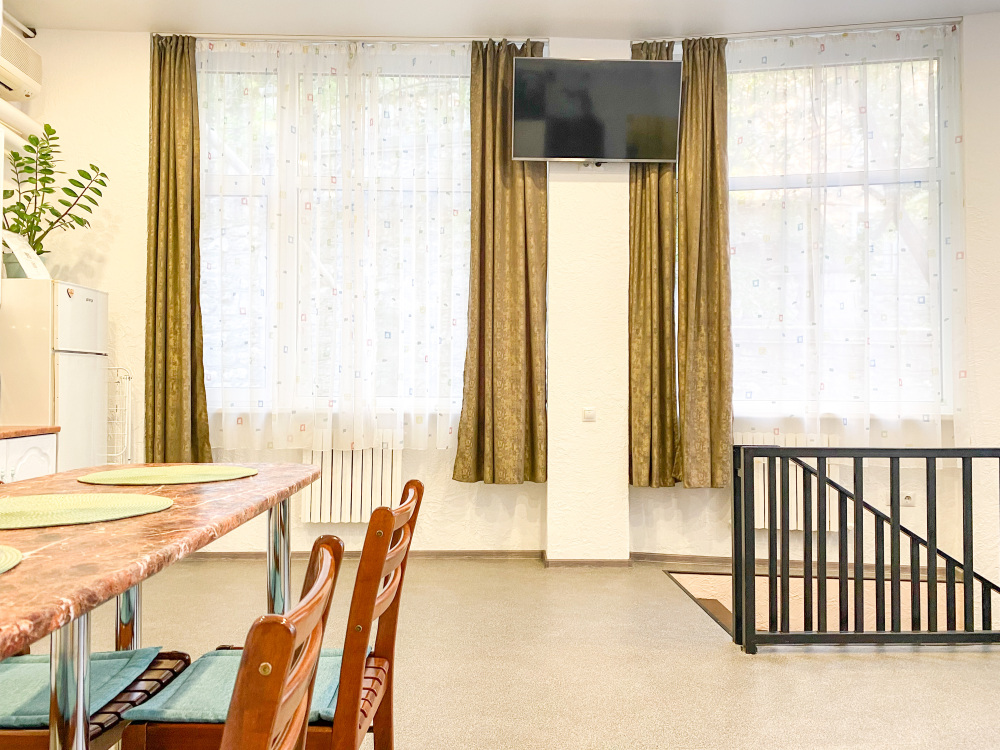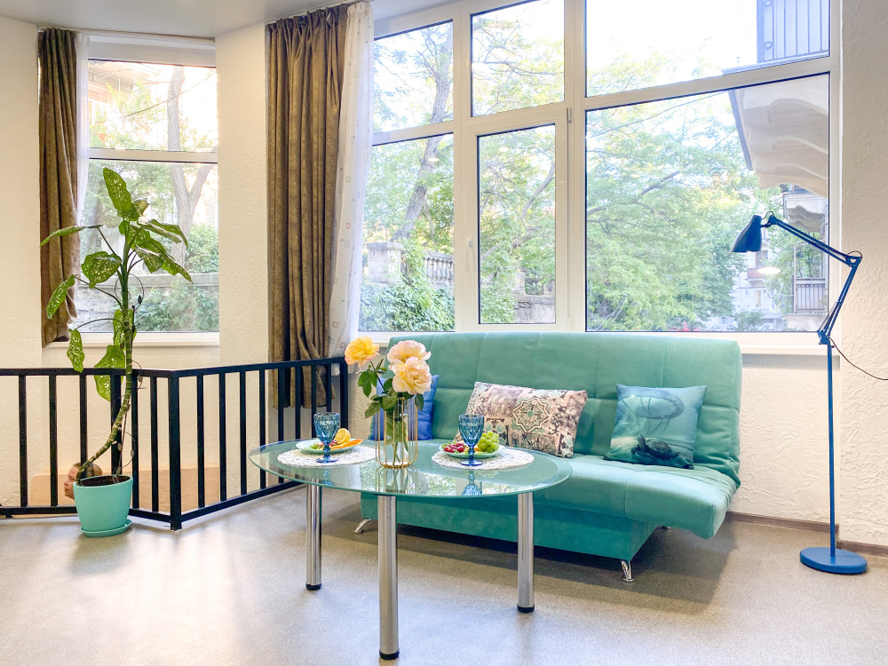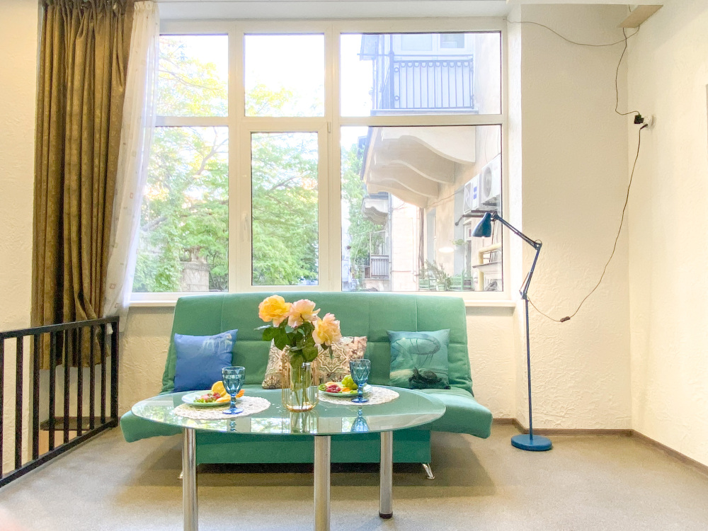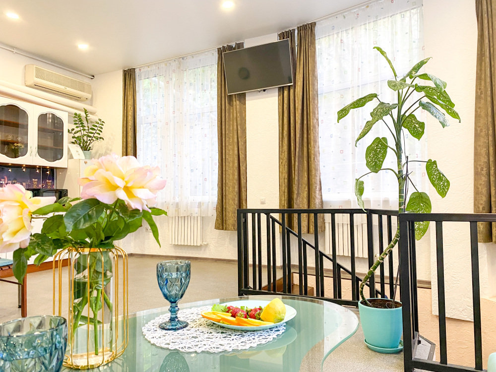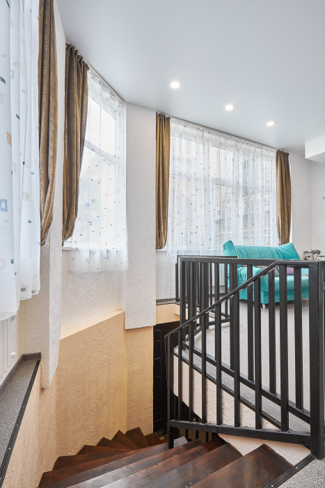 Во-вторых, большие панорамные окна, квартира очень светлая и уютная. С отдельным входом (практически отдельный дом в самом центре города).