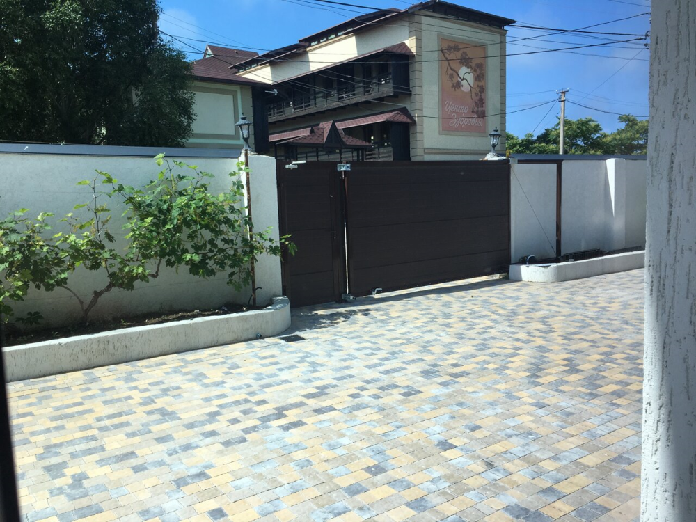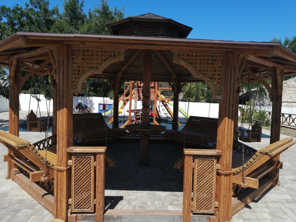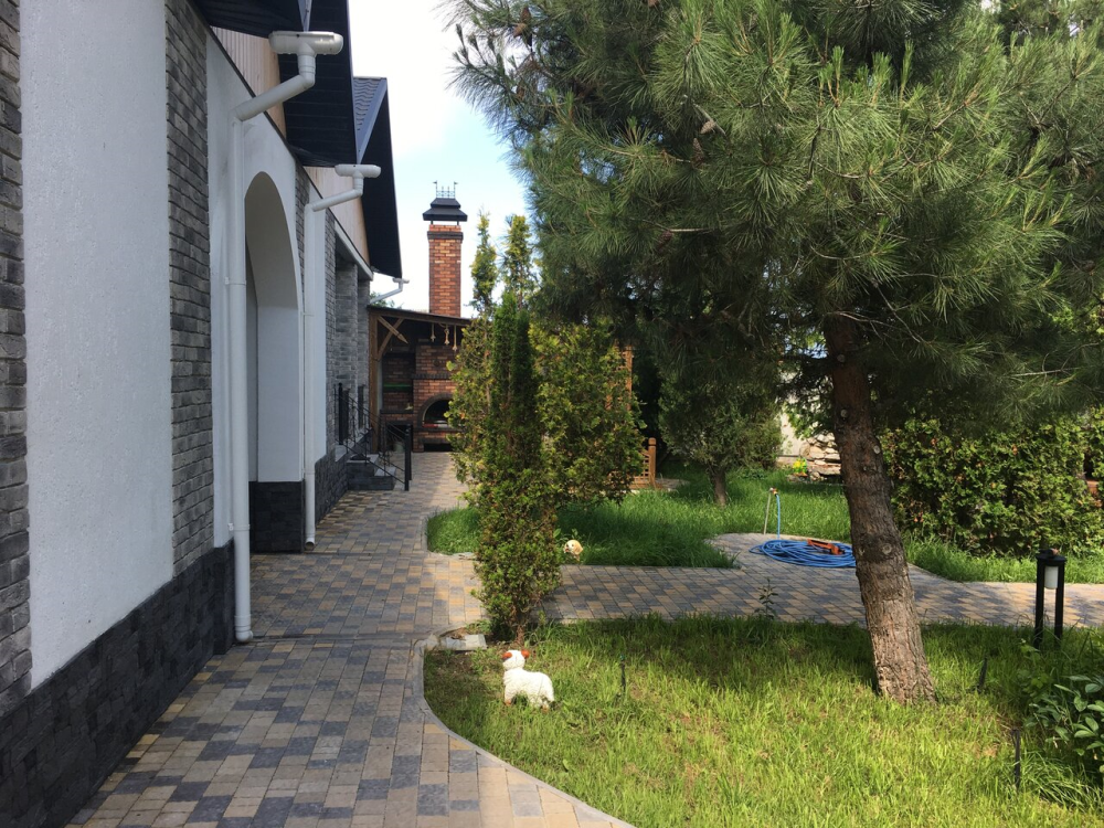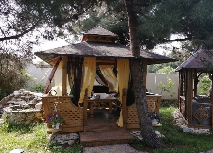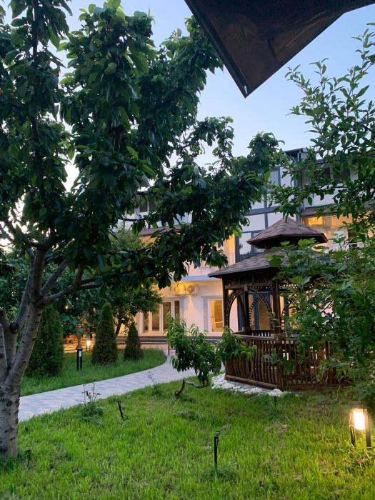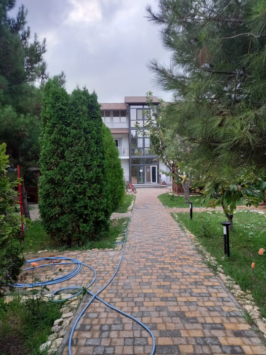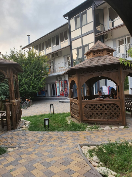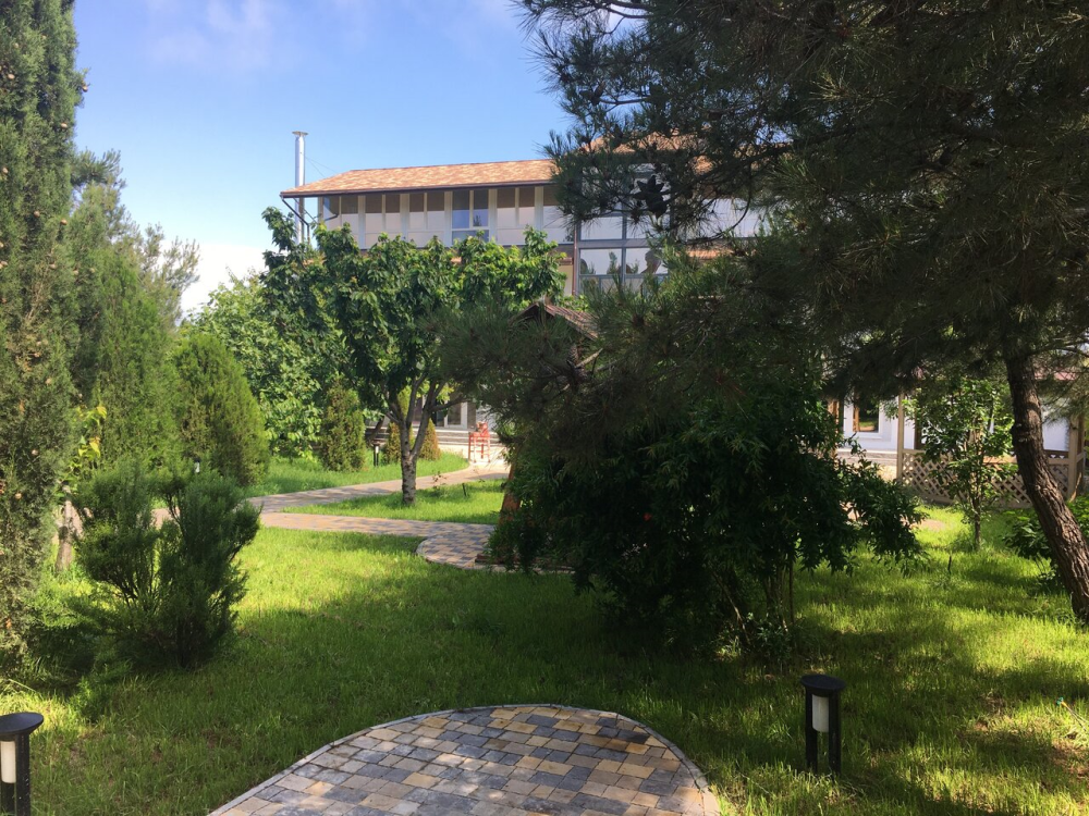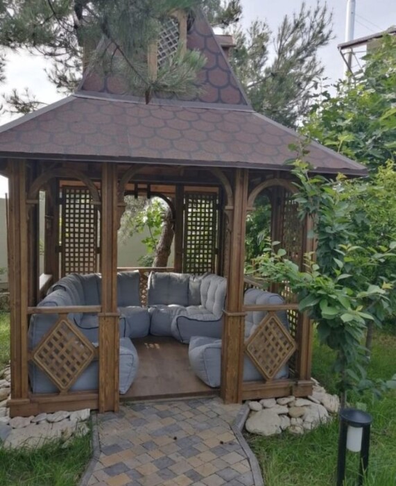 Двор утопает в зелени, много беседок для приятного времяпрепровождения, мангал, детская площадка с батутом, парковка.