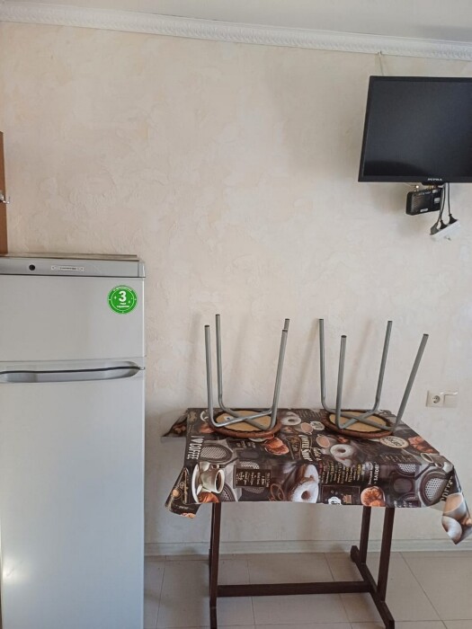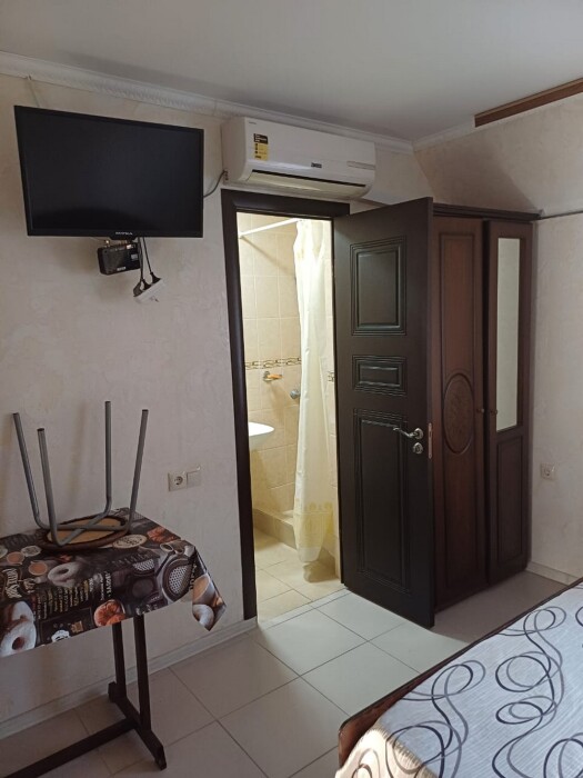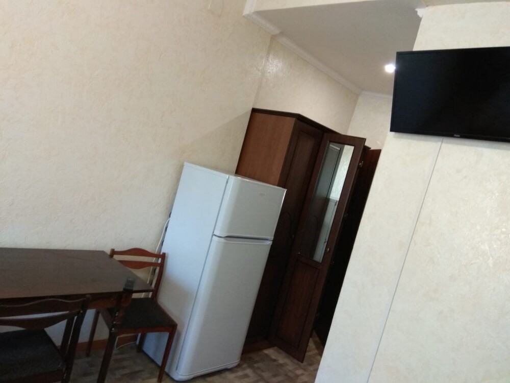 Имеется телевизор, кондиционер, шкаф, вешалка, обеденный стол, чайник, холодильник, стулья.
