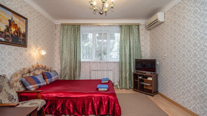 На первом этаже 5 этажного дома .В квартире имеется все необходимое для проживания : мебель, техника, кухонная утварь, кондиционер, фен, утюг. постельное белье, полотенца, смарт тв , вай фай, свое отопление. Окна квартиры выходят на свой полисадник. Квартира чистая, светлая. Находится на ровном удобном месте 2 линия не шумно.