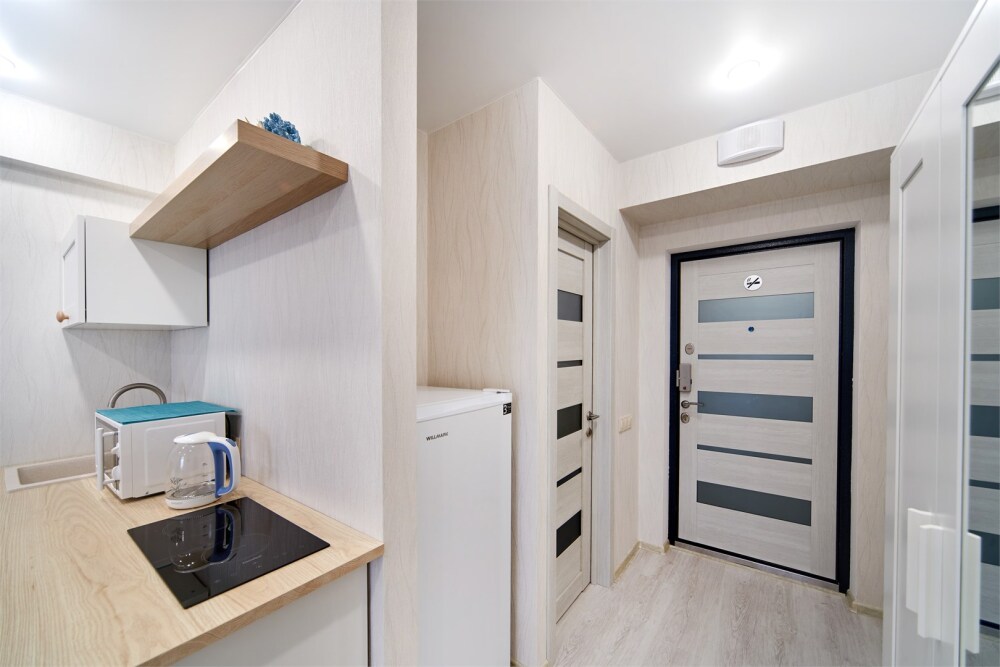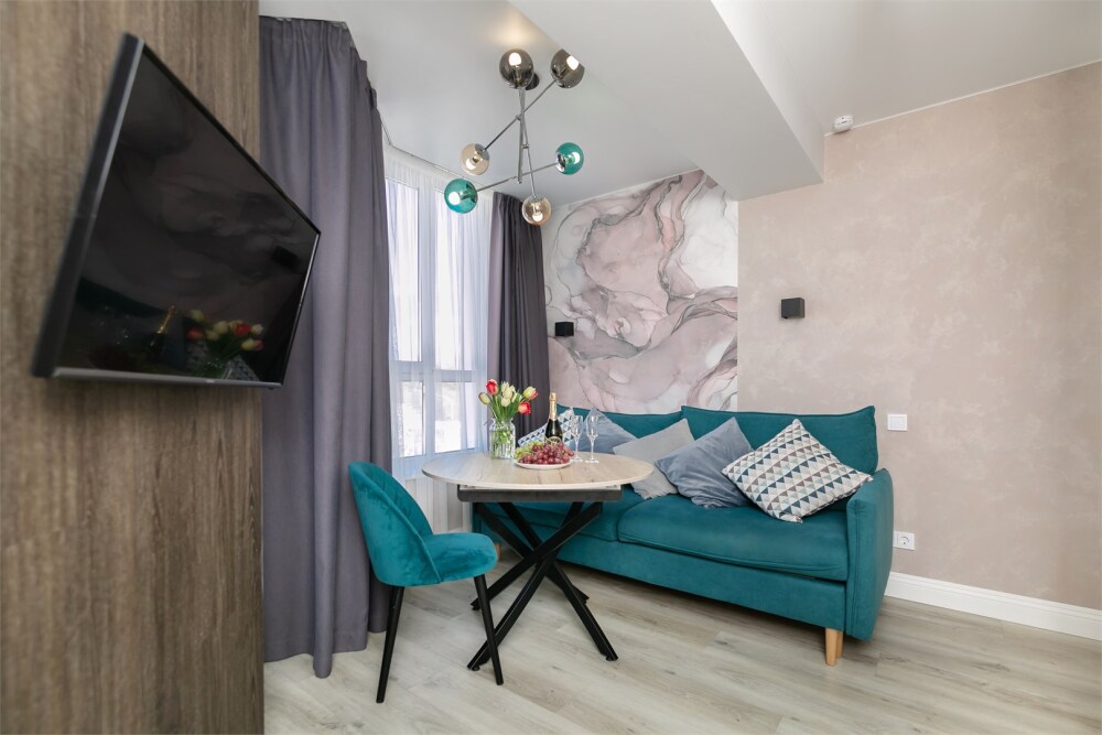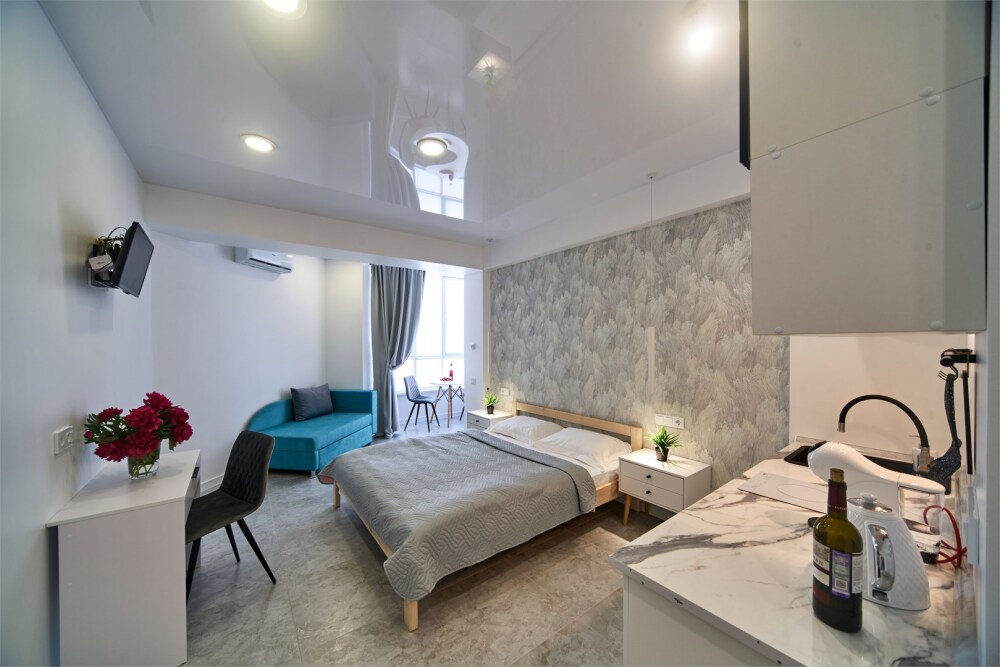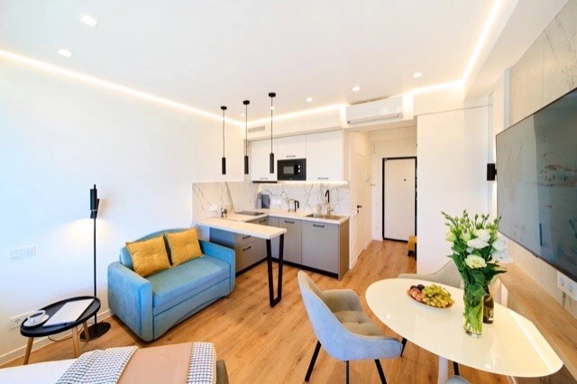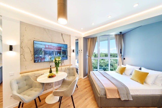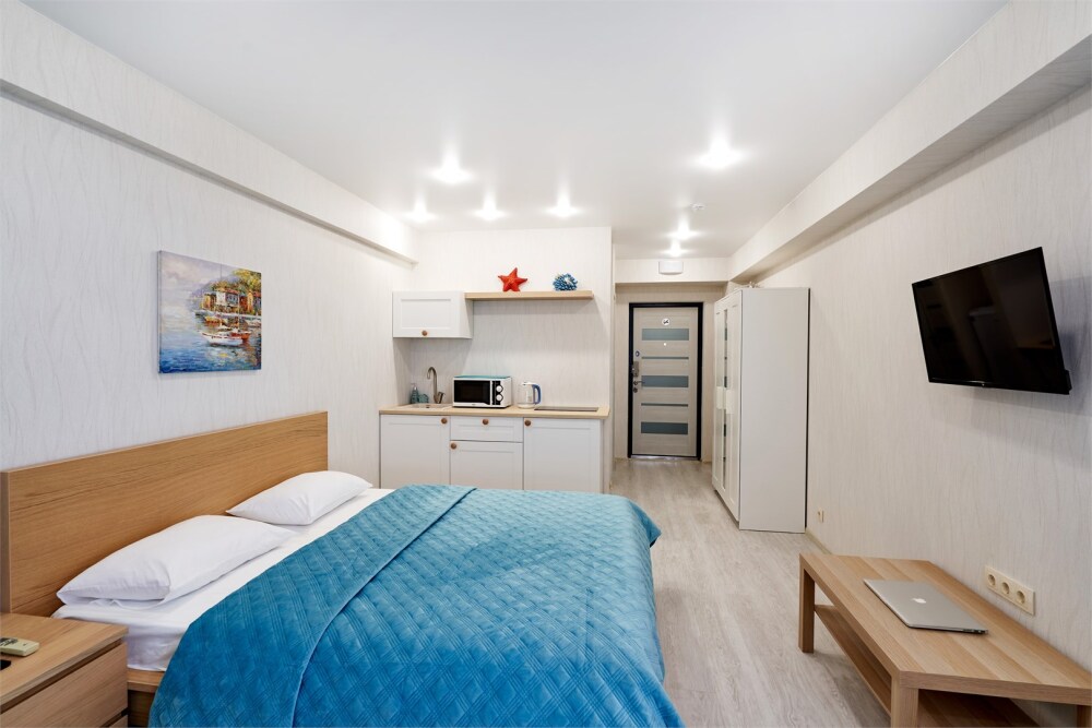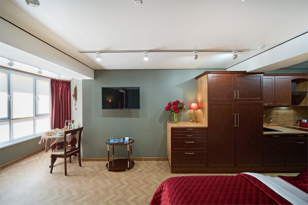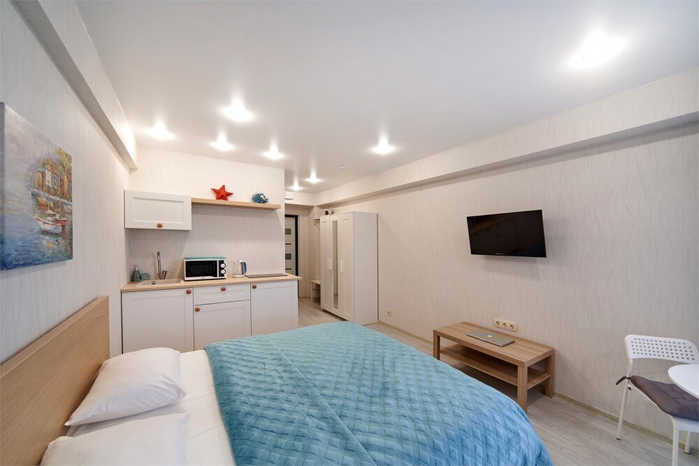 Каждая деталь в апартаментах продумана для Вашего комфорта: современная кухонная зона для приготовления любимых блюд, обеденная зона для уютных завтраков, телевизор для вечернего отдыха и бесплатный Wi-Fi для связи. В Вашем распоряжении холодильник, фен, мягкое постельное белье и банные принадлежности, а также мини-парфюмерия и тапочки для Вашего абсолютного удобства.