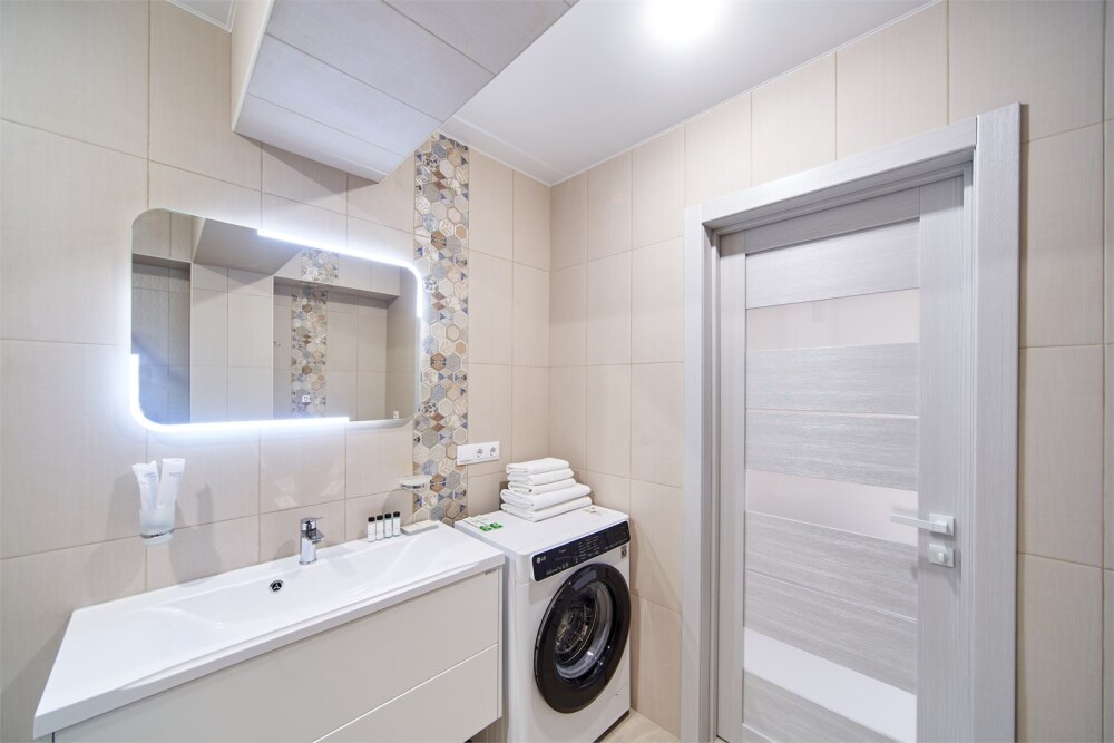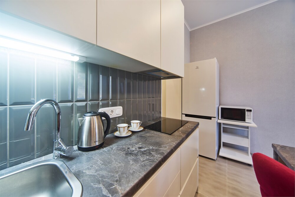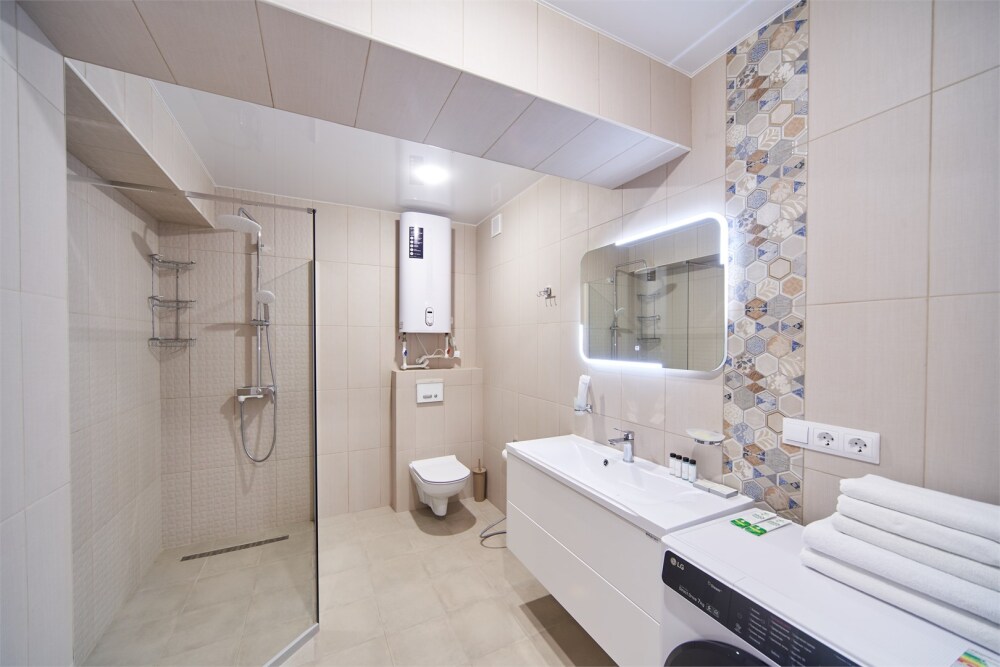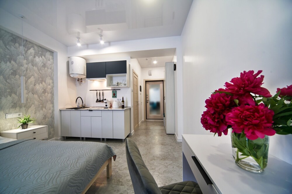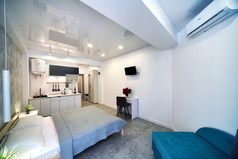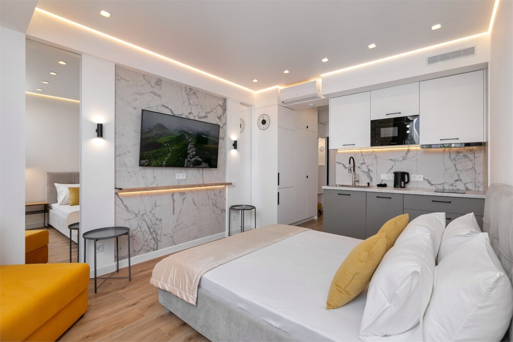 Каждая деталь в апартаментах продумана для Вашего комфорта: современная кухонная зона для приготовления любимых блюд, обеденная зона для уютных завтраков, телевизор для вечернего отдыха и бесплатный Wi-Fi для связи. В Вашем распоряжении холодильник, фен, мягкое постельное белье и банные принадлежности, а также мини-парфюмерия и тапочки для Вашего абсолютного удобства.