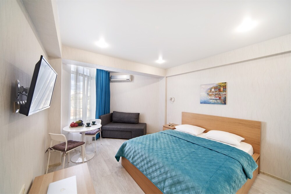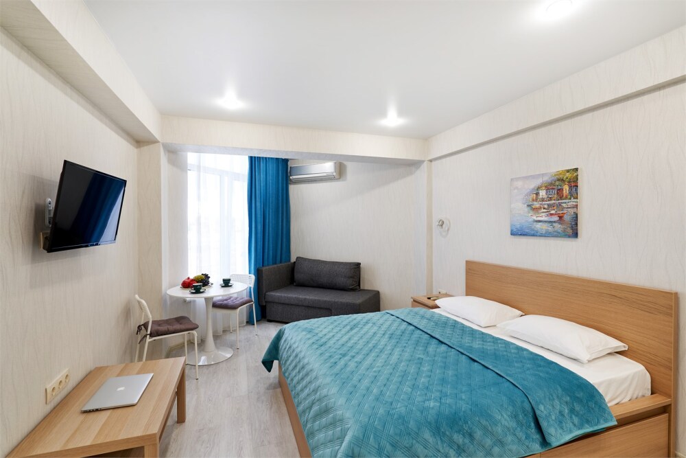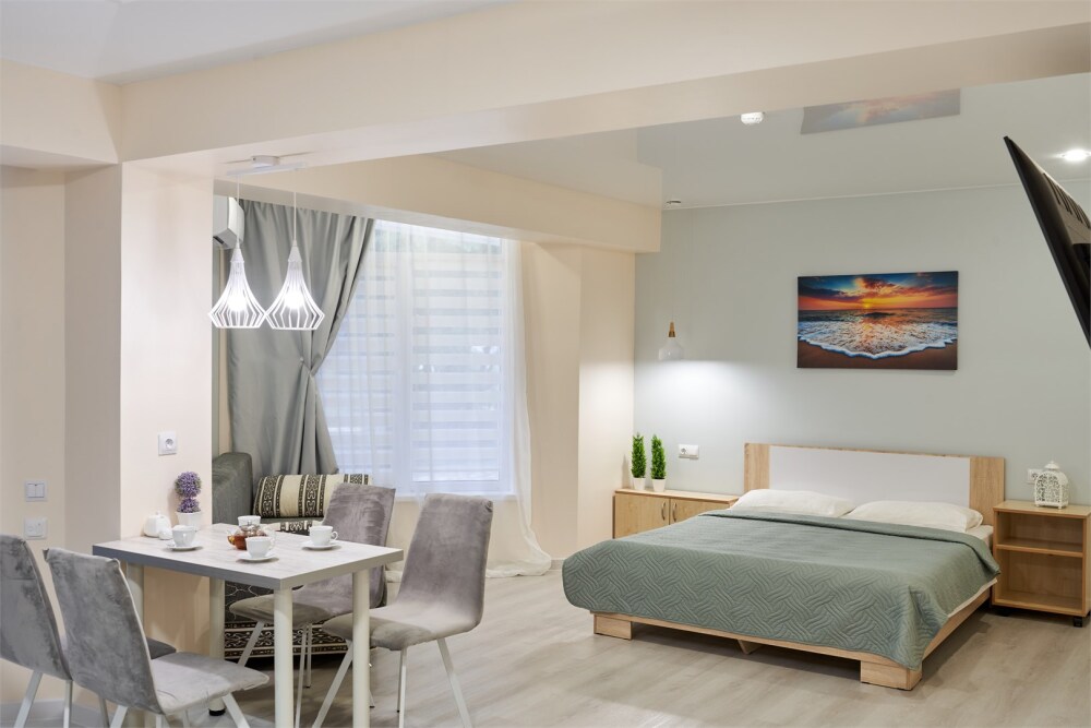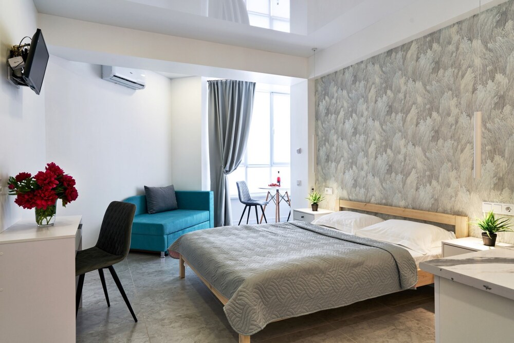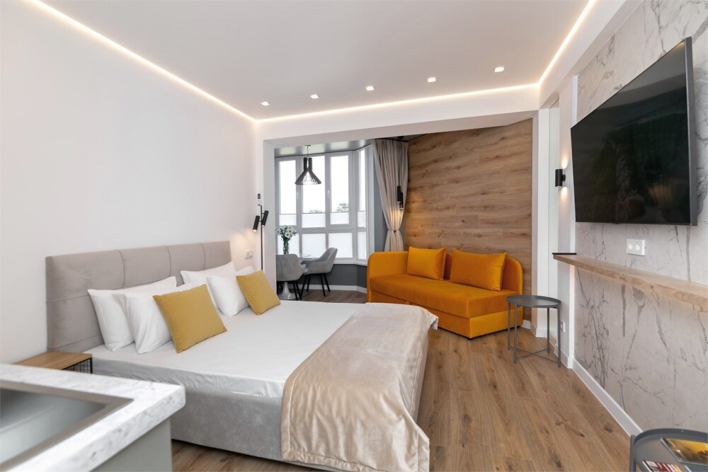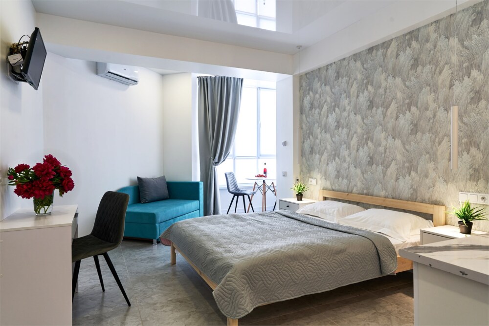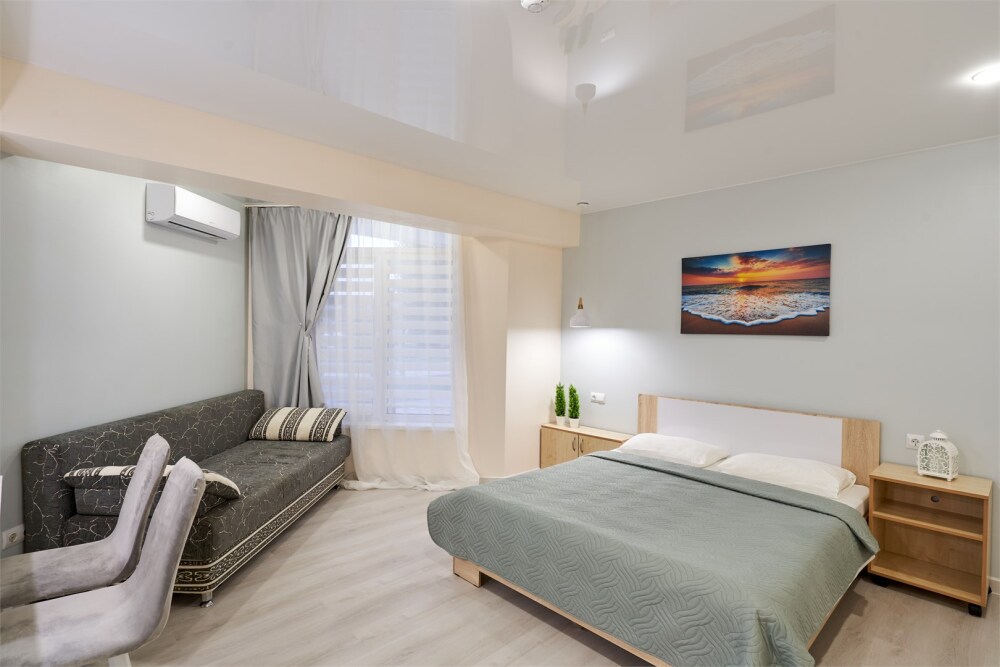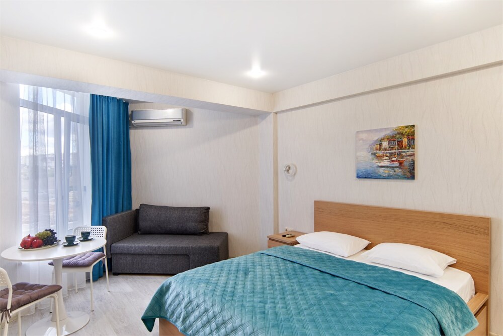 Вас ждёт уютная спальня с удобной двуспальной кроватью и раскладным диваном, что делает эти апартаменты идеальными для одного или двух взрослых, с возможностью организации дополнительного места.
