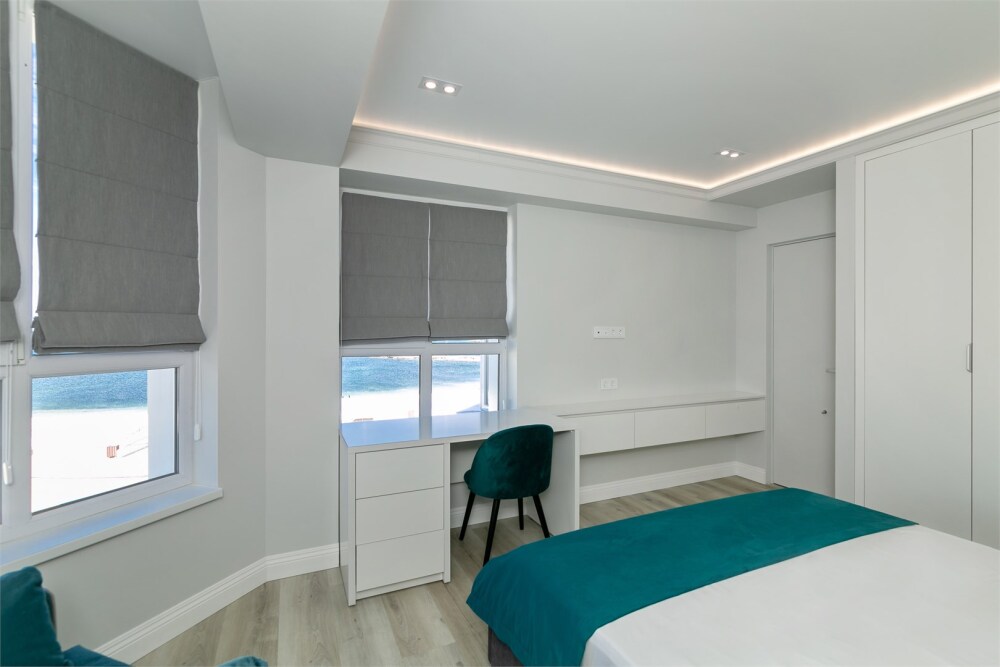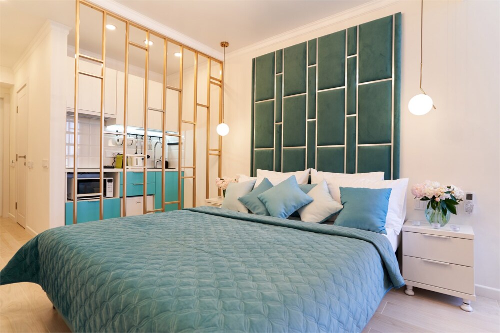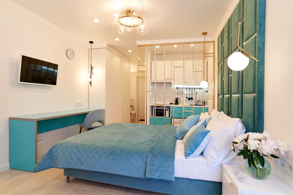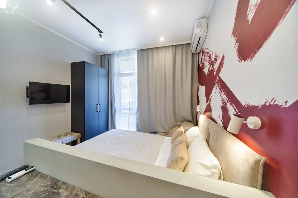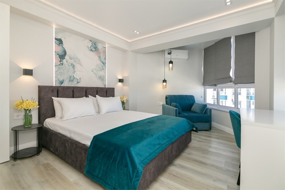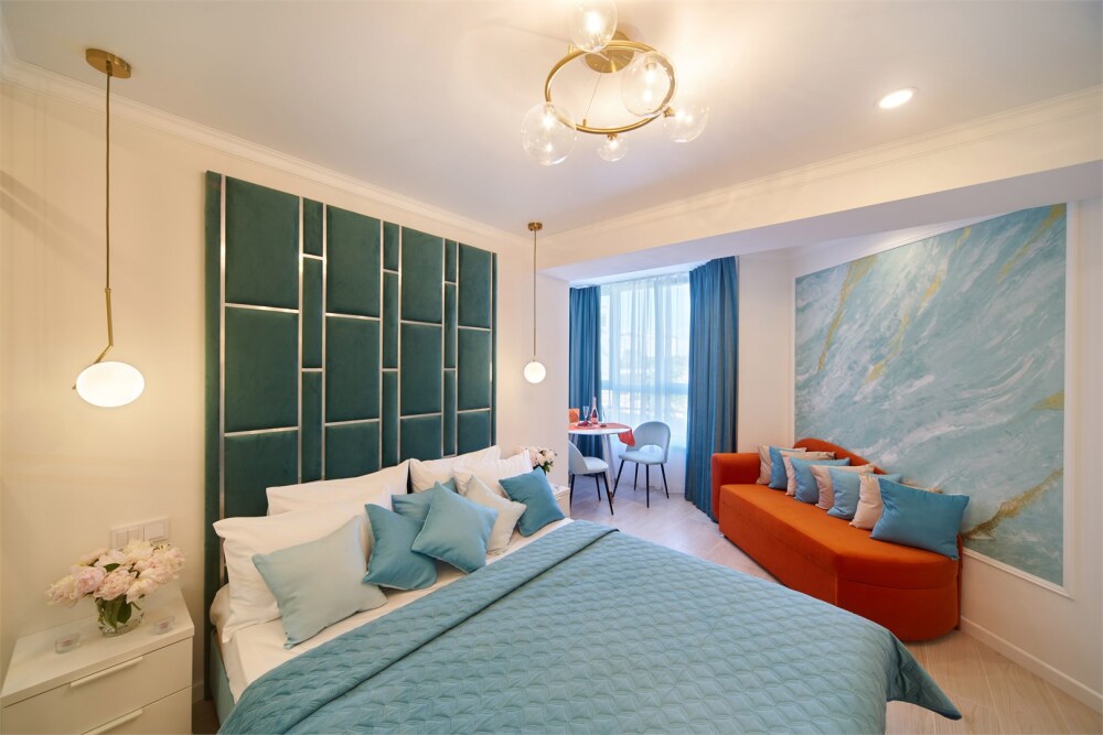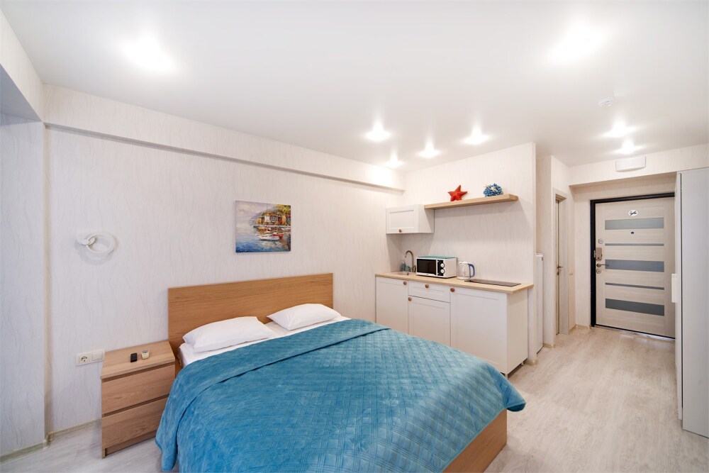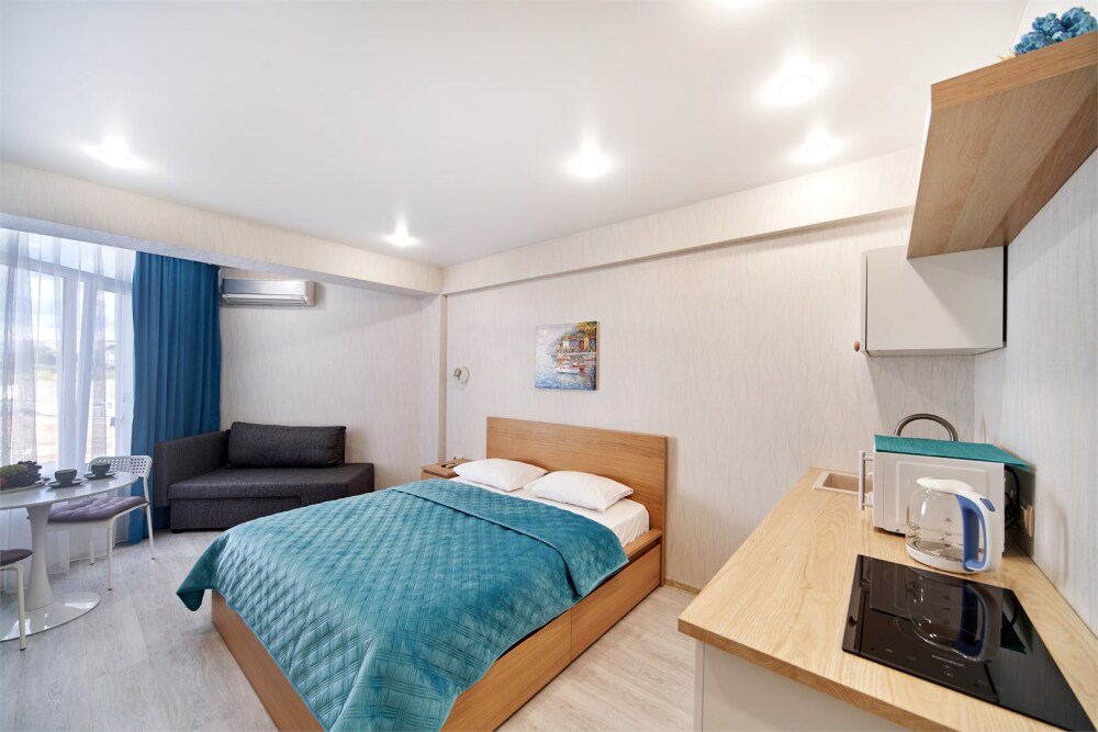 Вас ждёт уютная спальня с удобной двуспальной кроватью и раскладным диваном, что делает эти апартаменты идеальными для одного или двух взрослых, с возможностью организации дополнительного места.