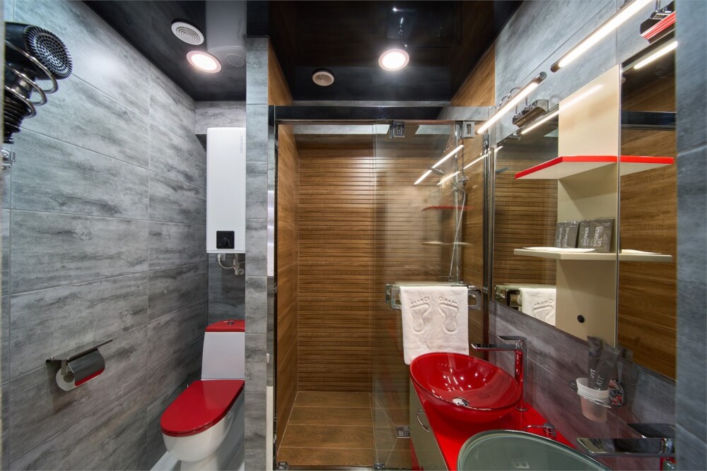 В спальне установлена комфортная двуспальная кровать 160*200 и раскладное кресло, идеально для размещения одного или двух взрослых с возможностью организации дополнительного места для ребенка.