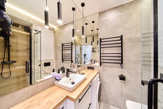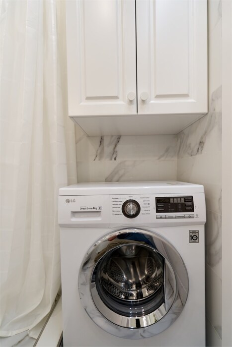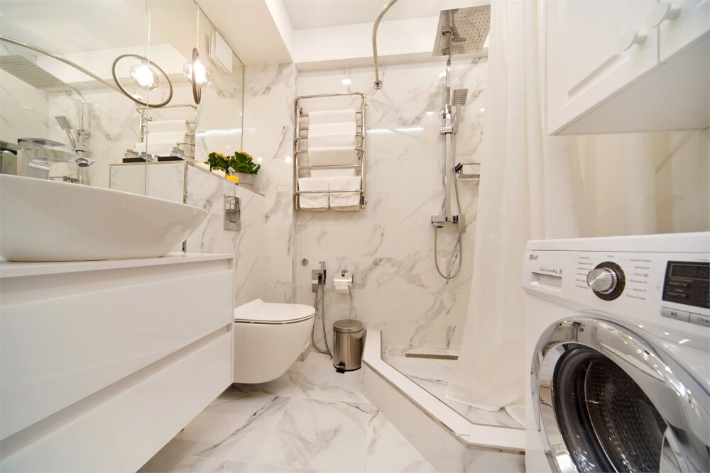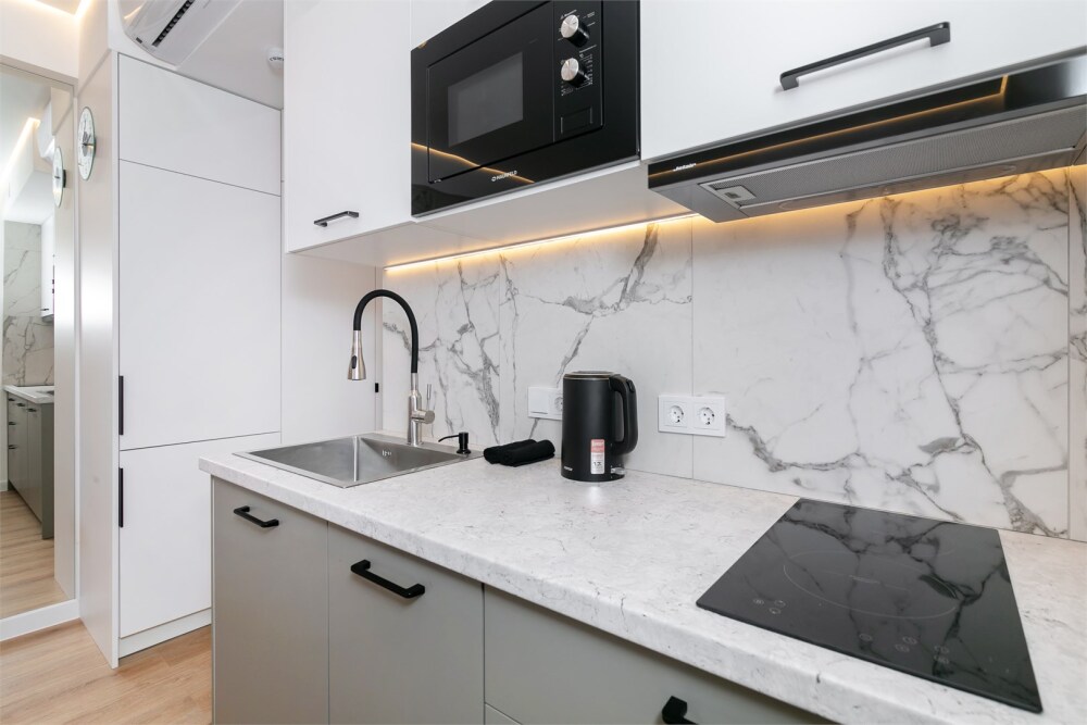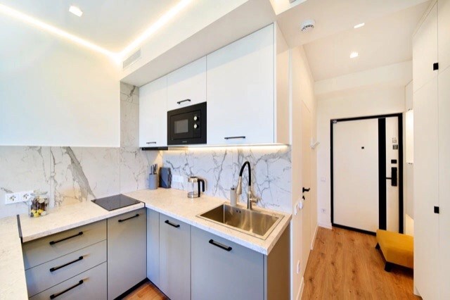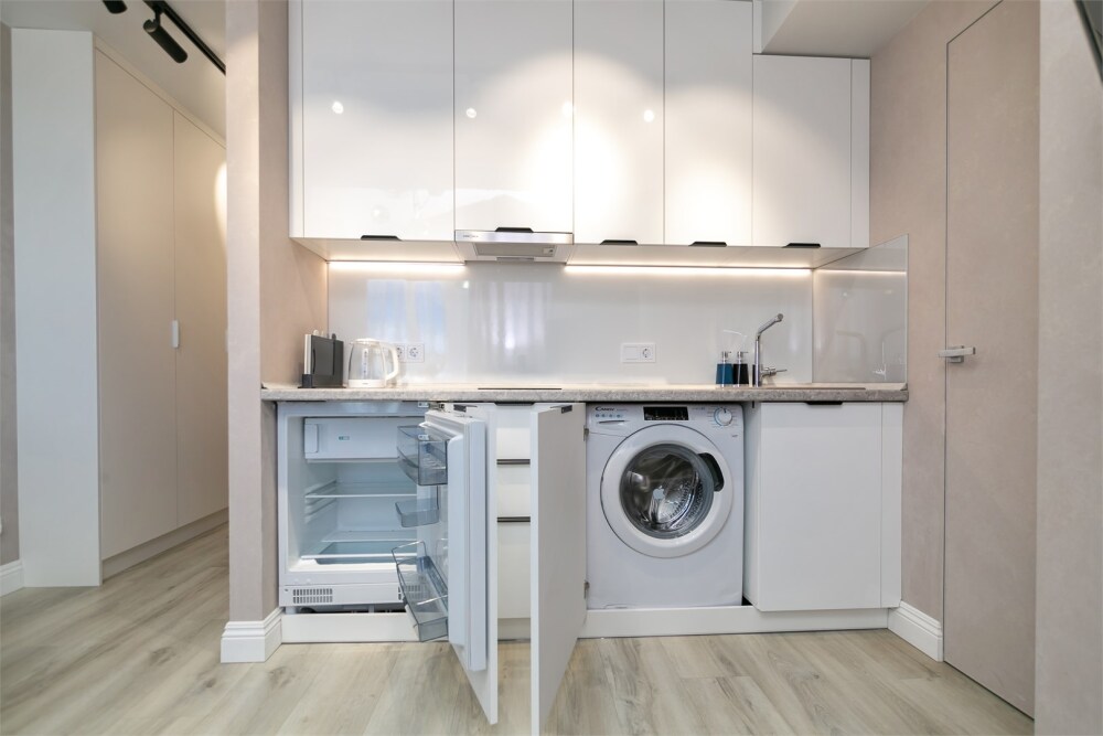 Кухонная зона с варочной поверхностью, холодильником и микроволновой печью, стиральная машина, кондиционер для комфортной температуры в любое время года.