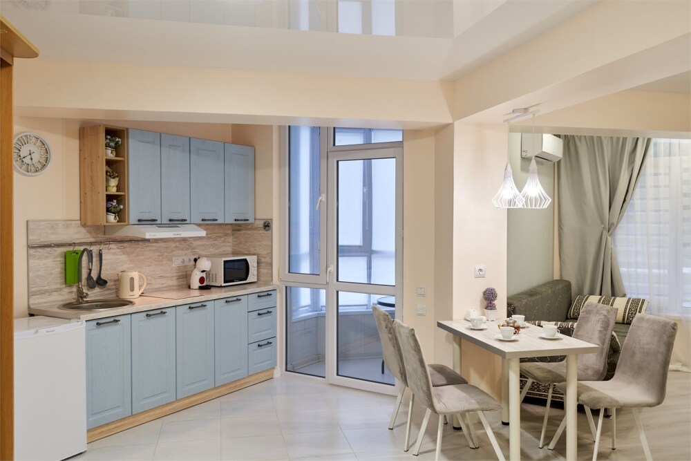 В номере есть всё необходимое для вашего комфортного пребывания: закрытый балкон, где Вы сможете расслабиться в любое время дня, обеденная зона, кофемашина для утреннего бодрящего кофе, а также полностью оборудованная кухонная зона с плитой и набором посуды.