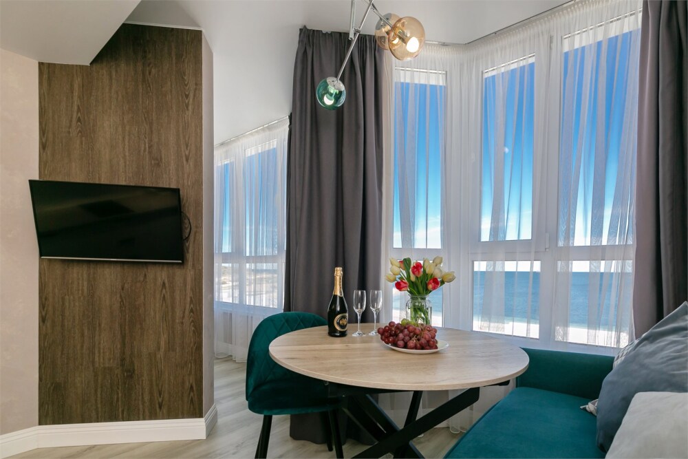 В номере предусмотрено всё для Вашего комфортного пребывания: уютная лоджия с видом на море, обеденная зона, а также кухонная зона с плитой и набором посуды. Для Вашего удобства в апартаментах также есть телевизор, бесплатный Wi-Fi и индивидуальный климат-контроль.