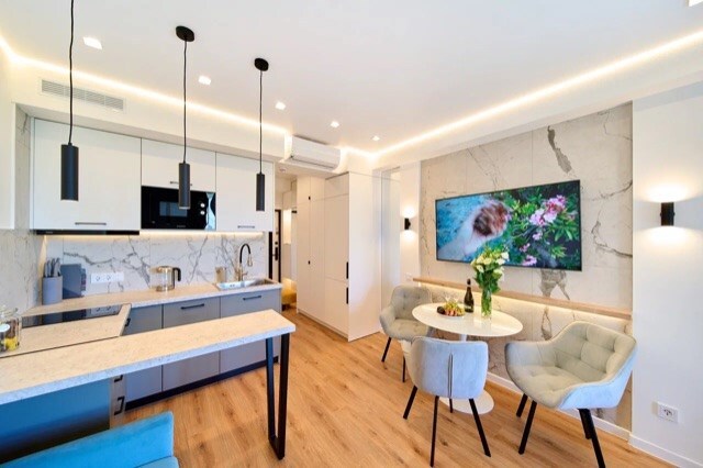Современная кухонная зона для приготовления любимых блюд, обеденная зона для приятных трапез, телевизор для вечерних просмотров и бесплатный Wi-Fi для связи и развлечений.
