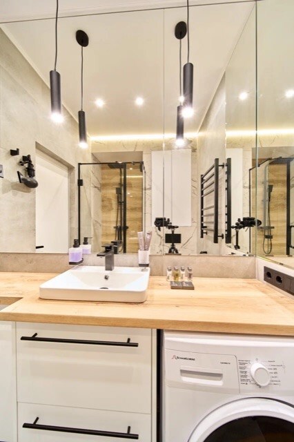 Кухонная зона с варочной поверхностью, холодильником и микроволновой печью, стиральная машина, кондиционер.