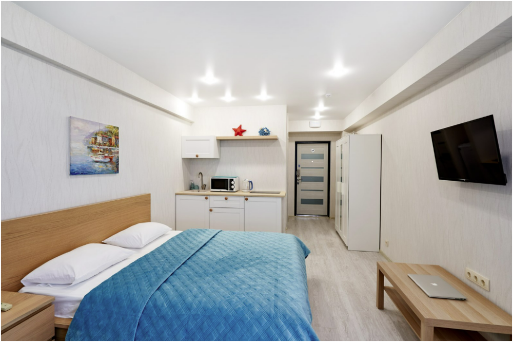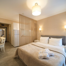 В апартаментах предусмотрена двуспальная кровать и одно дополнительное место, что делает их отличным выбором как для пары, так и для семьи с ребенком.