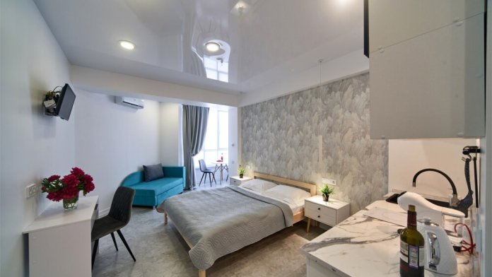 Также в апартаментах предусмотрены телевизор, бесплатный Wi-Fi,индивидуальный климат-контроль, постельное белье, мини-парфюмерия и тапочки.