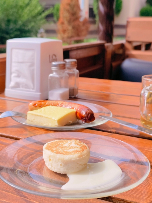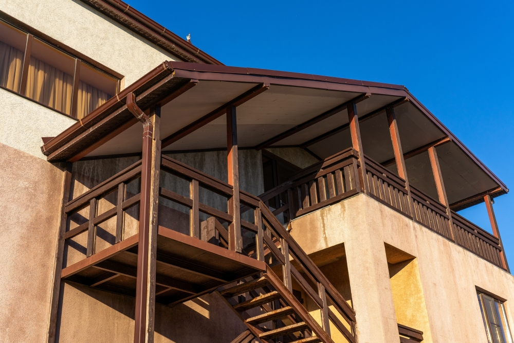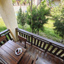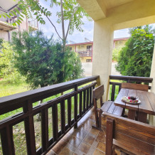 Террасса с видом на территорию отеля и летней мебелью (стол, стулья).