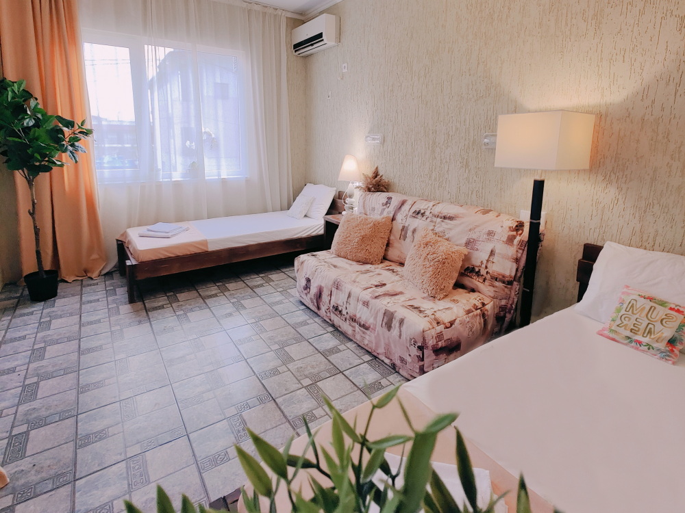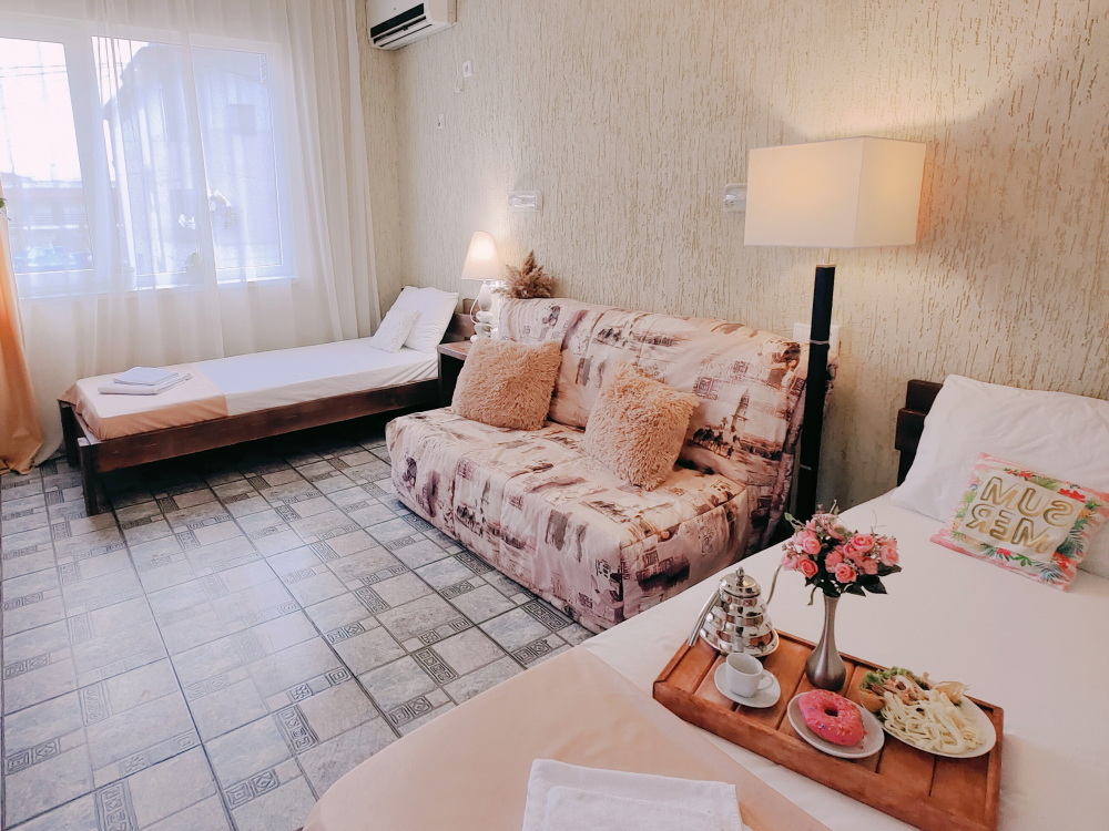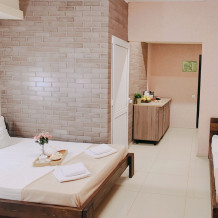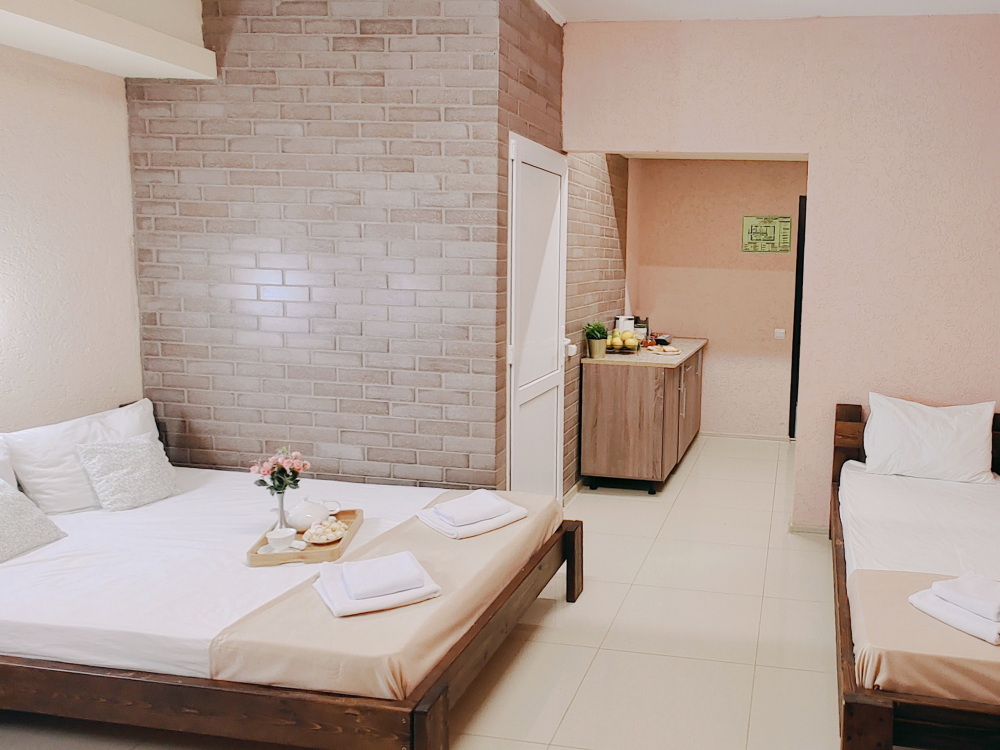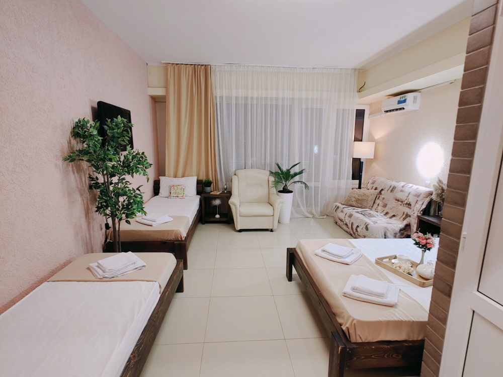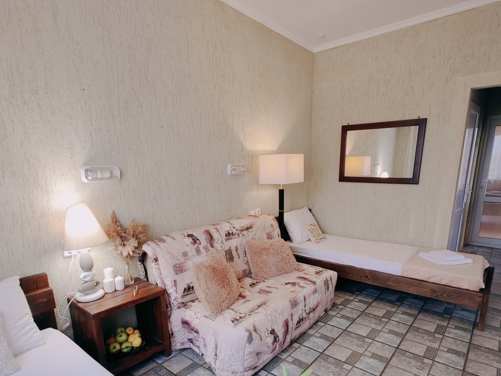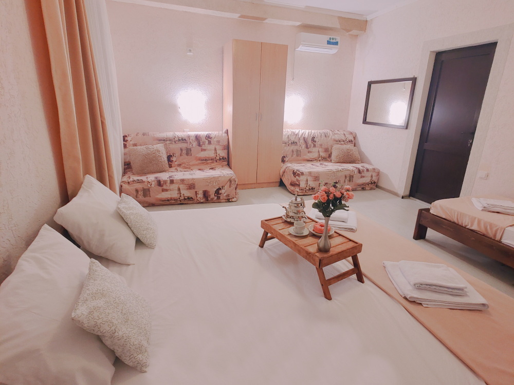 Четырехместный номер-студия с мини-кухней, с большой индивидуальной террасой и видом на море. Номер оснащён: двуспальная кровать и две односпальные кровати, прикроватные тумбочки, шкаф, телевизор, кондиционер. Мини-кухня: стол тумба, мини-холодильник, одноконфорочная индукционная плита, чайник, посуда (столовые приборы, кружки, тарелки, кастрюля, сковорода).