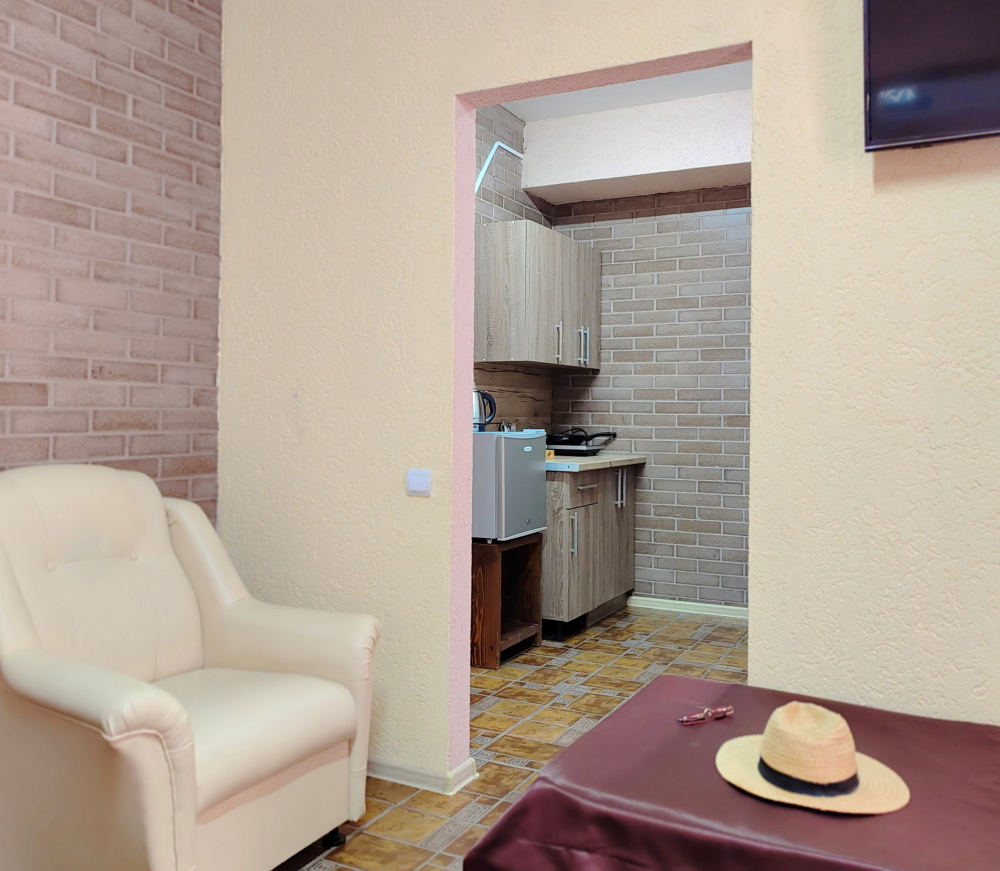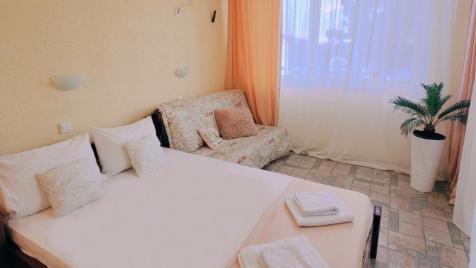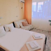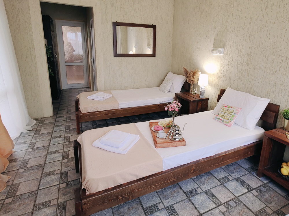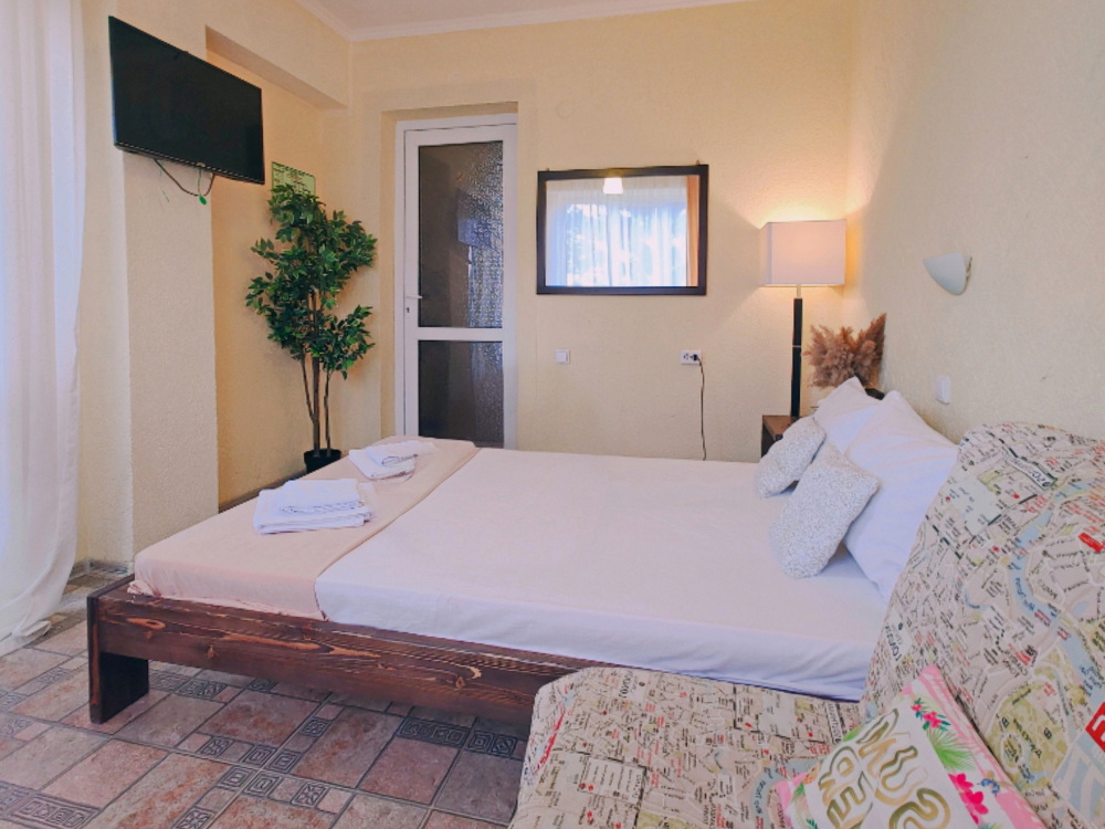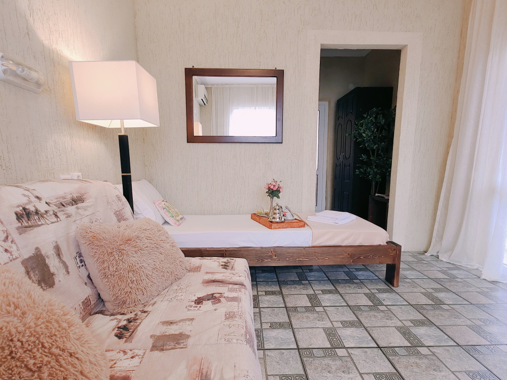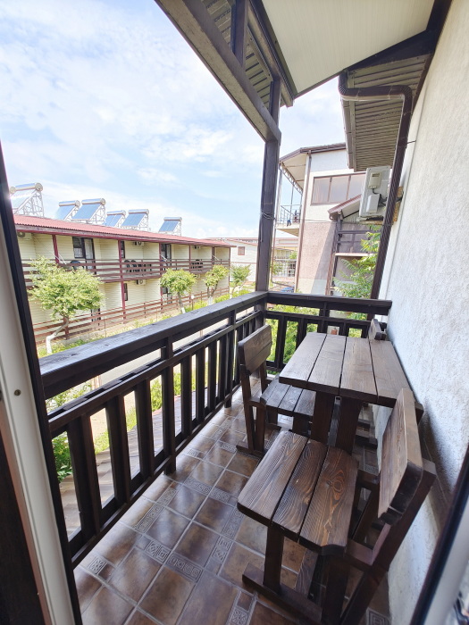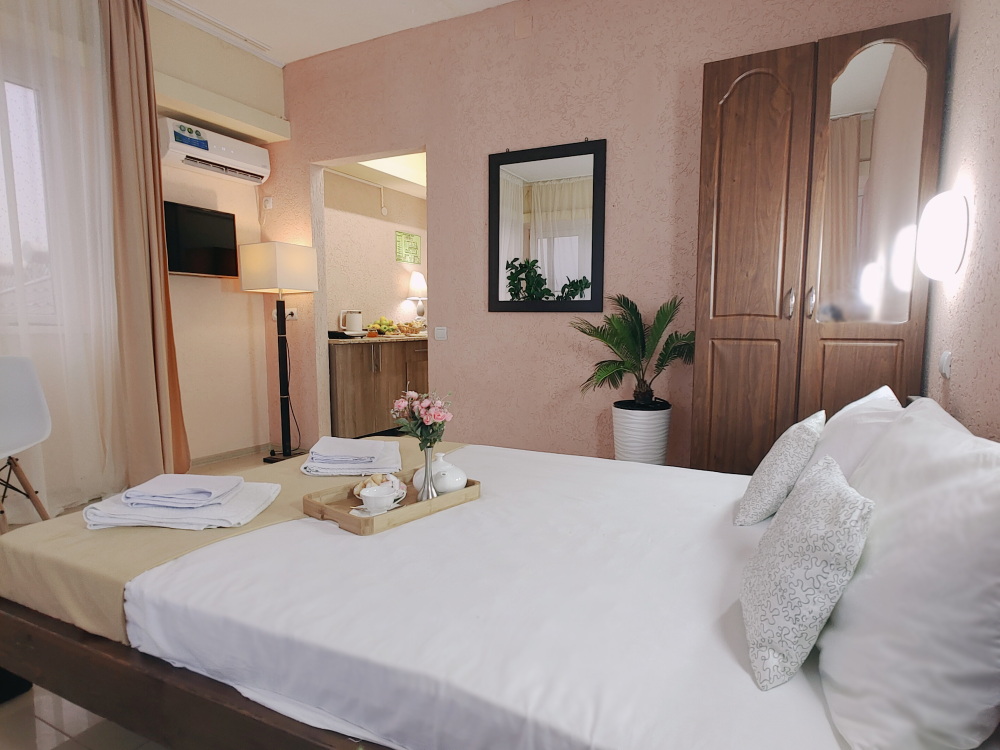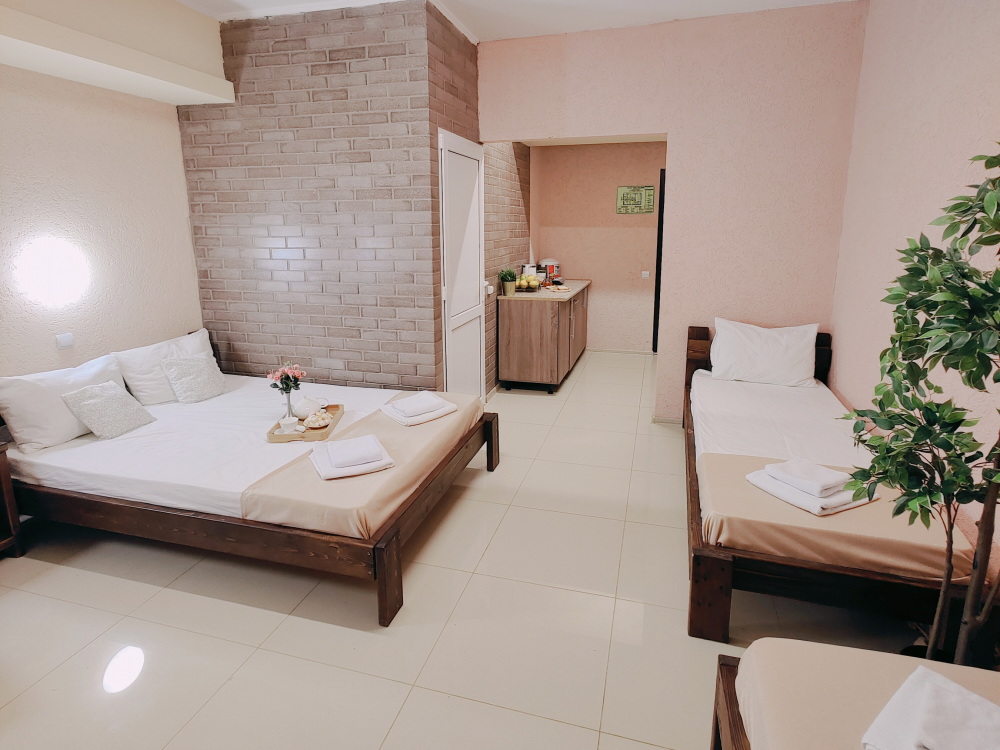 Четырехместный номер-студия с мини-кухней, с большой индивидуальной террасой и видом на море. Номер оснащён: двуспальная кровать и две односпальные кровати, прикроватные тумбочки, шкаф, телевизор, кондиционер. Мини-кухня: стол тумба, мини-холодильник, одноконфорочная индукционная плита, чайник, посуда (столовые приборы, кружки, тарелки, кастрюля, сковорода).