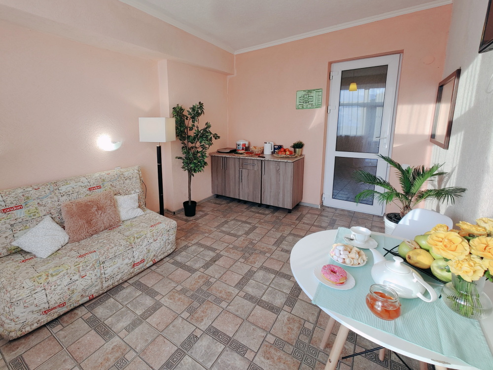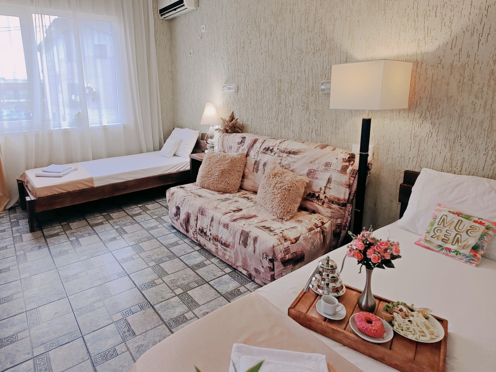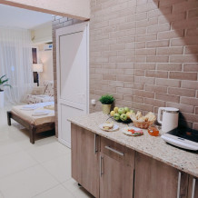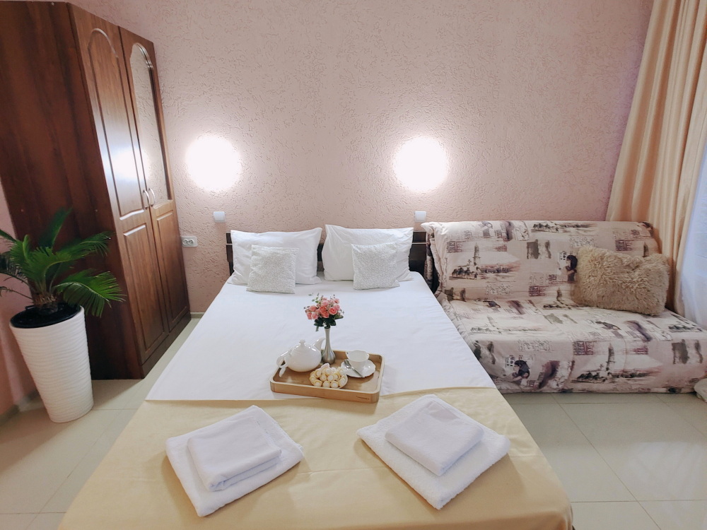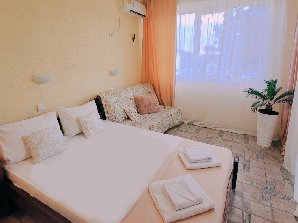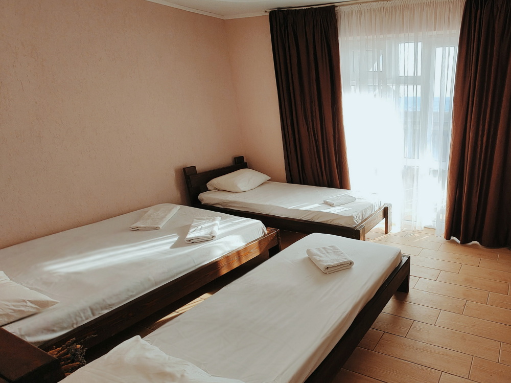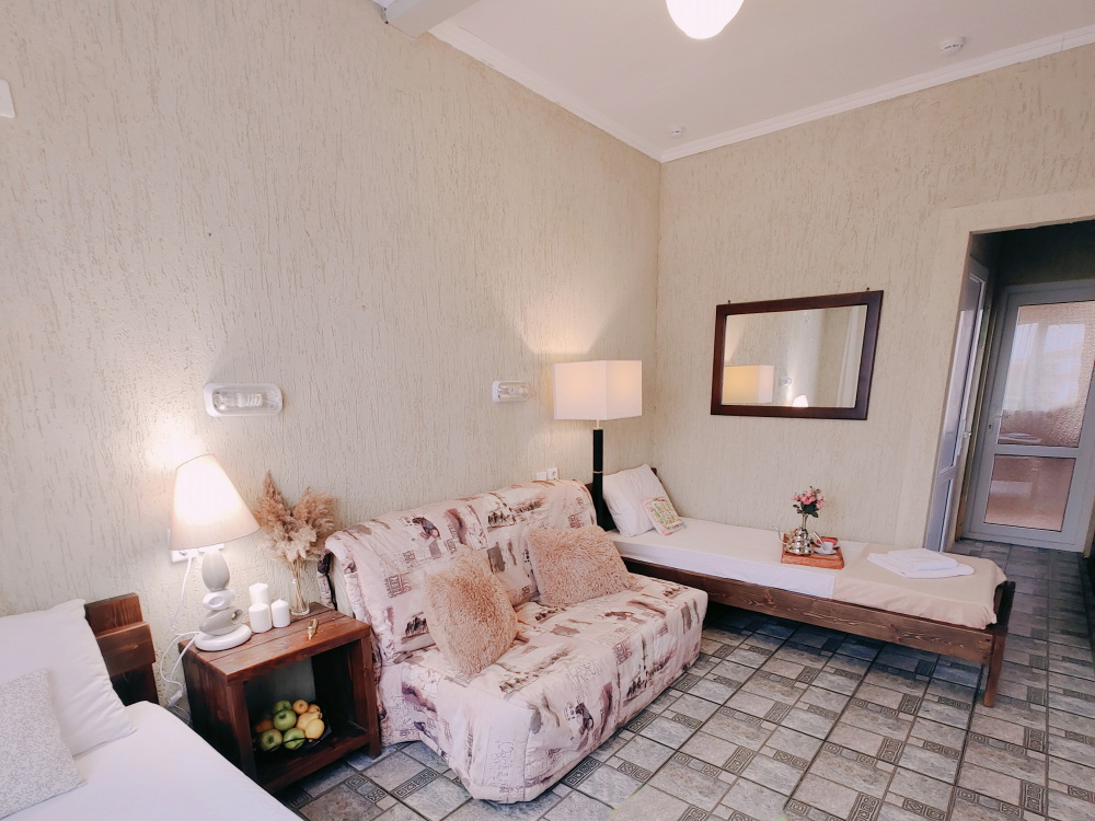Четырехместный номер-студия с мини-кухней, с большой индивидуальной террасой и видом на море. Номер оснащён: двуспальная кровать и две односпальные кровати, прикроватные тумбочки, шкаф, телевизор, кондиционер. Мини-кухня: стол тумба, мини-холодильник, одноконфорочная индукционная плита, чайник, посуда (столовые приборы, кружки, тарелки, кастрюля, сковорода).