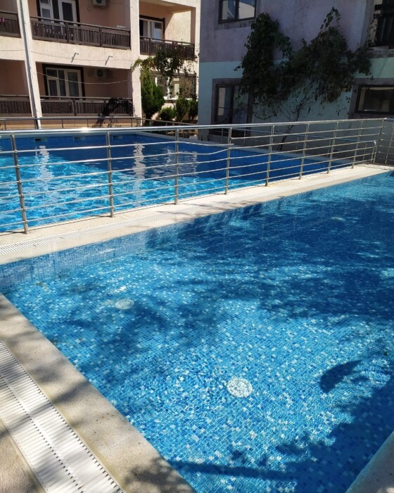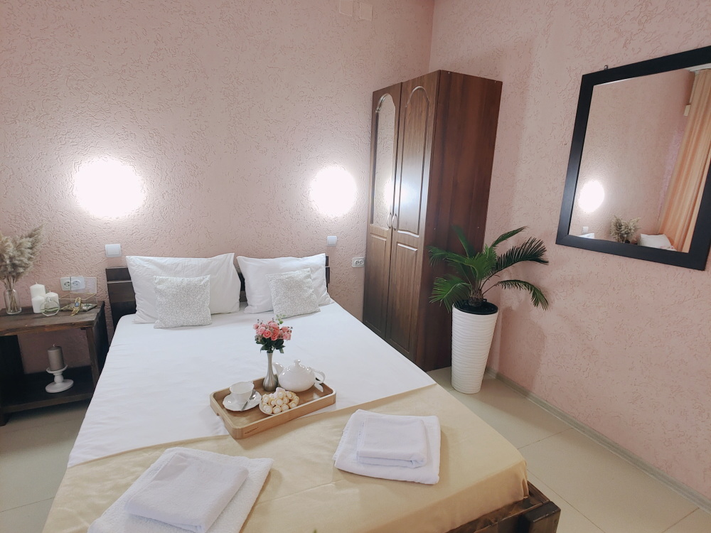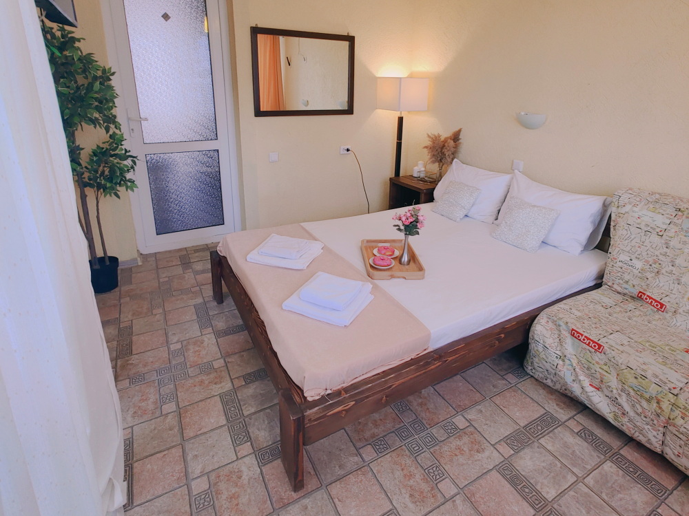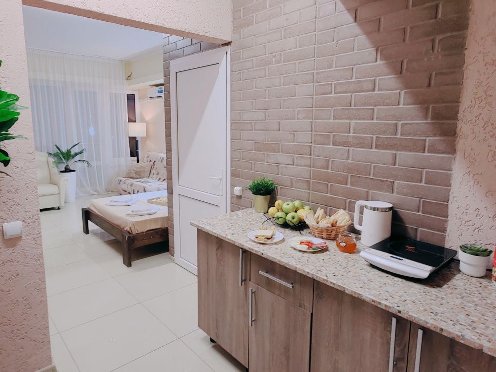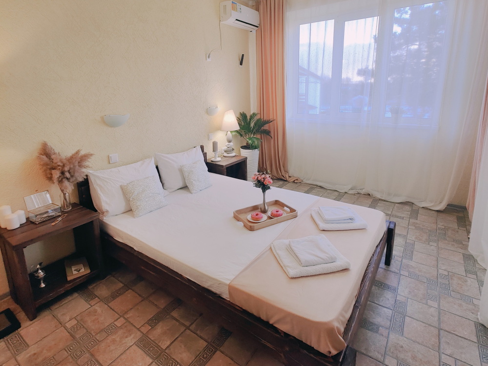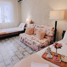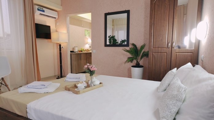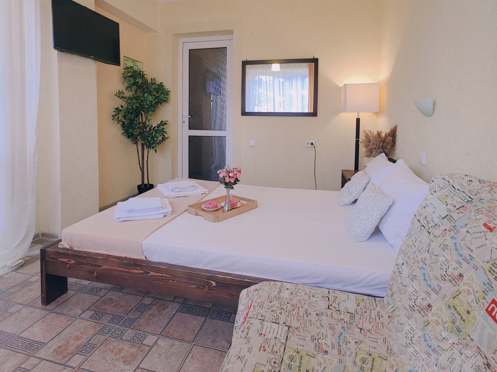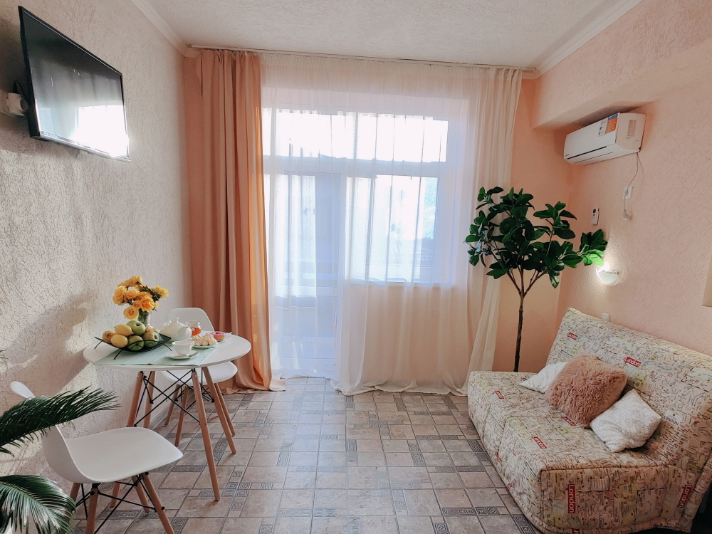 Четырехместный номер-студия с мини-кухней, с большой индивидуальной террасой и видом на море. Номер оснащён: двуспальная кровать и две односпальные кровати, прикроватные тумбочки, шкаф, телевизор, кондиционер. Мини-кухня: стол тумба, мини-холодильник, одноконфорочная индукционная плита, чайник, посуда (столовые приборы, кружки, тарелки, кастрюля, сковорода).