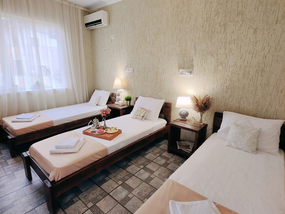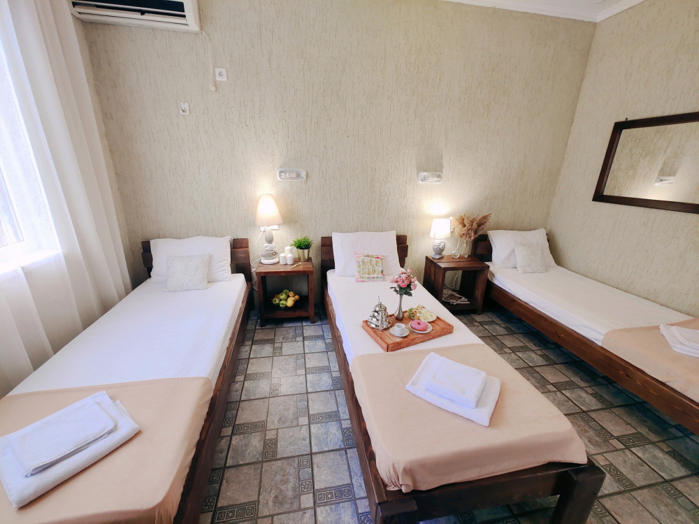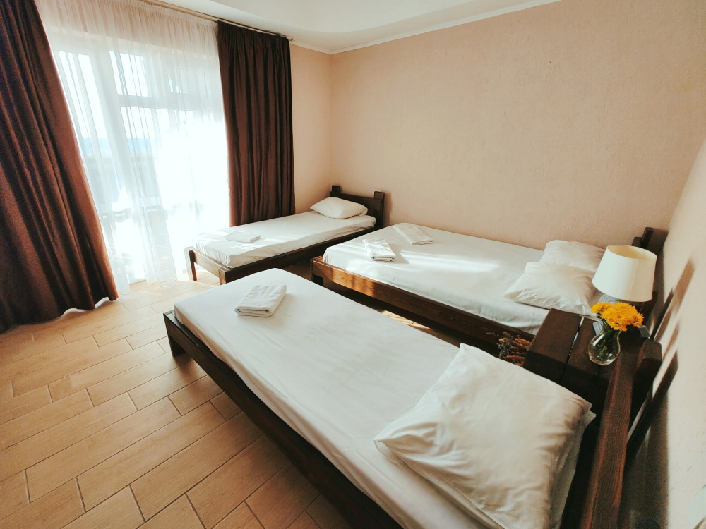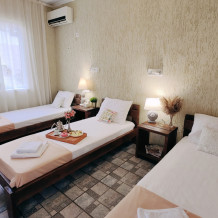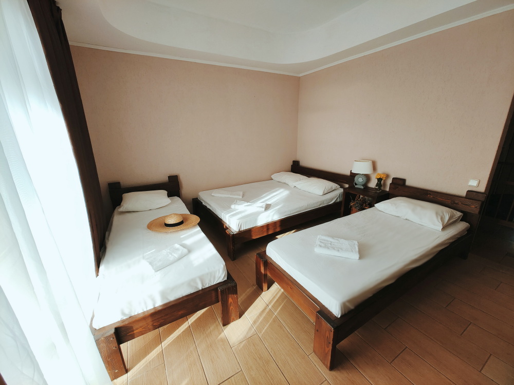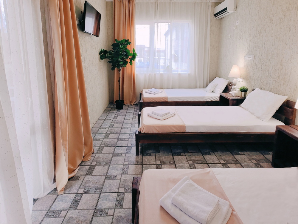 Номер оснащен: двуспальная кровать и односпальная кровать или три односпальные кровати, шкаф, телевизор, кондиционер, мини-холодильник, чайник.