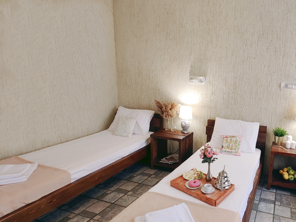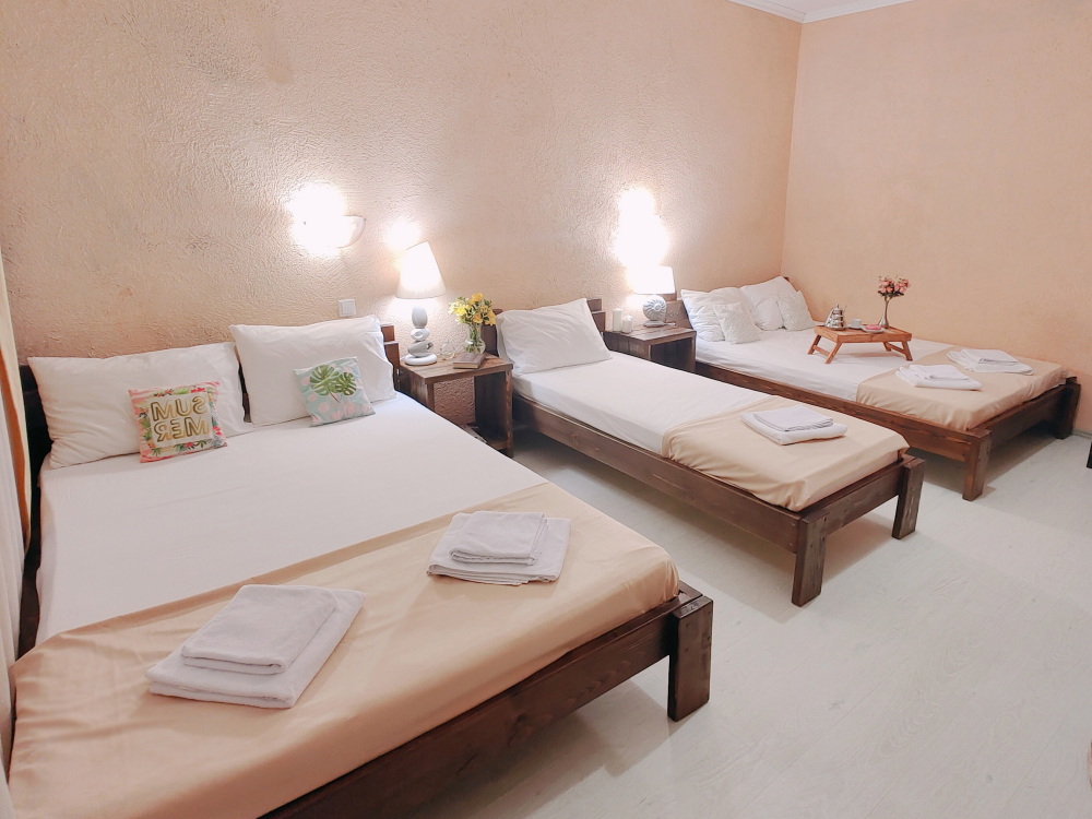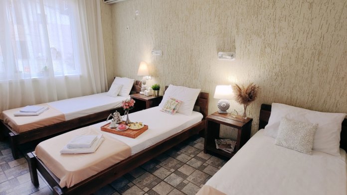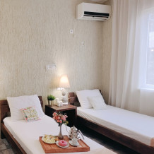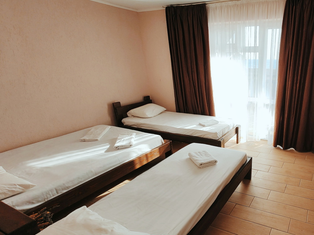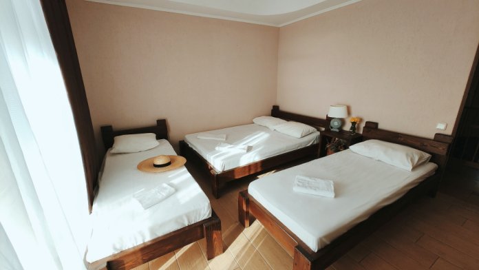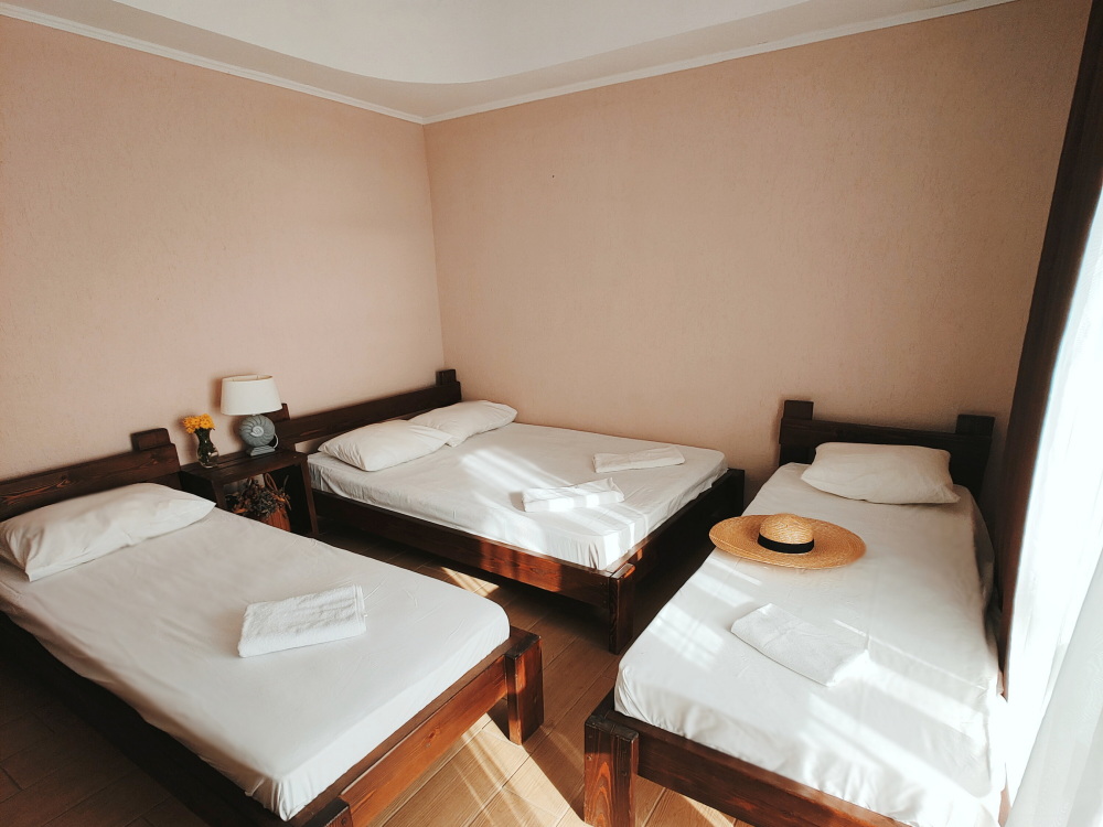 Номер оснащен: двуспальная кровать и односпальная кровать или три односпальные кровати, шкаф, телевизор, кондиционер, мини-холодильник, чайник.