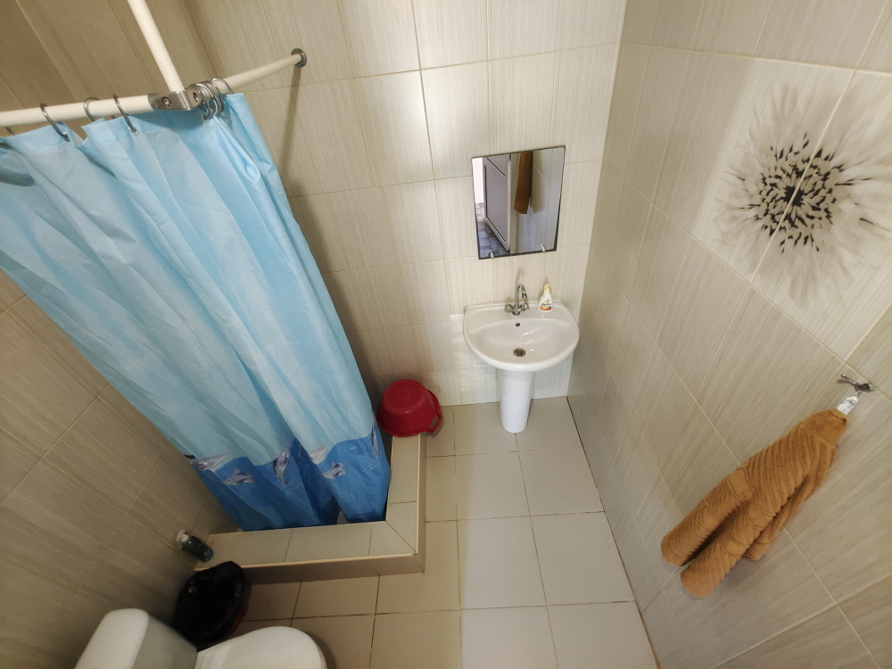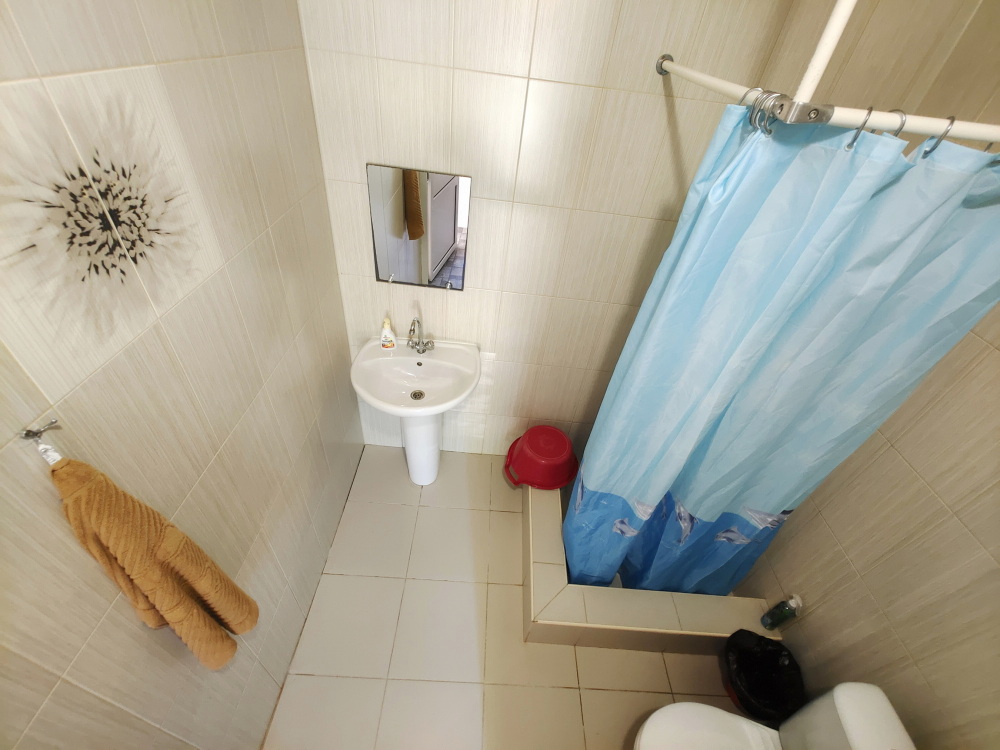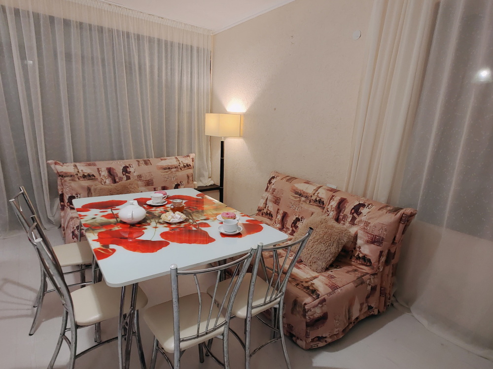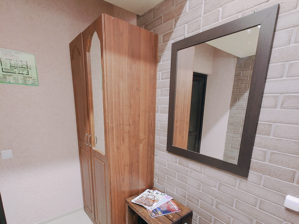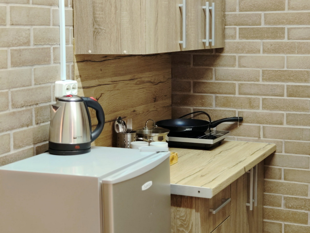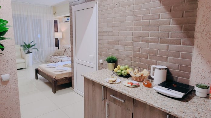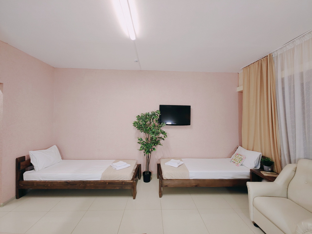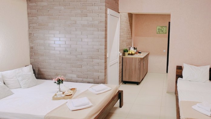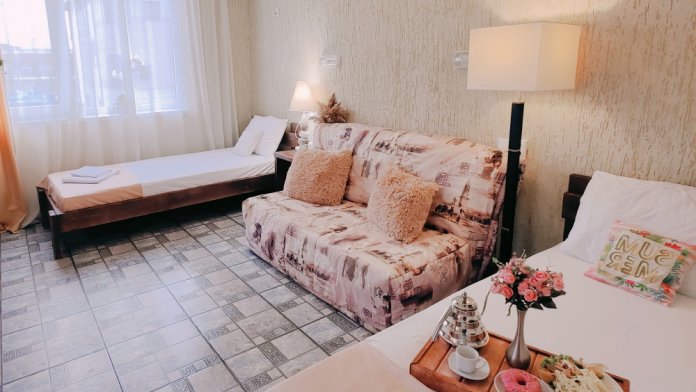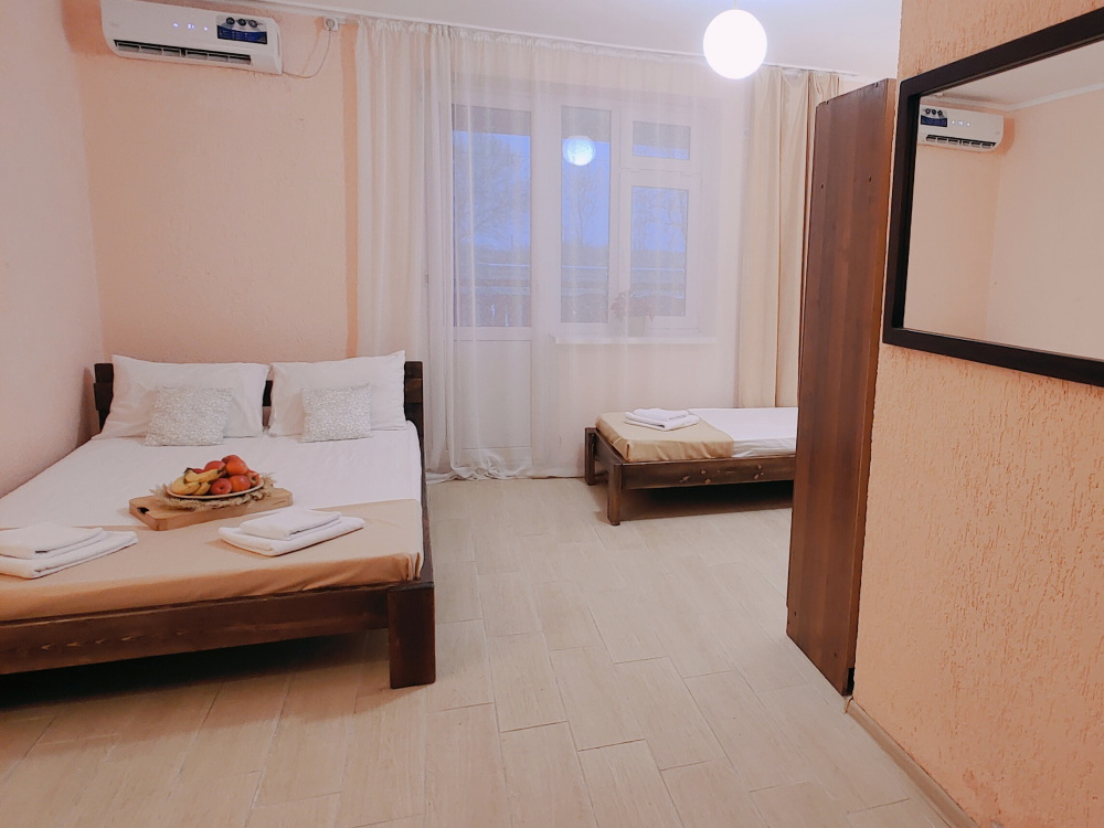 Шестиместный однокомнатный номер-студия с мини-кухней и балконом: двухспальная и две односпальные кровати, диван-кровать, прикроватные тумбочки, шкаф, телевизор, кондиционер. Мини-кухня: стол тумба, мини-холодильник, одноконфорочная индукционная плита, чайник, посуда (столовые приборы, кружки, тарелки, кастрюля, сковорода).