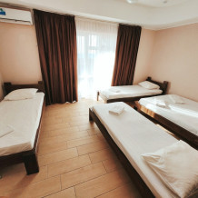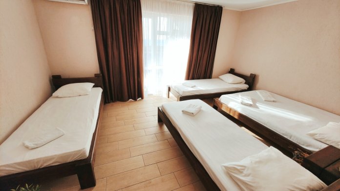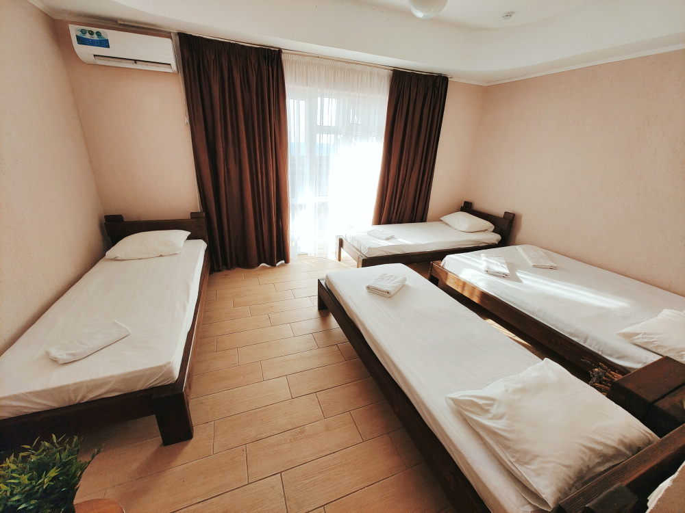 Четырехместный номер оснащен: двуспальная и две односпальные кровати, шкаф, телевизор, кондиционер, мини-холодильник, чайник.