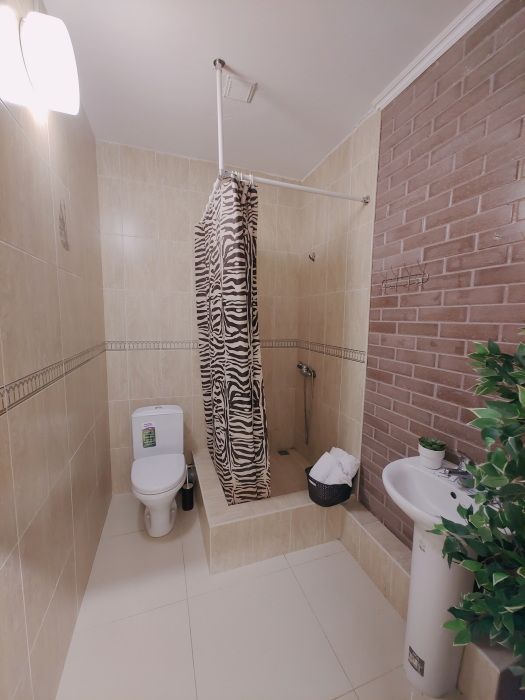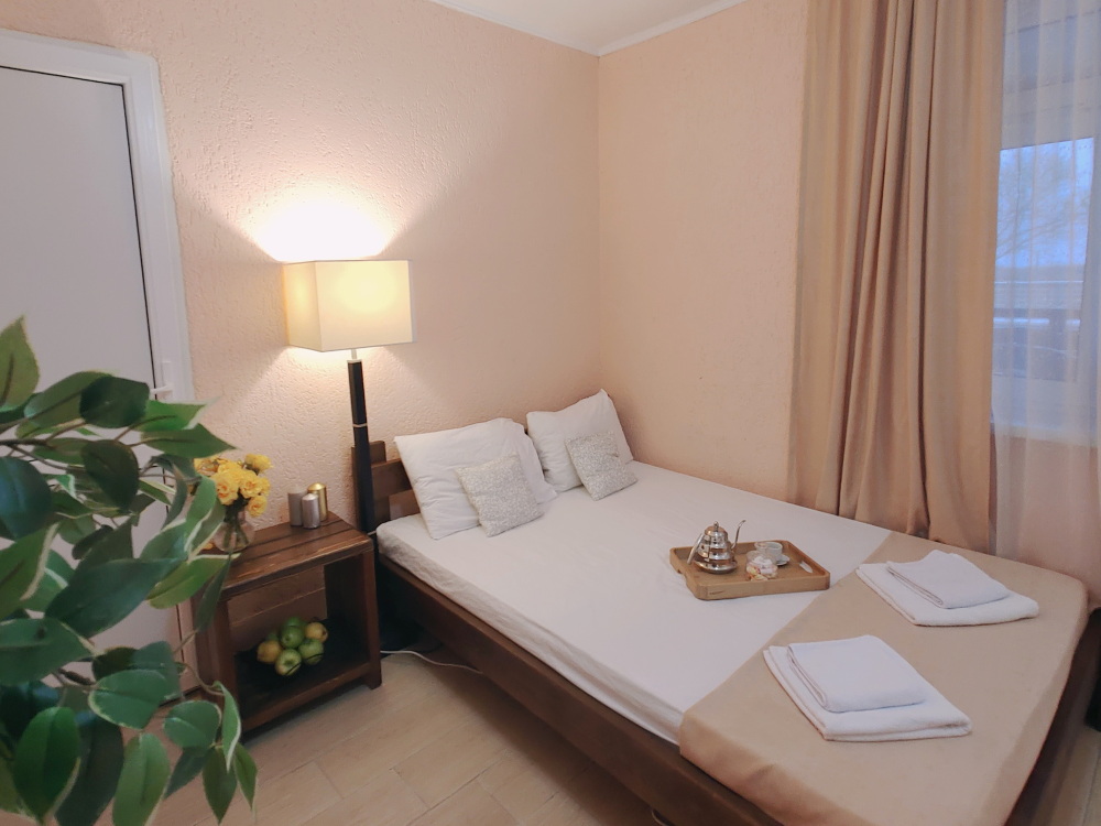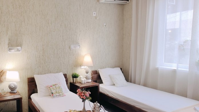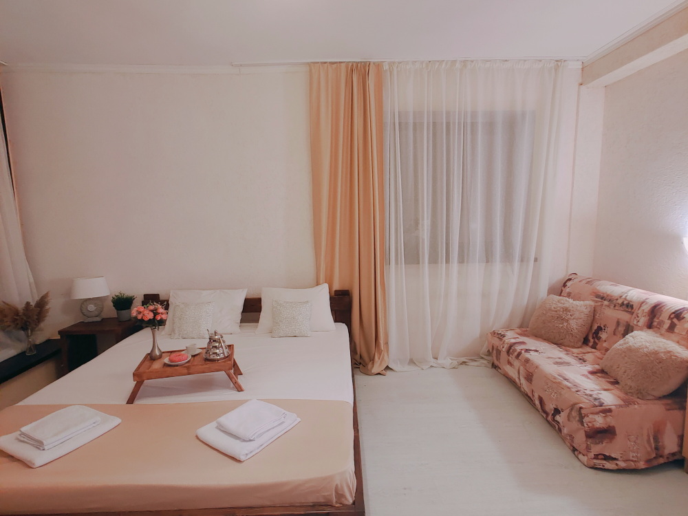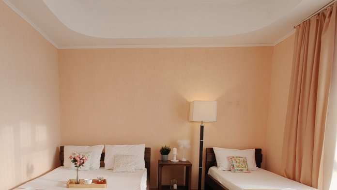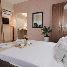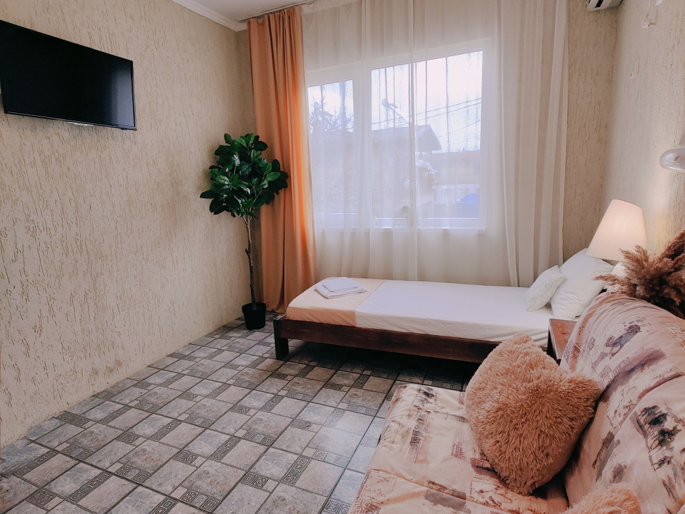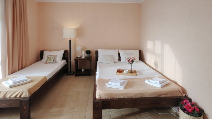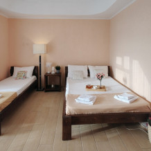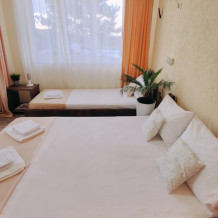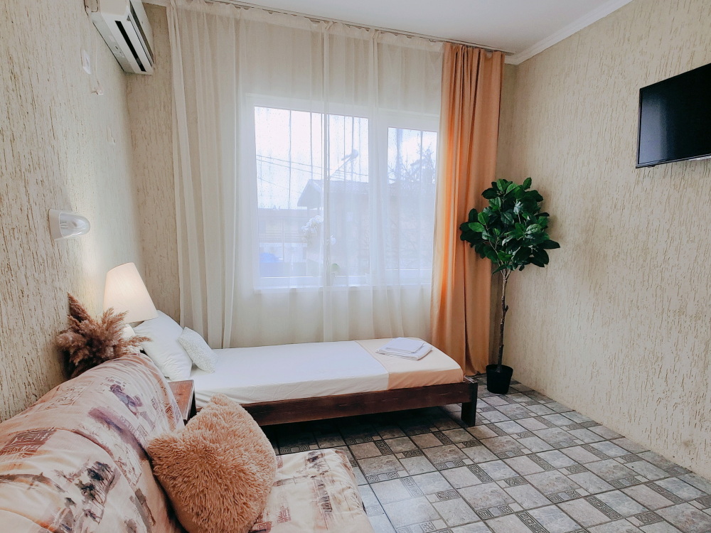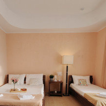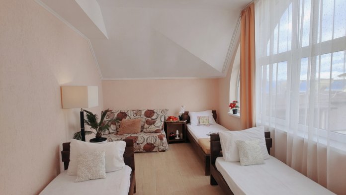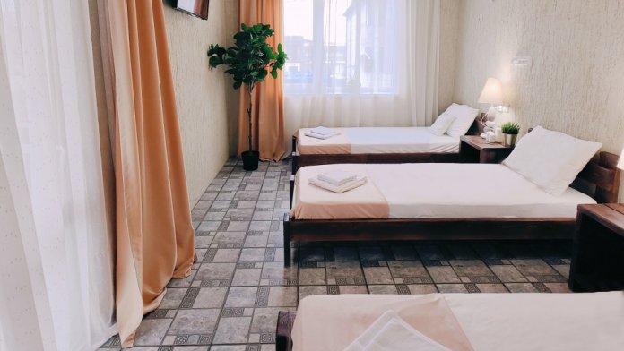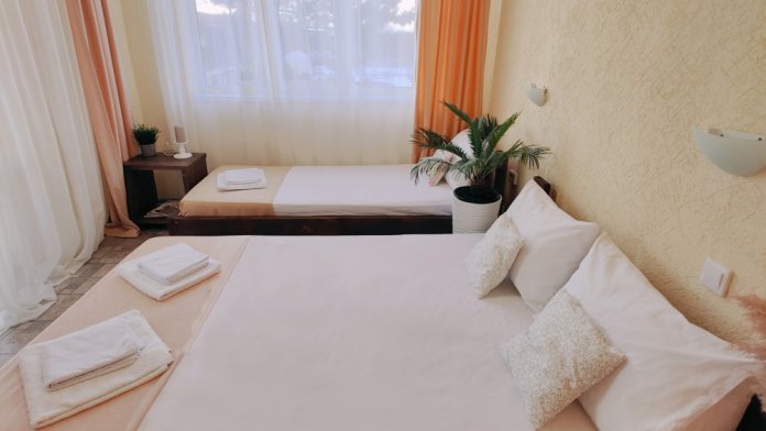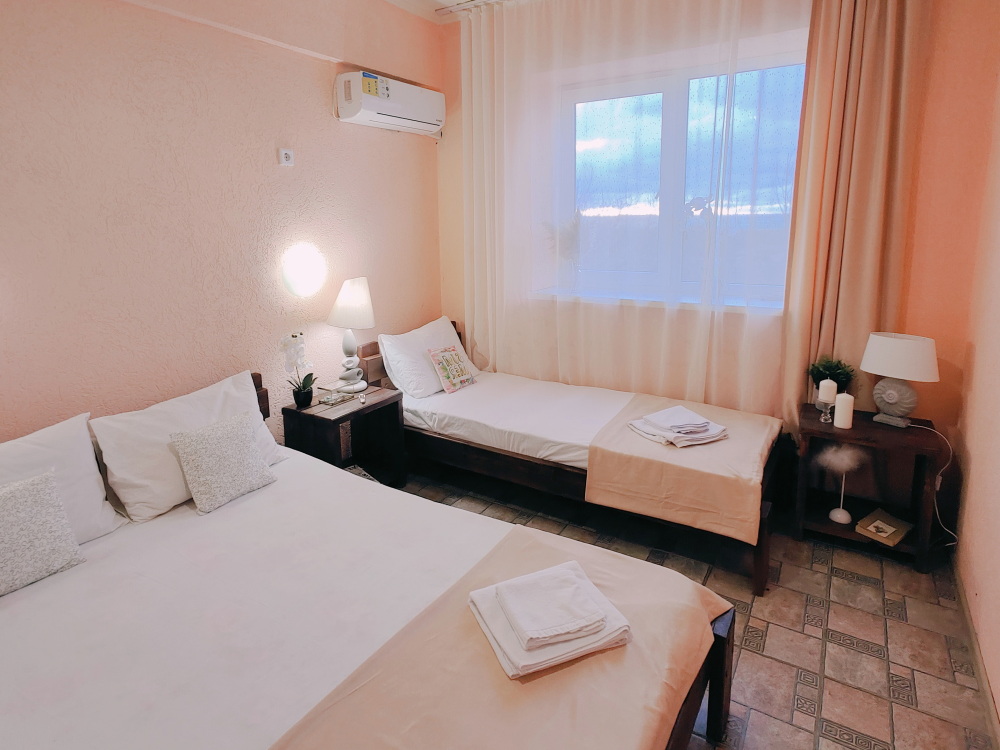Номер оснащен: двуспальная кровать и односпальная кровать ,шкаф, телевизор, кондиционер, мини-холодильник, чайник.