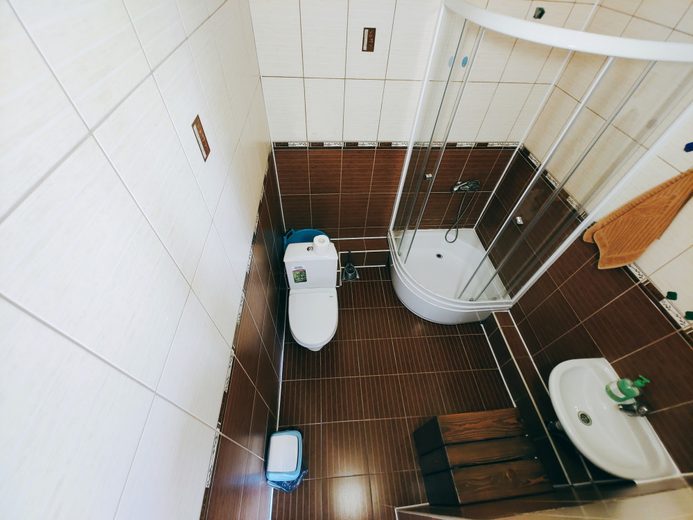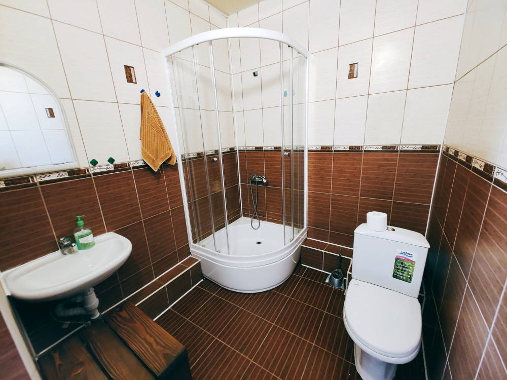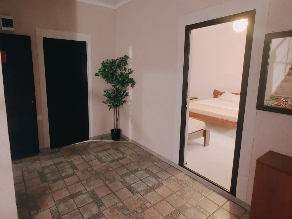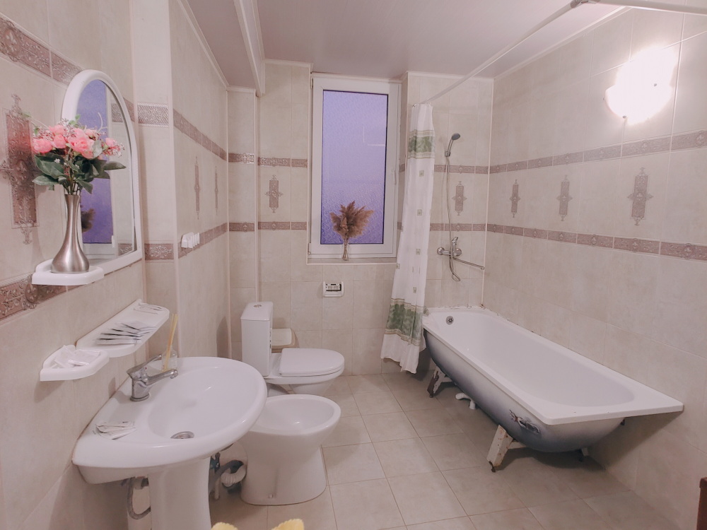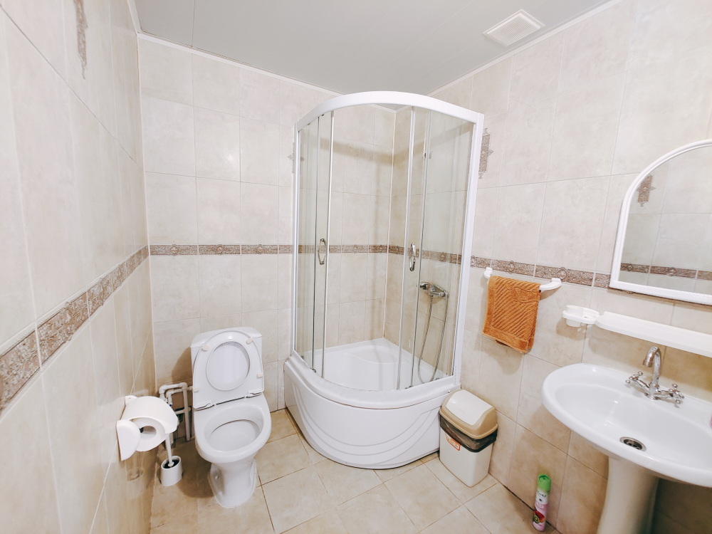 Трехкомнатный номер с мини-кухней. Кухня-гостиная: диван-кровать, обеденная зона, мини-кухня( стол тумба, мини-холодильник, одноконфорочная индукционная плита, чайник, посуда (столовые приборы, кружки, тарелки, кастрюля, сковорода)). Спальня 1: двуспальная кровать, диван-кровать, напольная вешалка для одежды, телевизор, кондиционер. Спальня 2: двуспальная кровать, односпальная кровать, напольная вешалка для одежды, телевизор, кондиционер. Ванная комната: ванная, туалет, раковина. В каждой спальне имеется балкон.