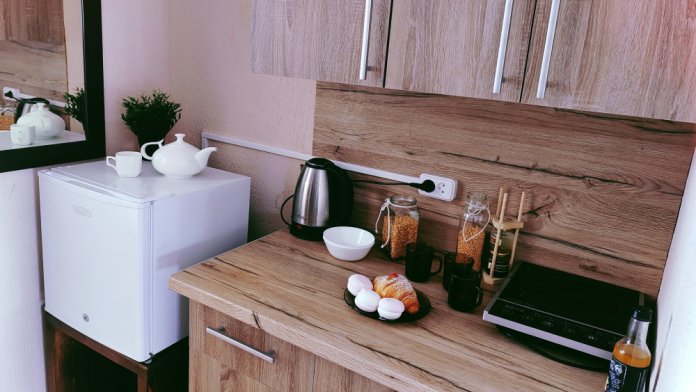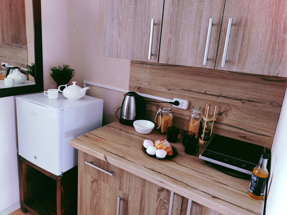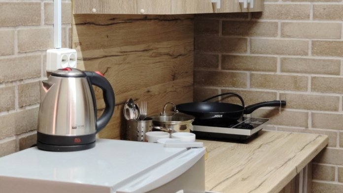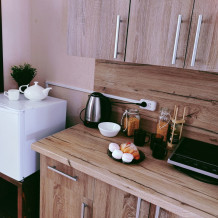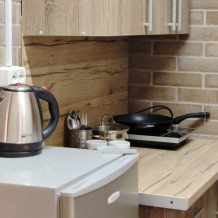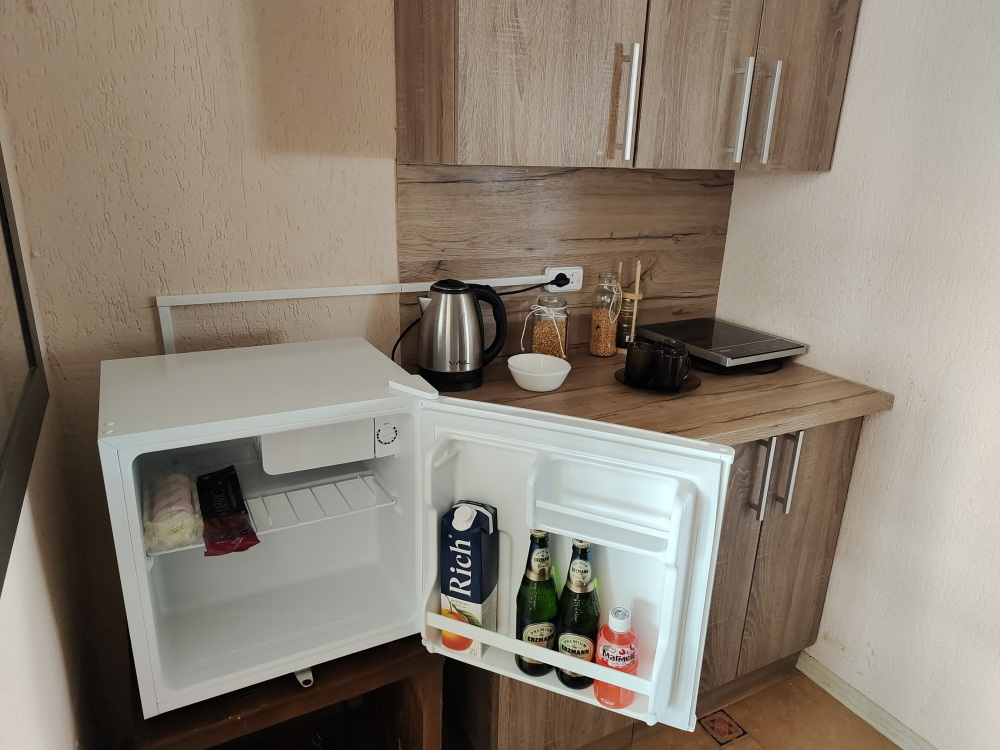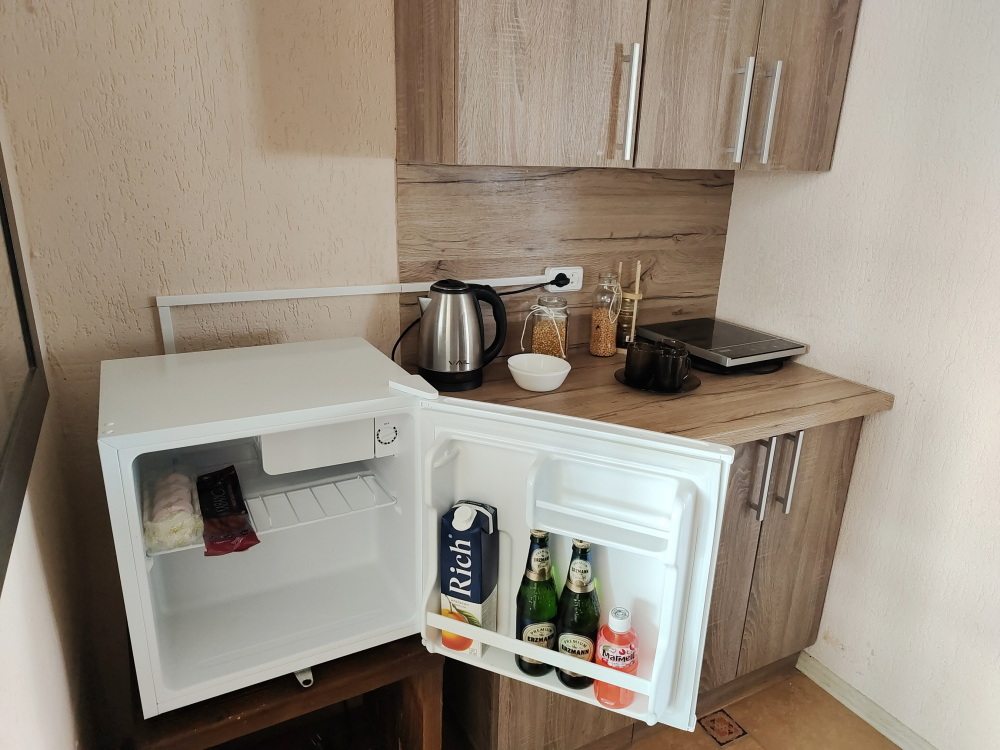 Номер оснащён: двуспальная кровать или две односпальные кровати, шкаф, телевизор, кондиционер. Мини-кухня: стол тумба, мини-холодильник, одноконфорочная индукционная плита, чайник, посуда (столовые приборы, кружки, тарелки, кастрюля, сковорода).