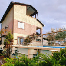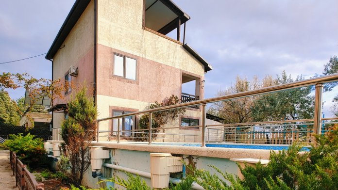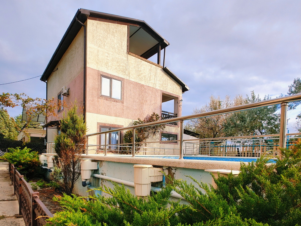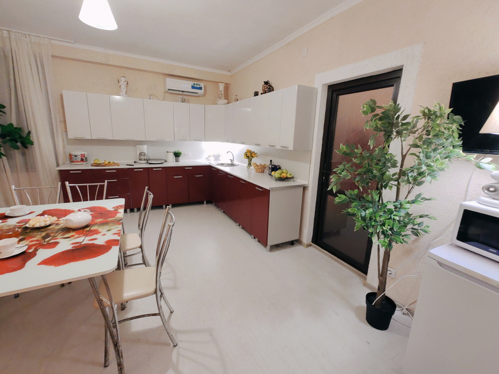 1этаж:Кухня-гостиная:холодильник,плита,микроволновая печь,чайник,необходимая для комфортного проживания посуда,обеденная группа,диван-кровать-2шт,телевизор.1спальня:две двуспальные кровати и односпальная кровать.2этаж:2спальня:двуспальная кровать,две односпальные кровати.3спальня: двуспальная кровать,диван-кровать-2шт.Ванная комната:ванная,биде,туалет,раковина,стиральная машина.А так же есть отдельный сан.узел.Небольшой двориком с зоной отдыха и летней мебелью.На втором этаже балкон с видом на море.На третьем этаже терраса с панорамным видом на море,с летней мебелью.