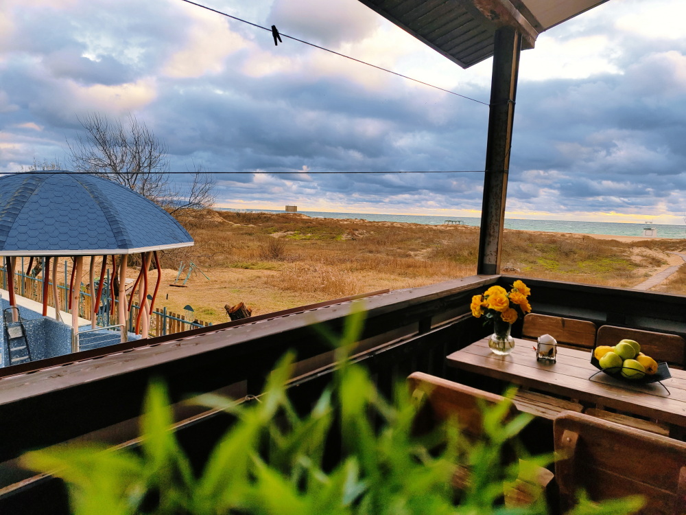 Панорамный вид на море с просторный террасы. На террасе имеется мебель для отдыха (стол, стулья, кресло-кокон.