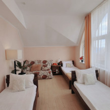 Двухкомнатный номер с мини-кухней и зоной отдыха. В номере имеется шкаф, кондиционер, телевизор. Мини-кухня: стол тумба, мини-холодильник, одноконфорочная индукционная плита, чайник, посуда (столовые приборы, кружки, тарелки, кастрюля, сковорода). Изолированные спальни. Спальня 1: три односпальные кровати. Спальня 2: две двуспальные кровати.