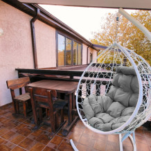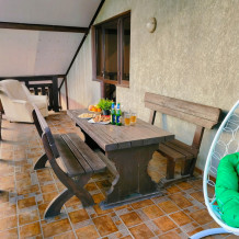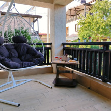 Терраса видом на территорию отеля, мебелью для отдыха ( стол, стулья) и кресло-кокон.