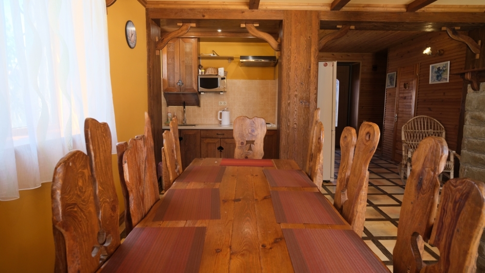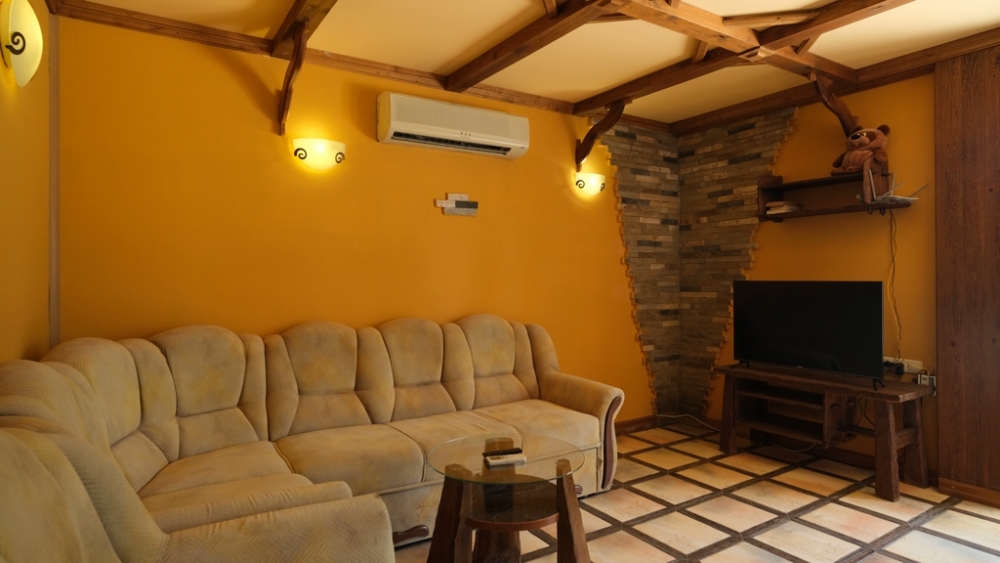На первом этаже гостиная и кухня - столовая. Камин на дровах. Санузел с душевой кабиной, биде. В гостиной диван, столик, телевизор, цифровое тв, интернет. Cтиральная машина-автомат.